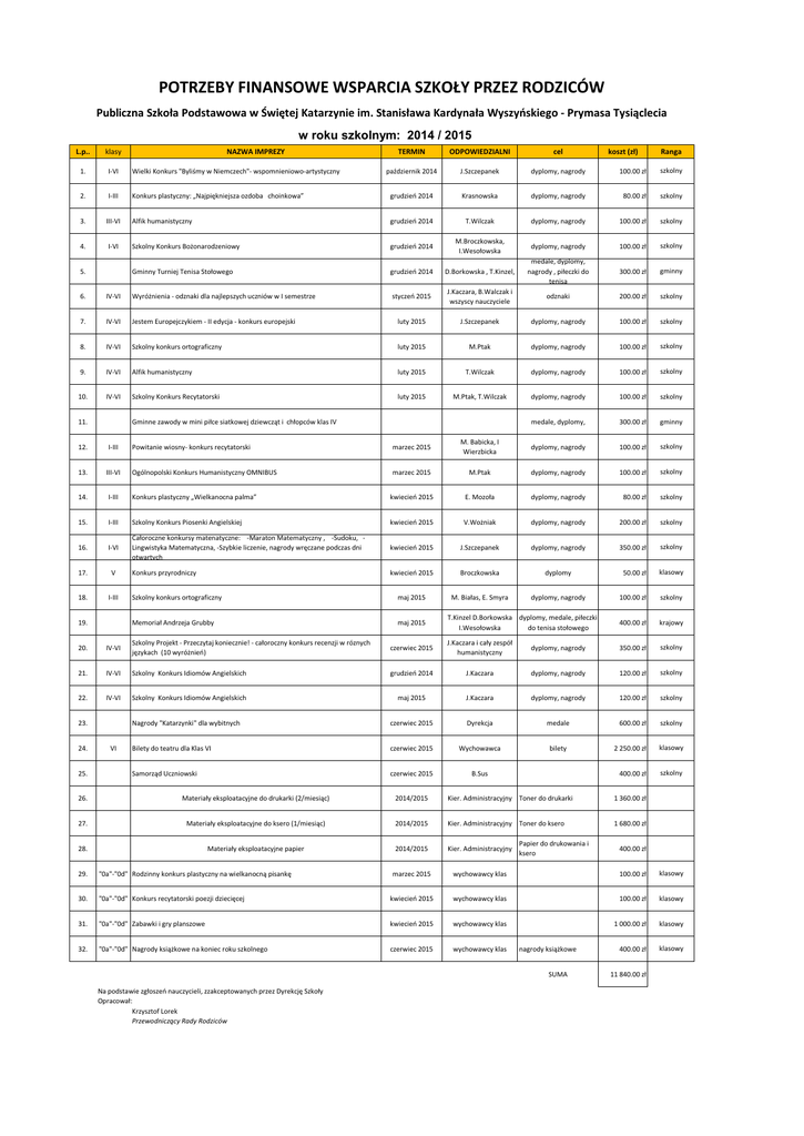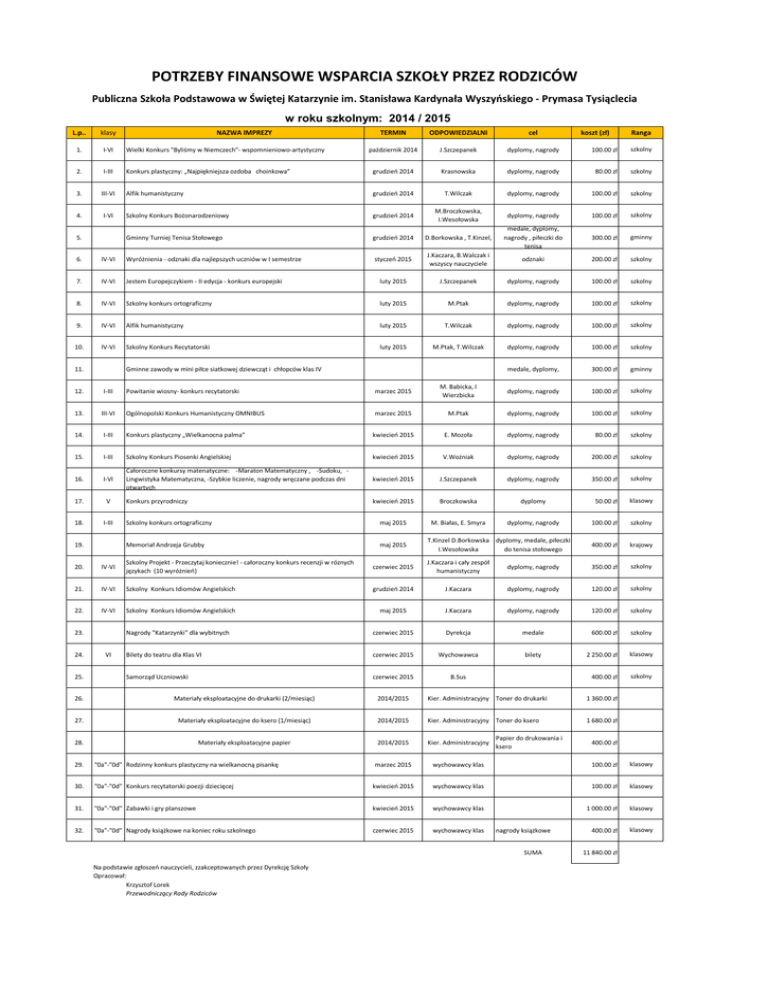 POTRZEBY FINANSOWE WSPARCIA SZKOŁY PRZEZ RODZICÓW Publiczna Szkoła Podstawowa w Świętej Katarzynie im. Stanisława Kardynała Wyszyńskiego - Prymasa Tysiąclecia w roku szkolnym: 2014 / 2015 L.p.. klasy 1. I-VI Wielki Konkurs "Byliśmy w Niemczech"- wspomnieniowo-artystyczny 2. I-III 3. 4. koszt (zł) Ranga TERMIN ODPOWIEDZIALNI cel październik 2014 J.Szczepanek dyplomy, nagrody 100.00 zł szkolny Konkurs plastyczny: „Najpiękniejsza ozdoba choinkowa” grudzień 2014 Krasnowska dyplomy, nagrody 80.00 zł szkolny III-VI Alfik humanistyczny grudzień 2014 T.Wilczak dyplomy, nagrody 100.00 zł szkolny I-VI Szkolny Konkurs Bożonarodzeniowy grudzień 2014 M.Broczkowska, I.Wesołowska dyplomy, nagrody 100.00 zł szkolny 300.00 zł gminny 5. NAZWA IMPREZY Gminny Turniej Tenisa Stołowego grudzień 2014 D.Borkowska , T.Kinzel, medale, dyplomy, nagrody , piłeczki do tenisa styczeń 2015 J.Kaczara, B.Walczak i wszyscy nauczyciele odznaki 200.00 zł szkolny 6. IV-VI Wyróżnienia - odznaki dla najlepszych uczniów w I semestrze 7. IV-VI Jestem Europejczykiem - II edycja - konkurs europejski luty 2015 J.Szczepanek dyplomy, nagrody 100.00 zł szkolny 8. IV-VI Szkolny konkurs ortograficzny luty 2015 M.Ptak dyplomy, nagrody 100.00 zł szkolny 9. IV-VI Alfik humanistyczny luty 2015 T.Wilczak dyplomy, nagrody 100.00 zł szkolny 10. IV-VI Szkolny Konkurs Recytatorski luty 2015 M.Ptak, T.Wilczak dyplomy, nagrody 100.00 zł szkolny medale, dyplomy, 300.00 zł gminny 11. Gminne zawody w mini piłce siatkowej dziewcząt i chłopców klas IV 12. I-III Powitanie wiosny- konkurs recytatorski marzec 2015 M. Babicka, I Wierzbicka dyplomy, nagrody 100.00 zł szkolny 13. III-VI Ogólnopolski Konkurs Humanistyczny OMNIBUS marzec 2015 M.Ptak dyplomy, nagrody 100.00 zł szkolny 14. I-III Konkurs plastyczny „Wielkanocna palma” kwiecień 2015 E. Mozoła dyplomy, nagrody 80.00 zł szkolny 15. I-III Szkolny Konkurs Piosenki Angielskiej kwiecień 2015 V.Wożniak dyplomy, nagrody 200.00 zł szkolny 16. I-VI Całoroczne konkursy matenatyczne: -Maraton Matematyczny , -Sudoku, Lingwistyka Matematyczna, -Szybkie liczenie, nagrody wręczane podczas dni otwartych kwiecień 2015 J.Szczepanek dyplomy, nagrody 350.00 zł szkolny 17. V Konkurs przyrodniczy kwiecień 2015 Broczkowska dyplomy 50.00 zł klasowy 18. I-III M. Białas, E. Smyra dyplomy, nagrody 19. Szkolny konkurs ortograficzny maj 2015 Memoriał Andrzeja Grubby maj 2015 100.00 zł szkolny T.Kinzel D.Borkowska dyplomy, medale, piłeczki I.Wesołowska do tenisa stołowego 400.00 zł krajowy 20. IV-VI Szkolny Projekt - Przeczytaj koniecznie! - całoroczny konkurs recenzji w róznych językach (10 wyróżnień) czerwiec 2015 J.Kaczara i cały zespół humanistyczny dyplomy, nagrody 350.00 zł szkolny 21. IV-VI Szkolny Konkurs Idiomów Angielskich grudzień 2014 J.Kaczara dyplomy, nagrody 120.00 zł szkolny 22. IV-VI Szkolny Konkurs Idiomów Angielskich maj 2015 J.Kaczara dyplomy, nagrody 120.00 zł szkolny Nagrody "Katarzynki" dla wybitnych czerwiec 2015 Dyrekcja medale 600.00 zł szkolny Bilety do teatru dla Klas VI czerwiec 2015 Wychowawca bilety 2 250.00 zł klasowy Samorząd Uczniowski czerwiec 2015 B.Sus 400.00 zł szkolny 23. 24. 25. VI 26. Materiały eksploatacyjne do drukarki (2/miesiąc) 2014/2015 Kier. Administracyjny Toner do drukarki 1 360.00 zł 27. Materiały eksploatacyjne do ksero (1/miesiąc) 2014/2015 Kier. Administracyjny Toner do ksero 1 680.00 zł 2014/2015 Papier do drukowania i Kier. Administracyjny ksero 28. Materiały eksploatacyjne papier 400.00 zł marzec 2015 wychowawcy klas 100.00 zł klasowy "0a"-"0d" Konkurs recytatorski poezji dziecięcej kwiecień 2015 wychowawcy klas 100.00 zł klasowy 31. "0a"-"0d" Zabawki i gry planszowe kwiecień 2015 wychowawcy klas 1 000.00 zł klasowy 32. "0a"-"0d" Nagrody książkowe na koniec roku szkolnego czerwiec 2015 wychowawcy klas 400.00 zł klasowy 29. "0a"-"0d" Rodzinny konkurs plastyczny na wielkanocną pisankę 30. nagrody książkowe SUMA Na podstawie zgłoszeń nauczycieli, zzakceptowanych przez Dyrekcję Szkoły Opracował: Krzysztof Lorek Przewodniczący Rady Rodziców podpisy: Skarbnik: Przewodniczący Rady Rocziców: Przewodniczący Komisji Rewizyjnej: 11 840.00 zł
