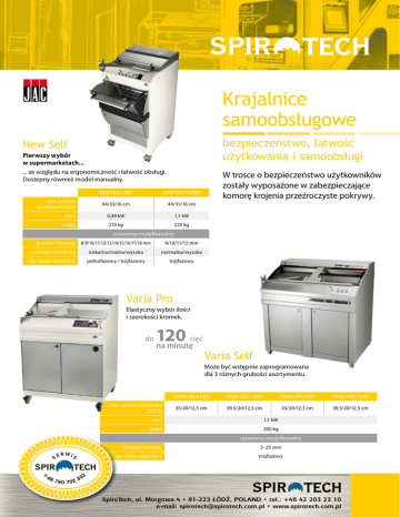 Krajalnice samoobsługowe bezpieczeństwo, łatwość użytkowania i samoobsługi New Self Pierwszy wybór w supermarketach... ... ze względu na ergonomiczność i łatwość obsługi. Dostepny również model manualny. NEW SELF 450 NEW SELF 450M 44/33/16 cm 44/31/16 cm moc 0,49 kW 1,1 kW waga 210 kg 220 kg max. rozmiar bochenka D/S/W W trosce o bezpieczeństwo użytkowników zostały wyposażone w zabezpieczające komorę krojenia przeźroczyste pokrywy. ustawienia modyfikowalne grubość warstwy 8/9/10/11/12/13/14/15/16/17/18 mm 9/10/11/12 mm wysokość bochenka niska/normalna/wysoka normalna/wysoka typ silnika 400/230 V jednofazowy / trójfazowy trójfazowy Varia Pro Elastyczny wybór ilości i szerokości kromek. do 120 cięć na minutę Varia Self Może być wstępnie zaprogramowana dla 3 różnych grubości asortymentu. max. rozmiar bochenka D/S/W VARIA SELF 800 VARIA SELF 1000 VARIA PRO 800 VARIA PRO 1000 35/20/12,5 cm 39,5/20/12,5 cm 35/20/12,5 cm 39,5/20/12,5 cm moc 1,1 kW waga 200 kg ustawienia modyfikowalne grubość warstwy typ silnika 400/230 V 5 -25 mm trójfazowy SpiroTech, ul. Morgowa 4 • 91-223 ŁÓDŹ, POLAND • tel.: +48 42 203 23 10 e-mail: [email protected] • www.spirotech.com.pl Krajalnice nastolne Topmatic Ta w pełni automatyczna krajalnica opiera się na solidnej konstrukcji i bardzo nowoczesnym designie. Pozwala na pokrojenie dwóch chlebów na raz. Dzięki cichej pracy i elementom bezpieczeństwa, może nawet być stosowana bezpośrednio przez klientów. nowoczesne, ergonomiczne i bezpieczne TOPMATIC Krajalnice do małych piekarni i sklepów. Tak kompaktowe, że z łatwością mogą być dopasowane do warunków lokalowych. max. rozmiar bochenka D/S/W 41/18/16 cm moc 0,49 kW waga 96 kg ustawienia modyfikowalne grubość warstwy Pico Pierwszy wybór małych piekarni wśród tradycyjnych krajalnic do chleba. Stołowa krajalnica do chleba, zachwycająca łatwością użycia, jakością krojenia i ergonomią. wysokość bochenka normalna typ silnika 400/230 V jednofazowy/trójfazowy Picomatic Łatwość w użytkowaniu, jakość krojenia, ergonomiczny kształt tej blatowej krajalnicy z pewnością spełni Państwa oczekiwania. PICO 450 PICO 450M PICOMATIC 450 PICOMATIC 450M 44/30/18 cm 44/29/18 cm 44/30/18 cm 44/29/18 cm moc 0,49 kW 1,5 kW 0,49 kW 1,1 kW waga 105 kg 115 kg 105 kg 115 kg max. rozmiar bochenka D/S/W ustawienia modyfikowalne grubość warstwy 2 8/9/10/11/12/13/14/15/16 mm ustawienia modyfikowalne 9/10/11/12/13/14/15/16/17/18 mm 9/10/11/12 mm 9/10/11/12/13/14/15/16/17/18 mm 9/10/11/12 mm wysokość bochenka niska/normalna/wysoka normalna niska/normalna/wysoka normalna typ silnika 400/230 V jednofazowy/trójfazowy trójfazowy jednofazowy/trójfazowy trójfazowy SpiroTech, ul. Morgowa 4 • 91-223 ŁÓDŹ, POLAND • tel.: +48 42 203 23 10 e-mail: [email protected] • www.spirotech.com.pl Duro Krajalnice automatyczne Klasyczna półautomatyczna krajalnica do chleba, najczęściej używana w piekarniach. Krajalnica wyposażona jest w kółka, co umożliwia łatwe jej przemieszczanie. bezpieczne, łatwe do samoobsługi DURO 450 DURO 450M DURO 600 44/31/16 cm 44/30/16 cm 60/31/16 cm moc 0,49 kW 1,5 kW 0,49 kW waga 150 kg 165 kg 175 kg max. rozmiar bochenka D/S/W Krajalnice półautomatyczne i automatyczne najchętniej stosowane w piekarniach. ustawienia modyfikowalne grubość warstwy 9/10/11/12/13/14/ 15/16/17/18 mm 9/10/11/12 mm 11/12/13/14/15/ 16/17/18 mm wysokość bochenka niska/normalna/ wysoka normalna niska/normalna typ silnika 400/230 V jednofazowy/ trójfazowy trójfazowy jednofazowy/ trójfazowy Eco+ Klasyczna krajalnica automatyczna. Posiada dodatkowe przyciski, które pozwalają regulować czas oczekiwania do zadziałania docisku od chwili włożenie chleba, prędkość przesuwu docisku, który przesuwa się ze stałą prędkością z chwilą włączenia maszyny. Szybkość przesuwu docisku automatycznie reguluje się w zależności od rodzaju krojonego chleba – system ISC. Czas krojenia bochenka: ok. 4-6 s. max. rozmiar bochenka D/S/W Chute Ta krajalnica pozwoli zaoszczędzić wiele wysiłku fizycznego. Grawitacyjny podajnik bochenków pomieści od 5 do 7 szt. Opcjonalnie może być wyposażona w dmuchawę do automatycznego otwierania worków. ECO+ 450 ECO+ 450M ECO+ 600 44/31/16 cm 44/31/16 cm 61/32/16 cm CHUTE 450 max. rozmiar bochenka D/W 44/16 cm moc 0,49 kW 1,1 kW 0,49 kW moc 0,49 kW waga 165 kg 175 kg 180 kg waga 230 kg ustawienia modyfikowalne grubość warstwy wysokość bochenka typ silnika 400/230 V od 9 do 18 cm od 8 do 18 cm niska/normalna/ wysoka normalna/ wysoka od 11 do 18 cm niska/normalna jednofazowy/trójfazowy ustawienia modyfikowalne grubość warstwy 11/12/13/14/15/16/17/18 mm wysokość bochenka normalna typ silnika 400/230 V jednofazowy/trójfazowy SpiroTech, ul. Morgowa 4 • 91-223 ŁÓDŹ, POLAND • tel.: +48 42 203 23 10 e-mail: [email protected] • www.spirotech.com.pl 3 Krajalnice przemysłowe wydajne, automatyczne Full Wysoce wydajna krajalnica dla dużych piekarni. Posiada dodatkowe przyciski, które pozwalają regulować czas oczekiwania od chwili włożenie chleba do momentu zadziałania docisku, prędkość przesuwu taśmy podającej, który przesuwa się ze stałą prędkością z chwilą włączenia maszyny. Szybkość przesuwu taśmy można regulować w zależności od rodzaju krojonego chleba. Czas krojenia bochenka: ok. 4-6 s. Model T3 posiada opcję taśmy odbierającej. FULL 520 T2 max. rozmiar bochenka D/W FULL 520 T3 52/16 cm moc 1,1 kW waga 370 kg ustawienia modyfikowalne grubość warstwy Speed Niewielka krajalnica wyposażona w taśmę podającą, która przesuwając się w kierunku noży automatycznie podaje bochenki ułożone jeden za drugim. Posiada rolki dociskowe umieszczone nad taśmą podającą. Prędkość przesuwu taśmy jest regulowana w zależności od rodzaju krojonego chleba. Może zostać wyposażona w dmuchawę do automatycznego otwierania worków na chleb. 9/10/11/12/13/14