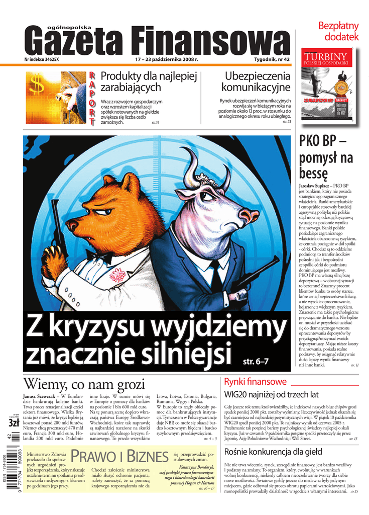 ogólnopolska Nr indeksu 34625X 17 – 23 października 2008 17 – 23 października 2008 r. Tygodnik, nr 42 Produkty dla najlepiej zarabiających Ubezpieczenia komunikacyjne Rynek ubezpieczeń komunikacyjnych rozwija się w bieżącym roku na poziomie około 13 proc. w stosunku do analogicznego okresu roku ubiegłego. Wraz z rozwojem gospodarczym oraz wzrostem kapitalizacji spółek notowanych na giełdzie zwiększa się liczba osób zamożnych. str.19 33 TURBINY POLSKIEJ GOSPODARKI 1 Kolorowy magazyn tygodnika (bezpłatny, wyłącznie do 42. numeru z 17 – 23 października 2008 r.) str. 23 PKO BP – pomysł na bessę Z kryzysu wyjdziemy znacznie silniejsi str. 6–7 Wiemy, co nam grozi (w tym 7 proc. VAT) 3zł Janusz Szewczak – W Eurolandzie bankrutują kolejne banki. Trwa proces renacjonalizacji części sektora finansowego. Wielka Brytania już mówi, że kryzys będzie ją kosztował ponad mld funtów. Niemcy chcą przeznaczyć mld euro, Francja mld euro, Holandia mld euro. Podobnie Ministerstwo Zdrowia przekazało do społecznych uzgodnień projekt rozporządzenia, który nakazuje ustalenie terminu spotkania przedstawiciela medycznego z lekarzem po godzinach jego pracy. inne kraje. W sumie mówi się w Europie o pomocy dla banków na poziomie bln mld euro. Na tę ponurą scenę dopiero wkraczają państwa Europy ŚrodkowoWschodniej, które tak naprawdę są najbardziej narażone na skutki zawirowań globalnego kryzysu finansowego. To przede wszystkim: Litwa, Łotwa, Estonia, Bułgaria, Rumunia, Węgry i Polska. W Europie to rządy obiecały pomoc dla bankrutujących instytucji. Tymczasem w Polsce gwarancje daje NBP, co może się okazać bardzo kosztownym błędem i bardzo ryzykownym przedsięwzięciem. str. – się przeprowadzić postulowanych zmian. Chociaż założenie ministerstwa miało służyć ochronie pacjenta, należy zauważyć, że za pomocą krajowego rozporządzenia nie da Katarzyna Bondaryk, szef praktyki prawa farmaceutycznego i biotechnologii kancelarii prawnej Hogan & Hartson str. – Jarosław Supłacz – PKO BP jest bankiem, który nie posiada strategicznego zagranicznego właściciela. Banki amerykańskie i europejskie stosowały bardziej agresywną politykę niż polskie stąd mocniej odczują kryzysową sytuację na poziomie wyniku finansowego. Banki polskie posiadające zagranicznego właściciela obarczone są ryzykiem, że centrala pociągnie w dół spółki - córki. Chociaż są to oddzielne podmioty, to transfer środków pośredni jak i bezpośredni ze spółki córki do podmiotu dominującego jest możliwy. PKO BP ma własną silną bazę depozytową – w obecnej sytuacji to bezcenne! Znaczny procent klientów banku to osoby starsze, które cenią bezpieczeństwo lokaty, a nie wysokie oprocentowanie, kojarzone z większym ryzykiem. Znaczenie ma także psychologiczne przywiązanie do banku. Nie będzie on musiał w przyszłości uciekać się do dramatycznego wzrostu oprocentowania depozytów by przyciągnąć/utrzymać swoich depozytariuszy. Mając niższe koszty finansowania, posiada realne podstawy, by osiągnąć relatywnie dużo lepszy wynik finansowy str. niż inne banki. WIG20 najniżej od trzech lat Gdy jeszcze rok temu ktoś twierdziłby, że indeksowi naszych blue chipów grozi spadek poniżej pkt. zostałby wyśmiany. Rzeczywistość jednak okazała się być czarniejsza od najbardziej pesymistycznych wizji. W piątek października WIG spadł poniżej pkt. To najniższy wynik od czerwca r. Przełamanie tak potężnej bariery psychologicznej świadczy najlepiej o skali kryzysu. Już w czwartek października potężne spadki przetoczyły się przez str. Japonię, Azję Południowo-Wschodnią i Wall Street. Rośnie konkurencja dla giełd Nic nie trwa wiecznie, rynek, szczególnie finansowy, jest bardzo wrażliwy i podatny na zmiany. To organizm, który, ewoluując w warunkach wolnej konkurencji, niekiedy całkiem nieoczekiwanie tworzy dla siebie nowe możliwości. Światowe giełdy jeszcze do niedawna były jedynym miejscem, gdzie odbywał się proces obrotu papierami wartościowymi. Jako monopolistki prowadziły działalność w zgodzie z własnymi interesami. str. 2 17 – 23 października 2008 Lech Wałęsa, o Lechu Kaczyńskim wydarzenia PYTANIE TYGODNIA: Czy w związku z konfliktem na linii prezydent – premier czeka nas zmiana konstytucji? Komentarz RYSZARD CZARNECKI Trzy w jednym, czyli katar w Azerbejdżanie Globalizacja spowodowała, że przysłowiowe kichnięcie w Nowym Jorku wywołuje katar w Warszawie i zapalenie oskrzeli w Londynie. Bywa, że wydarzenia decydujące o przyszłości świata odbywają się w tym samym czasie, choć w różnych miejscach. Tak było i tym razem: dosłownie jednego dnia odbyła się kolejna, ale ostatnia telewizyjna debata prezydencka McCain – Obama w USA, szczyt UE w Brukseli i wybory prezydenckie w Azerbejdżanie. To, co stało się w Ameryce miało współdecydować o tym, kto będzie rządził światem. To, co miało miejsce w stolicy Unii było europejską odpowiedzią na kryzys finansowy. To, co na Południowym Kaukazie – miało zdecydować o mapie wpływów nie tylko w regionie, ale szerszej: na terenie dawnego Związku Radzieckiego. Azerbejdżan, nie pierwszy raz, znalazł się w cieniu. Niesłusznie. Bo pierwsze prawo globalizacji mówi: jeśli ktoś kichnie w Baku (Nowym Jorku, Brukseli), to w Warszawie (Moskwie etc.)… A więc nas, Polaków, również dotyczą wybory w pozornie egzotycznym Azerbejdżanie. Choćby dlatego, że to największe i najbogatsze, pełne surowców energetycznych państwo Kaukazu jest terenem zaciętego meczu potęg o wpływy polityczno-ekonomiczne. Uczestnikami tego meczu są USA, Rosja, Turcja, Iran i Unia Europejska. Jeśli UE będzie postępować nierozważnie, np. zbyt krytycznie oceniając władze w Baku, wepchnie Azerbejdżan w ręce Moskwy. A więc zrobi to, co może również uczynić wobec Białorusi, która też stoi pod drogowskazem Wschód –