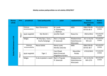 Szkolny zestaw podręczników na rok szkolny 2016/2017 Nazwa szkoły klasa przedmiot Klasa I Język angielski Religia Edukacja wczesnoszkolna Klasa II Szkoła Podstawowa nr 214 Edukacja wczesnoszkolna Język angielski Religia Tytuł podręcznika Nasz Elementarz autor wydawnictwo Numer dopuszczenia MEN ISBN 978-8364735-00-4 Numer nadany 53/zs56/201 5/2016 MEN My World 1 M. Lorek, B. Ochmańska, L. Wallman Jennifer Heath Nowa Era 493/1/2012 54/zs56/201 5/2016 W imię Ojca, i Syna, i Ducha Świętego Red. A. Frączak, R. Szewczyk Wydawnictwo Katechetyczne Warszawa MEN AZ-11-01/10WA-1/Z 55/zs56/201 5/2016 ISBN 978-8364735-38-7 56/zs56/201 5/2016 Macmillan Polska 673/2/2015 57/zs56/201 5/2016 Wydawnictwo Katechetyczne Warszawa AZ-12-01/10WA-2/13 58/zs56/201 5/2016 Nasza Szkoła Maria Lorek, Monika Zatorska Carol Read, Tiger 2 Mark Ormerod, Magdalena Kondro A oto Ja jestem z wami Red. A. Frączak, R. Szewczyk Klasa III Edukacja wczesnoszkolna Gra w kolory + ćwiczenia Praca zbiorowa Wydawnictwo „Juka” Zajęcia komputerowe Lekcje z komputerem 3 J. Brzóska, K.Glinka, K.Hormak WSiP Język angielski Religia Klasa IV Język polski historia Tiger 3 Kto spożywa moje Ciało, ma życie. Carol Read, Mark Ormerod, Magdalena Kondro Red. A. Frączak, R. Szewczyk 87/3/2011 518/3/2014 59/zs56/201 5/2016 60/zs56/201 5/2016 Macmillan Polska 673/3/2016 Wydawnictwo Katechetyczne Warszawa WSiP AZ-13-01/10WA-2/14 551/1/2012/201 5 63/zs56/201 5/2016 61/zs56/201 5/2016 62/zs56/201 5/2016 Słowa z uśmiechem. Literatura i kultura. Klasa 4. Ewa Horwarth, Anita Żegleń Słowa z uśmiechem. Nauka o języku i ortografii. Klasa 4 Historia wokół nas Ewa Horwarth, Anita Żegleń WSiP 551/1/2012/201 5 64/zs56/201 5/2016 Radosław Lolo, Anna Pieńkowska Nick Beare WSiP 434/1/2012/201 5 65/zs56/201 5/2016 Macmillan Polska 675/1/2014/201 5 66/zs56/201 5/2016 Język angielski Evolution plus 1+ ćwiczenia Przyroda Przyrodo, witaj! Matematyka Matematyka wokół nas 4 + ćwiczenia „Lubię To” klasa 4 Zajęcia komputerowe Zajęcia techniczne Muzyka WSiP 530/1/2012 67/zs56/201 5/2016 WSiP 275/1/2010 68/zs56/201 5/2016 Nowa Era 729/1/2015 69/zs56/201 5/2016 Ewa Bubak WSiP 496/1/2012/201 5 70/zs56/201 5/2016 A.Sołtysik, U.Smoczyńska, K. Jakóbczak-Drążek Stanisław Stopczyk, Barbara Neubar WSiP 406/1/2011 71/zs56/201 5/2016 WSiP 440/1/e/2012 72/zs56/201 5/2016 Wydawnictwo Katechetyczne Warszawa WSiP AZ-21-01/10WA-3/13 72/zs56/201 5/2016 551/2/2013 73/zs56/201 5/2016 Plastyka Plastyka klasa 4 Religia Jestem Chrześcijaninem Ks. Mariusz Czyżewski „Słowa z uśmiechem. Literatura i kultura.” „Słowa z uśmiechem. Nauka o języku i ortografii.” cz.I i II Hanna Dobrowolska, Urszula Dobrowolska Język polski Klasa V Technika na co dzień Część 1 i 2 Klucz do muzyki Ewa Gromek, Ewa Kłos, Wawrzyniec Kofta, Ewa Laskowska, Andrzej Melson Helena Lewicka, Marianna Kowalczyk Michał Kęska Przyroda Przyrodo witaj Klasa V Język angielski Evolution plus 2 Ewa Gromek, Ewa Kłos, Wawrzyniec Kofta Nick Beare WSiP 530/2/2013 74/zs56/201 5/2016 Macmillan 675/2/2014 75/zs56/201 5/2016 Historia Historia wokół nas. Historia i społeczeństwo. Podręcznik do kl. V R. Lolo, A. Pieńkowska, R. Towalski WSiP 434/2/2013 76/zs56/201 5/2016 Matematyka Matematyka wokół nas 5 + ćwiczenia Helena Lewicka, Marianna Kowalczyk WSiP 275/2/2010/201 5 77/zs56/201 5/2016 Muzyka Klucz do muzyki 5 A. Sołtysik, U. Smoczyńska, K. Jakóbczak-Drążek WSiP 406/2/2013 78/zs56/201 5/2016 Zajęcia techniczne Karta rowerowa. Bądź bezpieczny na drodze. WSiP 496/1/2012/201 5 79/zs56/201 5/2016 Zajęcia komputerowe Lubię to! 5 Bogumiła Bogacka – Osińska, Danuta Łazuchewicz Michał Kęska Nowa Era 729/2/2016 80/zs56/201 5/2016 Religia Wierzę w Jednego Boga Ks. Mariusz Czyżewski Wydawnictwo Katechetyczne Warszawa AZ-22-01/10WA-3/14 81/zs56/201 5/2016 Wędrując ku dorosłości Teresa Król Rubikon 705/2014 82/zs56/201 5/2016 Tajemnice przyrody + ćwiczenia cz. I i II Atlas Przyroda Joanna Stawarz, Feliks Szlajfer, Anna Kowalczyk Nowa Era 399/3/2014 83/zs56/201 5/2016 Język angielski Evolution Plus 3 Nick Beare Macmillan 675/3/2014 Historia Wczoraj i dziś + ćwiczenia Grzegorz Wojciechowski Nowa Era 443/3/2014 84/zs56/201 5/2016 85/zs56/201 5/2016 Helena Lewicka, Marianna Kowalczyk WSiP 275/3/2014/z1 Matematyka Matematyka wokół nas 6 + ćwiczenia 86/zs56/201 5/2016 Zajęcia techniczne Zajęcia techniczne – część techniczna Urszula Białka, Jerzy Chrabąszcz Operon 384/2/2012/201 3 87/zs56/201 5/2016 Muzyka Klucz do muzyki 6 WSiP 4006/3/2014 88/zs56/201 5/2016 Wychowanie do życia w rodzinie Wędrując ku dorosłości A. Sołtysik, U. Smoczyńska, K. Jakóbczak-Drążek Teresa Król Rubikon 705/2014 Wychowanie do życia w rodzinie Klasa VI Przyroda Religia Wierzę w święty Kościół powszechny Ks. Mariusz Czyżewski Język polski Jutro pójdę w światH. Dobrowolska, podręcznik + ćwiczenia U. Dobrowolska Wydawnictwo Katechetyczne Warszawa WSiP AZ-23-01/10WA-3/14 89/zs56/201 5/2016 417/03/2014 90/zs56/201 5/2016
