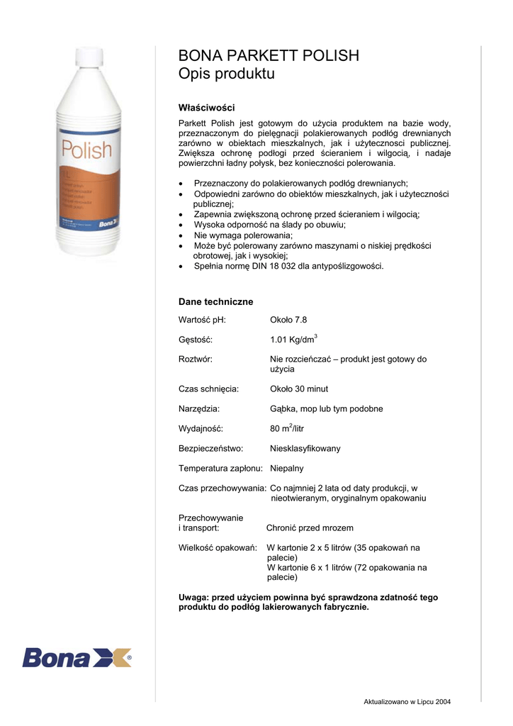BONA PARKETT POLISH Opis produktu Właściwości Parkett Polish jest gotowym do użycia produktem na bazie wody, przeznaczonym do pielęgnacji polakierowanych podłóg drewnianych zarówno w obiektach mieszkalnych, jak i użytecznosci publicznej. Zwiększa ochronę podłogi przed ścieraniem i wilgocią, i nadaje powierzchni ładny połysk, bez konieczności polerowania. • • • • • • • Przeznaczony do polakierowanych podłóg drewnianych; Odpowiedni zarówno do obiektów mieszkalnych, jak i użyteczności publicznej; Zapewnia zwiększoną ochronę przed ścieraniem i wilgocią; Wysoka odporność na ślady po obuwiu; Nie wymaga polerowania; Może być polerowany zarówno maszynami o niskiej prędkości obrotowej, jak i wysokiej; Spełnia normę DIN 18 032 dla antypoślizgowości. Dane techniczne Wartość pH: Około 7.8 Gęstość: 1.01 Kg/dm3 Roztwór: Nie rozcieńczać – produkt jest gotowy do użycia Czas schnięcia: Około 30 minut Narzędzia: Gąbka, mop lub tym podobne Wydajność: 80 m2/litr Bezpieczeństwo: Niesklasyfikowany Temperatura zapłonu: Niepalny Czas przechowywania: Co najmniej 2 lata od daty produkcji, w nieotwieranym, oryginalnym opakowaniu Przechowywanie i transport: Wielkość opakowań: Chronić przed mrozem W kartonie 2 x 5 litrów (35 opakowań na palecie) W kartonie 6 x 1 litrów (72 opakowania na palecie) Uwaga: przed użyciem powinna być sprawdzona zdatność tego produktu do podłóg lakierowanych fabrycznie. Aktualizowano w Lipcu 2004