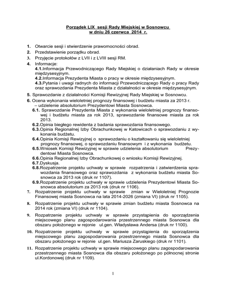 Porządek LIX sesji Rady Miejskiej w Sosnowcu w dniu 26 czerwca 2014 r. 1. 2. 3. 4. Otwarcie sesji i stwierdzenie prawomocności obrad. Przedstawienie porządku obrad. Przyjęcie protokołów z LVII i z LVIII sesji RM. Informacje: 4.1.Informacja Przewodniczącego Rady Miejskiej o działaniach Rady w okresie międzysesyjnym. 4.2.Informacja Prezydenta Miasta o pracy w okresie międzysesyjnym. 4.3.Pytania i uwagi radnych do informacji Przewodniczącego Rady o pracy Rady oraz sprawozdania Prezydenta Miasta z działalności w okresie międzysesyjnym. 5. Sprawozdanie z działalności Komisji Rewizyjnej Rady Miejskiej w Sosnowcu. 6. Ocena wykonania wieloletniej prognozy finansowej i budżetu miasta za 2013 r. – udzielenie absolutorium Prezydentowi Miasta Sosnowca. 6.1. Sprawozdanie Prezydenta Miasta z wykonania wieloletniej prognozy finansowej i budżetu miasta za rok 2013, sprawozdanie finansowe miasta za rok 2013. 6.2.Opinia biegłego rewidenta z badania sprawozdania finansowego. 6.3.Opinia Regionalnej Izby Obrachunkowej w Katowicach o sprawozdaniu z wykonania budżetu. 6.4.Opinia Komisji Rewizyjnej o sprawozdaniu o kształtowaniu się wieloletniej prognozy finansowej, o sprawozdaniu finansowym i z wykonania budżetu. 6.5.Wniosek Komisji Rewizyjnej w sprawie udzielenia absolutorium Prezydentowi Miasta Sosnowca. 6.6.Opinia Regionalnej Izby Obrachunkowej o wniosku Komisji Rewizyjnej. 6.7.Dyskusja. 6.8.Rozpatrzenie projektu uchwały w sprawie rozpatrzenia i zatwierdzenia sprawozdania finansowego oraz sprawozdania z wykonania budżetu miasta Sosnowca za 2013 rok (druk nr 1107). 6.9.Rozpatrzenie projektu uchwały w sprawie udzielenia Prezydentowi Miasta Sosnowca absolutorium za 2013 rok (druk nr 1106). 7. Rozpatrzenie projektu uchwały w sprawie zmian w Wieloletniej Prognozie Finansowej miasta Sosnowca na lata 2014-2026 (zmiana VI) (druk nr 1105). 8. Rozpatrzenie projektu uchwały w sprawie zmian budżetu miasta Sosnowca na 2014 rok (zmiana VI) (druk nr 1104). 9. Rozpatrzenie projektu uchwały w sprawie przystąpienia do sporządzenia miejscowego planu zagospodarowania przestrzennego miasta Sosnowca dla obszaru położonego w rejonie ul.gen. Władysława Andersa (druk nr 1100). 10. Rozpatrzenie projektu uchwały w sprawie przystąpienia do sporządzenia miejscowego planu zagospodarowania przestrzennego miasta Sosnowca dla obszaru położonego w rejonie ul.gen. Mariusza Zaruskiego (druk nr 1101). 11. Rozpatrzenie projektu uchwały w sprawie miejscowego planu zagospodarowania przestrzennego miasta Sosnowca dla obszaru położonego po północnej stronie ul.Kordonowej (druk nr 1109). 1 12. Rozpatrzenie projektu uchwały w sprawie wyrażenia zgody na dokonanie darowizny nieruchomości na rzecz Skarbu Państwa – Komendy Miejskiej Policji w Sosnowcu (druk nr 1115). 13. Rozpatrzenie projektu uchwały w sprawie wyrażenia zgody na odstąpienie od obowiązku przetargowego na dzierżawę na czas nieokreślony nieruchomości położonej w Sosnowcu przy ulicy Smutnej, zabudowanej garażami (druk nr 1085). 14. Rozpatrzenie projektu uchwały w sprawie wyrażenia zgody na odstąpienie od obowiązku przetargowego na dzierżawę na czas nieokreślony nieruchomości położonej w Sosnowcu przy ulicy Biała Przemsza, zabudowanej garażami (druk nr 1084). 15. Rozpatrzenie projektu uchwały w sprawie wyrażenia zgody na odstąpienie od obowiązku przetargowego na dzierżawę na czas nieokreślony nieruchomości położonej w Sosnowcu przy ul.Radosnej, zabudowanej garażem (druk nr 1110). 16. Rozpatrzenie projektu uchwały w sprawie lokalizacji kasyna gry w Sosnowcu przy ul. 3 Maja 14 (druk nr 1108). 17. Rozpatrzenie projektu uchwały w sprawie nadania nazw dla ulic zlokalizowanych na nowo wybudowanym osiedlu w rejonie ulicy Klimontowskiej w Sosnowcu (druk nr 1092). 18. Rozpatrzenie projektu uchwały w sprawie przyjęcia do Komunikacyjnego Związku Komunalnego GOP w Katowicach Gminy Rudziniec oraz zmiany Statutu Związku (druk nr 1112). 19. Rozpatrzenie projektu uchwały w sprawie zmiany Statutu Komunikacyjnego Związku Komunalnego Górnośląskiego Okręgu Przemysłowego w Katowicach (druk nr 1113). 20. Rozpatrzenie projektu uchwały w sprawie zmiany uchwały Nr 457/XXIX/2012 Rady Miejskiej w Sosnowcu z dnia 27 września 2012r. w/s wieloletniego programu gospodarowania mieszkaniowym zasobem Gminy Sosnowiec w latach 2012-2017 (druk nr 1116). 21. Rozpatrzenie projektu uchwały w sprawie odmowy uchwalenia Wieloletniego Planu Rozwoju i Modernizacji Urządzeń Wodociągowych i Kanalizacyjnych Przedsiębiorstwa Wielobranżowego „ADM” Spółka z o.o. z siedzibą w Sosnowcu na lata 2014-2016 (druk nr 1117). 22. Rozpatrzenie projektu uchwały w sprawie odmowy zatwierdzenia taryf dla zbiorowego zaopatrzenia w wodę i zbiorowego odprowadzania ścieków opracowanych przez Przedsiębiorstwo Wielobranżowe „ADM” Spółka z o.o. z siedzibą w Sosnowcu przy ul.Kosynierów 35 – dla odbiorców z nieruchomości objętych zezwoleniem na prowadzenie zbiorowego zaopatrzenia w wodę i zbiorowego odprowadzania ścieków (Decyzja Nr 2/2002 WGK.RIT.7033-0218/02 z dnia 30.10.2002r., z póżn. zm.) (druk nr 1118). 23. Rozpatrzenie projektu uchwały w sprawie ustanowienia Nagrody Artystycznej Miasta Sosnowca oraz określenia zasad i trybu jej przyznawania (druk nr 1090). 24. Rozpatrzenie projektu uchwały w sprawie ustanowienia Nagrody Miasta Sosnowca za Upowszechnianie Kultury oraz określenia zasad i trybu jej przyznawania (druk nr 1089). 2 25. Rozpatrzenie projektu uchwały w sprawie ustanowienia Miejskich Stypendiów Artystycznych oraz określenia zasad i trybu ich przyznawania (druk nr 1091). 26. Rozpatrzenie projektu uchwały w sprawie wyłączenia V Liceum Ogólnokształcącego im.Roberta Schumana w Sosnowcu, ul.Gwiezdna 2 z Zespołu Szkół Ogólnokształcących nr 7 w Sosnowcu, ul.Gwiezdna 2 (druk nr 1094). 27. Rozpatrzenie projektu uchwały w sprawie likwidacji V Liceum Ogólnokształcącego im.Roberta Schumana w Sosnowcu,