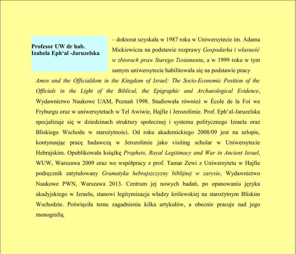 – doktorat uzyskała w 1987 roku w Uniwersytecie im. Adama Profesor UW dr hab. Izabela Eph‘al -Jaruzelska Mickiewicza na podstawie rozprawy Gospodarka i własność w zbiorach praw Starego Testamentu, a w 1999 roku w tym samym uniwersytecie habilitowała się na podstawie pracy Amos and the Officialdom in the Kingdom of Israel: The Socio-Economic Position of the Officials in the Light of the Biblical, the Epigraphic and Archaeological Evidence, Wydawnictwo Naukowe UAM, Poznań 1998. Studiowała również w École de la Foi we Fryburgu oraz w uniwersytetach w Tel Awiwie, Hajfie i Jerozolimie. Prof. Eph‘al-Jaruzelska specjalizuje się w dziedzinach struktury społecznej i systemu politycznego Izraela oraz Bliskiego Wschodu w starożytności. Od roku akademickiego 2008/09 jest na urlopie, kontynuując pracę badawczą w Jerozolimie jako visiting scholar w Uniwersytecie Hebrajskim. Opublikowała książkę Prophets, Royal Legitimacy and War in Ancient Israel, WUW, Warszawa 2009 oraz we współpracy z prof. Tamar Zewi z Uniwersytetu w Hajfie podręcznik zatytułowany Gramatyka hebrajszczyzny biblijnej w zarysie, Wydawnictwo Naukowe PWN, Warszawa 2013. Centrum jej nowych badań, po opanowaniu języka akadyjskiego w Izraelu, stanowi legitymizacja władzy królewskiej na starożytnym Bliskim Wschodzie. Poświęciła temu zagadnieniu kilka artykułów, a obecnie pracuje nad jego monografią.