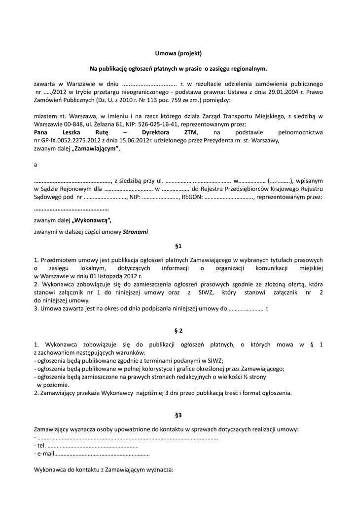 Umowa (projekt) Na publikację ogłoszeń płatnych w prasie o zasięgu regionalnym. zawarta w Warszawie w dniu ................................. r. w rezultacie udzielenia zamówienia publicznego nr .…./2012 w trybie przetargu nieograniczonego ‐ podstawa prawna: Ustawa z dnia 29.01.2004 r. Prawo Zamówień Publicznych (Dz. U. z 2010 r. Nr 113 poz. 759 ze zm.) pomiędzy: miastem st. Warszawa, w imieniu i na rzecz którego działa Zarząd Transportu Miejskiego, z siedzibą w Warszawie 00‐848, ul. Żelazna 61, NIP: 526‐025‐16‐41, reprezentowanym przez: Pana Leszka Rutę – Dyrektora ZTM, na podstawie pełnomocnictwa nr GP‐IX.0052.2275.2012 z dnia 15.06.2012r. udzielonego przez Prezydenta m. st. Warszawy, zwanym dalej „Zamawiającym”, a …………………………………………., z siedzibą przy ul. ………………..………………….. w……………… (….‐……..), wpisanym w Sądzie Rejonowym dla ……….……………….… w ………….….. do Rejestru Przedsiębiorców Krajowego Rejestru Sądowego pod nr ………………….……, NIP: ……………………, REGON: ………………………….., reprezentowanym przez: ………………………………………… zwanym dalej „Wykonawcą”, zwanymi w dalszej części umowy Stronami §1 1. Przedmiotem umowy jest publikacja ogłoszeń płatnych Zamawiającego w wybranych tytułach prasowych o zasięgu lokalnym, dotyczących informacji o organizacji komunikacji miejskiej w Warszawie w dniu 01 listopada 2012 r. 2. Wykonawca zobowiązuje się do zamieszczenia ogłoszeń prasowych zgodnie ze złożoną ofertą, która stanowi załącznik nr 1 do niniejszej umowy oraz z SIWZ, który stanowi załącznik nr 2 do niniejszej umowy. 3. Umowa zawarta jest na okres od dnia podpisania niniejszej umowy do ………………….. r. § 2 1. Wykonawca zobowiązuje się do publikacji ogłoszeń płatnych, o których mowa w § 1 z zachowaniem następujących warunków: ‐ ogłoszenia będą publikowane zgodnie z terminami podanymi w SIWZ; ‐ ogłoszenia będą publikowane w pełnej kolorystyce i grafice określonej przez Zamawiającego; ‐ ogłoszenia będą zamieszczone na prawych stronach redakcyjnych o wielkości ½ strony w poziomie. 2. Zamawiający przekaże Wykonawcy najpóźniej 3 dni przed publikacją treść i format ogłoszenia. §3 Zamawiający wyznacza osoby upoważnione do kontaktu w sprawach dotyczących realizacji umowy: ‐ ……………………………………………………………………………………………………….. ‐ tel. …………………………………………………… ‐ e‐mail……………………………………………………… Wykonawca do kontaktu z Zamawiającym wyznacza: ‐ ………………………………………………………………………………………………………. ‐ tel. …………………………………………………… ‐ e‐mail……………………………………………………… §4 1. Wykonawca ponosi odpowiedzialność za błędy powstałe w treści ogłoszenia, w szczególności za rozbieżność treści publikowanego ogłoszenia z treścią przekazaną przez Zamawiającego. W sytuacji, o której mowa wyżej Wykonawca na koszt własny dokonywać będzie sprostowań treści zamieszczonych ogłoszeń. Sprostowania będą opublikowane niezwłocznie po zauważeniu błędu przez którąkolwiek ze stron lub po wezwaniu Wykonawcy do sprostowania przez Zamawiającego, w określonym terminie. 2. W przypadku nie opublikowania ogłoszenia z przyczyn zawinionych przez Wykonawcę bądź nie sprostowania ogłoszenia zgodnie z postanowieniem ust. 1, Wykonawca zobowiązany jest do publikacji ogłoszenia oraz sprostowanego ogłoszenia w zażądanym przez Zamawiającego terminie na własny koszt. Powyższe nie wyłącza uprawnień Zamawiającego zawartych w § 4 ust. 1 i § 7 ust. 2. §5 1. Stwierdzenie wykonania przedmiotu umowy w zakresie dotyczącym publikacji ogłoszeń nastąpi na podstawie protokołu odbioru końcowego, zawierającego ocenę zgodności jakościowej i ilościowej z warunkami umowy. Do protokołu odbioru Wykonawca dołączy po jednym egzemplarzu gazety z każdego terminu ogłoszenia. Protokół odbioru stanowić będzie podstawę wystawienia faktury VAT. §6 1. Zamawiający zobowiązuje się zapłacić Wykonawcy za wykonanie umowy łączną kwotę brutto: ……………….PLN (słownie zł…………..). 2. Należność będzie płatna przelewem po wykonaniu usługi, na konto wskazane przez Wykonawcę, w terminie 21 dni od daty otrzymania dokumentacji dokonanych publikacji oraz prawidłowo wystawionej faktury VAT. 3. Za datę zapłaty Strony przyjmują datę obciążenia rachunku bankowego Zamawiającego. § 7 1. W przypadku niewykonania umowy, jej nienależytego wykonania, odstąpienia od umowy przez Wykonawcę, a także odstąpienia lub rozwiązania umowy przez Zamawiającego z przyczyn leżących po stronie Wykonawcy, Wykonawca zobowiązany będzie do zapłaty na rzecz Zamawiającego kary umownej w wysokości 10 % kwoty umówionego wynagrodzenia brutto, o którym mowa w § 6 ust.1. 2. Za opóźnienie w wykonaniu przedmiotu umowy Wykonawca zapłaci Zamawiającemu karę umowną w wysokości 3 % wynagrodzenia umownego brutto, o którym mowa w § 6 ust.1 za każdy dzień opóźnienia. Za opóźnienie rozumie się niedotrzymanie terminów, określonych przez Zamawiającego w SIWZ. 3. Zamawiający może potrącić z płatności wynagrodzenia należność z tytułu kar umownych, o których mowa w ust. 1 i 2 bez konieczności wzywania Wykonawcy do zapłaty naliczonych kar. 4. Zamawiający zastrzega sobie prawo do dochodzenia odszkodowania przewyższającego wysokość kar umownych na zasadach ogólnych. § 8 1. Każda zmiana postanowień umowy wymaga formy pisemnej pod rygorem nieważności. Zamawiający dopuszcza możliwość wprowadzenia zmian w umowi