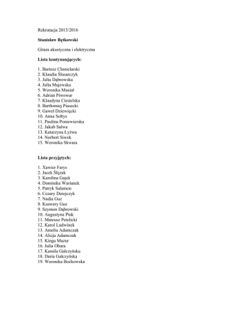 Rekrutacja 2015/2016 Stanisław Bętkowski Gitara akustyczna i elektryczna Lista kontynuujących: 1. Bartosz Chmielarski 2. Klaudia Ślusarczyk 3. Julia Dąbrowska 4. Julia Majewska 5. Weronika Musiał 6. Adrian Piwowar 7. Klaudyna Ciesielska 8. Bartłomiej Piasecki 9. Gaweł Dziewięcki 10. Anna Sołtys 11. Paulina Poniewierska 12. Jakub Salwa 13. Katarzyna Łyżwa 14. Norbert Siwek 15. Weronika Skwara Lista przyjętych: 1. Xawier Farys 2. Jacek Ślęzak 3. Karolina Gajek 4. Dominika Warianek 5. Patryk Salamon 6. Cezary Derejczyk 7. Nadia Guz 8. Ksawery Guz 9. Szymon Dąbrowski 10. Augustyna Ptak 11. Mateusz Petelicki 12. Karol Ludwinek 13. Amelia Adamczak 14. Alicja Adamczak 15. Kinga Mazur 16. Julia Obara 17. Kamila Gałczyńska 18. Daria Gałczyńska 19. Weronika Boćkowska