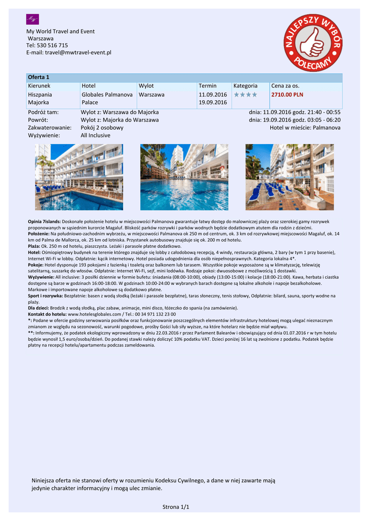 My World Travel and Event Warszawa Tel: 530 516 715 E-mail: [email protected] Oferta 1 Kierunek Hiszpania Majorka Hotel Wylot Globales Palmanova Warszawa Palace Podróż tam: Powrót: Zakwaterowanie: Wyżywienie: Wylot z: Warszawa do Majorka Wylot z: Majorka do Warszawa Pokój 2 osobowy All Inclusive Termin 11.09.2016 19.09.2016 Kategoria Cena za os. 2710.00 PLN dnia: 11.09.2016 godz. 21:40 - 00:55 dnia: 19.09.2016 godz. 03:05 - 06:20 Hotel w mieście: Palmanova Opinia 7islands: Doskonałe położenie hotelu w miejscowości Palmanova gwarantuje łatwy dostęp do malowniczej plaży oraz szerokiej gamy rozrywek proponowanych w sąsiednim kurorcie Magaluf. Bliskość parków rozrywki i parków wodnych będzie dodatkowym atutem dla rodzin z dziećmi. Położenie: Na południowo-zachodnim wybrzeżu, w miejscowości Palmanova ok 250 m od centrum, ok. 3 km od rozrywkowej miejscowości Magaluf, ok. 14 km od Palma de Mallorca, ok. 25 km od lotniska. Przystanek autobusowy znajduje się ok. 200 m od hotelu. Plaża: Ok. 250 m od hotelu, piaszczysta. Leżaki i parasole płatne dodatkowo. Hotel: Ośmiopiętrowy budynek na terenie którego znajduje się lobby z całodobową recepcją, 4 windy, restauracja główna, 2 bary (w tym 1 przy basenie), Internet Wi-Fi w lobby. Odpłatnie: kącik internetowy. Hotel posiada udogodnienia dla osób niepełnosprawnych. Kategoria lokalna 4*. Pokoje: Hotel dysponuje 193 pokojami z łazienką i toaletą oraz balkonem lub tarasem. Wszystkie pokoje wyposażone są w klimatyzację, telewizję satelitarną, suszarkę do włosów. Odpłatnie: Internet Wi-Fi, sejf, mini lodówka. Rodzaje pokoi: dwuosobowe z możliwością 1 dostawki. Wyżywienie: All inclusive: 3 posiłki dziennie w formie bufetu: śniadania (08:00-10:00), obiady (13:00-15:00) i kolacje (18:00-21:00). Kawa, herbata i ciastka dostępne są barze w godzinach 16:00-18:00. W godzinach 10:00-24:00 w wybranych barach dostępne są lokalne alkohole i napoje bezalkoholowe. Markowe i importowane napoje alkoholowe są dodatkowo płatne. Sport i rozrywka: Bezpłatnie: basen z wodą słodką (leżaki i parasole bezpłatne), taras słoneczny, tenis stołowy, Odpłatnie: bilard, sauna, sporty wodne na plaży. Dla dzieci: Brodzik z wodą słodką, plac zabaw, animacje, mini disco, łóżeczko do spania (na zamówienie). Kontakt do hotelu: www.hotelesglobales.com / Tel.: 00 34 971 132 23 00 *: Podane w ofercie godziny serwowania posiłków oraz funkcjonowanie poszczególnych elementów infrastruktury hotelowej mogą ulegać nieznacznym zmianom ze względu na sezonowość, warunki pogodowe, prośby Gości lub siły wyższe, na które hotelarz nie będzie miał wpływu. **: Informujemy, że podatek ekologiczny wprowadzony w dniu 22.03.2016 r przez Parlament Balearów i obowiązujący od dnia 01.07.2016 r w tym hotelu będzie wynosił 1,5 euro/osoba/dzień. Do podanej stawki należy doliczyć 10% podatku VAT. Dzieci poniżej 16 lat są zwolnione z podatku. Podatek będzie płatny na recepcji hotelu/apartamentu podczas zameldowania. Niniejsza oferta nie stanowi oferty w rozumieniu Kodeksu Cywilnego, a dane w niej zawarte mają jedynie charakter informacyjny i mogą ulec zmianie. Strona 1/1 Powered by TCPDF (www.tcpdf.org)