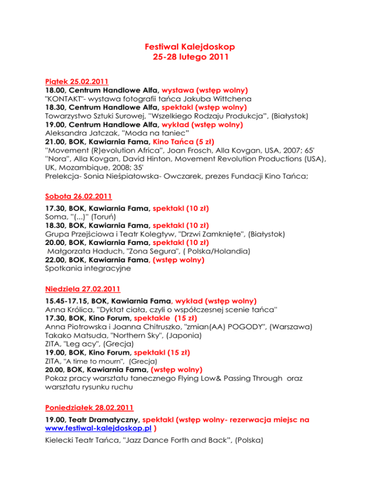 Festiwal Kalejdoskop 25-28 lutego 2011 Piątek 25.02.2011 18.00, Centrum Handlowe Alfa, wystawa (wstęp wolny) "KONTAKT"- wystawa fotografii tańca Jakuba Wittchena 18.30, Centrum Handlowe Alfa, spektakl (wstęp wolny) Towarzystwo Sztuki Surowej, ''Wszelkiego Rodzaju Produkcja”, (Białystok) 19.00, Centrum Handlowe Alfa, wykład (wstęp wolny) Aleksandra Jatczak, ''Moda na taniec” 21.00, BOK, Kawiarnia Fama, Kino Tańca (5 zł) ''Movement (R)evolution Africa'', Joan Frosch, Alla Kovgan, USA, 2007; 65' ''Nora'', Alla Kovgan, David Hinton, Movement Revolution Productions (USA), UK, Mozambique, 2008; 35' Prelekcja- Sonia Nieśpiałowska- Owczarek, prezes Fundacji Kino Tańca; Sobota 26.02.2011 17.30, BOK, Kawiarnia Fama, spektakl (10 zł) Soma, ''(...)'' (Toruń) 18.30, BOK, Kawiarnia Fama, spektakl (10 zł) Grupa Przejściowa i Teatr Kolegtyw, "Drzwi Zamknięte", (Białystok) 20.00, BOK, Kawiarnia Fama, spektakl (10 zł) Małgorzata Haduch, "Zona Segura", ( Polska/Holandia) 22.00, BOK, Kawiarnia Fama, (wstęp wolny) Spotkania integracyjne Niedziela 27.02.2011 15.45-17.15, BOK, Kawiarnia Fama, wykład (wstęp wolny) Anna Królica, ''Dyktat ciała, czyli o współczesnej scenie tańca'' 17.30, BOK, Kino Forum, spektakle (15 zł) Anna Piotrowska i Joanna Chitruszko, "zmian(AA) POGODY", (Warszawa) Takako Matsuda, "Northern Sky", (Japonia) ZITA, "Leg acy", (Grecja) 19.00, BOK, Kino Forum, spektakl (15 zł) ZITA, "A time to mourn", (Grecja) 20.00, BOK, Kawiarnia Fama, (wstęp wolny) Pokaz pracy warsztatu tanecznego Flying Low& Passing Through oraz warsztatu rysunku ruchu Poniedziałek 28.02.2011 19.00, Teatr Dramatyczny, spektakl (wstęp wolny- rezerwacja miejsc na www.festiwal-kalejdoskop.pl ) Kielecki Teatr Tańca, "Jazz Dance Forth and Back”, (Polska) Warsztaty taneczne (25.02.-28.02.2011) Małgorzatą Haduch/ Polska/-Flying low& Passing through Iris Karayan/ Grecja/- Composition Workshops Takako Matsuda/ Japonia/ Polska – Contemporary Dance & Butoh Bilety dostępne w Studio Działań Kreatywnych DanceOFFnia i w miejscach występów na 1h przed rozpoczęciem wydarzenia. Karnet- 45 zł (na wszystkie wydarzenia festiwalu, łącznie z rezerwacją wejściówek na spektakl Kieleckiego Teatru Tańca i biletów na wieczór Kina Tańca) Bilety na wybrane wieczory- 25 zł ( sobotę, 26.02.2011 lub niedzielę, 27.02.2011 łącznie z rezerwacją wejściówek na spektakl Kieleckiego Teatru Tańca i biletów na wieczór Kina Tańca) Więcej: www.festiwal-kalejdoskop.pl