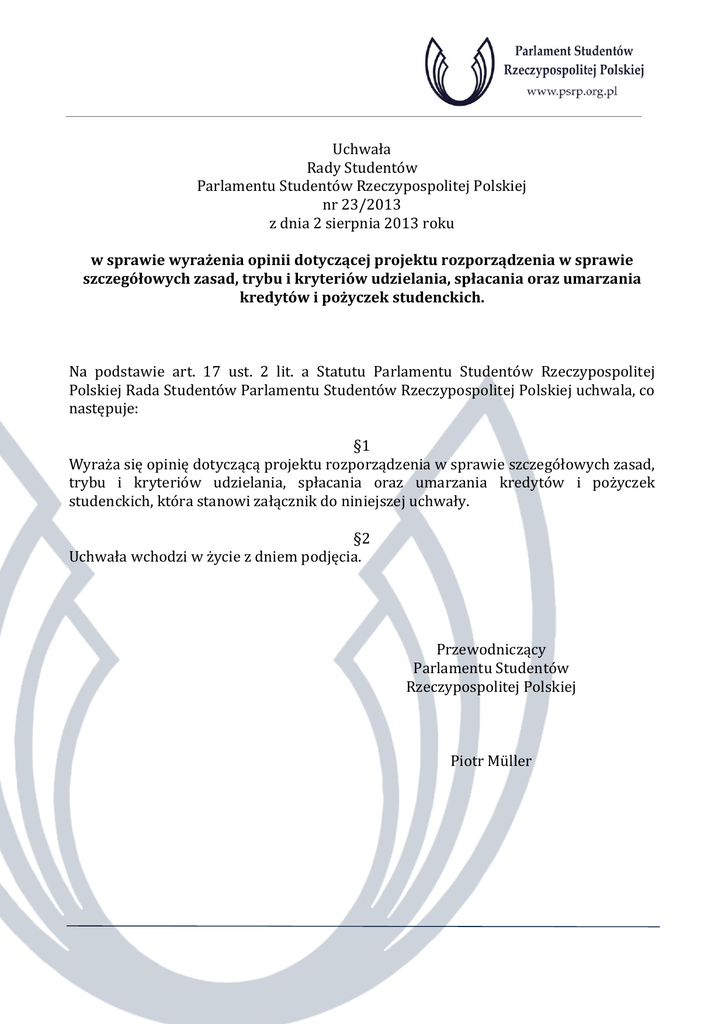 Uchwała Rady Studentów Parlamentu Studentów Rzeczypospolitej Polskiej nr 23/2013 z dnia 2 sierpnia 2013 roku w sprawie wyrażenia opinii dotyczącej projektu rozporządzenia w sprawie szczegółowych zasad, trybu i kryteriów udzielania, spłacania oraz umarzania kredytów i pożyczek studenckich. Na podstawie art. 17 ust. 2 lit. a Statutu Parlamentu Studentów Rzeczypospolitej Polskiej Rada Studentów Parlamentu Studentów Rzeczypospolitej Polskiej uchwala, co następuje: §1 Wyraża się opinię dotyczącą projektu rozporządzenia w sprawie szczegółowych zasad, trybu i kryteriów udzielania, spłacania oraz umarzania kredytów i pożyczek studenckich, która stanowi załącznik do niniejszej uchwały. §2 Uchwała wchodzi w życie z dniem podjęcia. Przewodniczący Parlamentu Studentów Rzeczypospolitej Polskiej Piotr Müller Opinia Parlamentu Studentów Rzeczypospolitej Polskiej dotycząca projektu rozporządzenia w sprawie szczegółowych zasad, trybu i kryteriów udzielania, spłacania oraz umarzania kredytów i pożyczek studenckich. Na aprobatę zasługuje propozycja wprowadzenia oświadczeń studenta, jako alternatywy dla zaświadczeń urzędu skarbowego lub innych organów i podmiotów w procesie dokumentowania dochodów rodziny studenta. Rozwiązanie to niewątpliwie usprawni i ułatwi proces dokumentowania dochodów przez co może wpłynąć pozytywnie na zainteresowanie kredytem wśród studentów. Projekt zakłada wprowadzenie do rozporządzenia zasad wypowiadania kredytów wynikających z ustawy – Prawo bankowe (Dz.U. z 2012 r., poz. 1376, 1385, 1529) oraz ustawy o kredycie konsumenckim (Dz.U. Nr 126, poz. 715, Nr 165, poz. 984 i Nr 201, poz. 1181 oraz z 2012 r. poz. 1193), uprawniających banki do wypowiedzenia umowy kredytu lub pożyczki w sytuacji negatywnej oceny zdolności kredytowej kredytobiorcy następującej w trakcie pobierania kredytu. Regulacja ta niweluje poczucie gwarancji uzyskiwania środków na kontynuowanie podjętych studiów i wiąże je z koniecznością zapewnienia stabilności zdolności kredytowej studenta przez cały okres studiów. Rozwiązanie takie z pewnością wzbudzi niechęć potencjalnych kredytobiorców do uzyskania kredytu, ponieważ student podejmujący studia z założeniem uzyskiwania przez 10 miesięcy w roku środków pozwalających na kontynuowanie studiów, nie może być pewny, że w trakcie roku studiów w wyniku osłabienia zdolności kredytowej bank nie wypowie umowy kredytu, zaprzestanie wypłaty rat, a co więcej wezwie do spłaty wypłaconych dotąd rat wraz z kwotą dopłat do odsetek udzielonych z Funduszu. Z tych powodów Parlament wyraża negatywną opinię w zakresie wprowadzenia wskazanych zmian. Umożliwienie studentowi uzyskania kredytu na preferencyjnych warunkach winno nadal łączyć się z gwarancją państwa, tak dla studenta jak i dla banku, w zakresie wypłaty rat i ich spłaty, uwzględniając ryzyko osłabienia zdolności kredytowej studenta. Parlament Studentów Rzeczypospolitej Polskiej pragnie zwrócić uwagę na kwotę raty kredytu wypłacanej studentom. Obecnie student może zdecydować się na kredyt w wysokości 600 zł. W opinii Parlamentu należałoby uelastycznić system ustalania wysokości rat kredytu poprzez zastosowanie widełek kwotowych, gdzie górny pułap byłby nie mniejszy niż 1000 zł miesięcznie. Propozycja ta wynika z obecnej sytuacji gospodarczej oraz zmian, których świadkami jesteśmy od kilku lat. Już pobieżna analiza rynku w ośrodkach akademickich pozwala stwierdzić, że do utrzymania się na studiach potrzeba obecnie w wielu miastach 1000 zł miesięcznie lub więcej. Kwota taka umożliwia opłacenie większości kosztów życia, takich jak opłaty mieszkaniowe, żywność, dojazdy, książki akademickie, itp. Parlament postuluje wprowadzenie możliwości pobierania rat kredytu studenckiego w zwiększonej wysokości, aby umożliwić pełne pokrycie kosztów utrzymania na studiach.