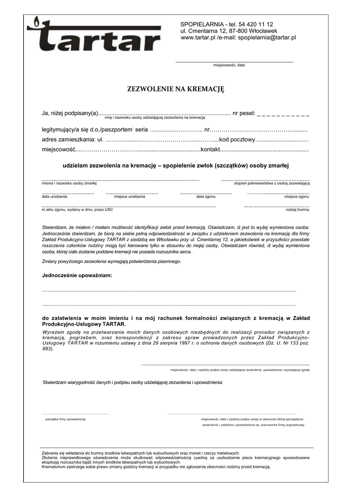 SPOPIELARNIA - tel. 54 420 11 12 ul. Cmentarna 12, 87-800 Włocławek www.tartar.pl /e-mail: [email protected] miejscowość, data ZEZWOLENIE NA KREMACJĘ Ja, niżej podpisany(a)................................................................................. nr pesel: _ _ _ _ _ _ _ _ _ _ _ imię i nazwisko osoby udzielającej zezwolenia na kremację : legitymujący/a się d.o./paszportem seria …..............…….…... nr………………..…….…………….......... adres zamieszkania: ul. ………...........………………………....……....kod pocztowy…......................…… miejscowość....………………….…….......................................kontakt...................................................... udzielam zezwolenia na kremację – spopielenie zwłok (szczątków) osoby zmarłej ................................................................................................ ...................................................... imiona i nazwisko osoby zmarłej ................................ data urodzenia ................................ miejsce urodzenia stopień pokrewieństwa z osobą zezwalającą ................................ data zgonu .......................................................................................................... nr aktu zgonu, wydany w dniu, przez USC ……............................... miejsce zgonu ........................................ rodzaj trumny Stwierdzam, że miałem / miałam możliwość identyfikacji zwłok przed kremacją. Oświadczam, iż jest to wyżej wymieniona osoba. Jednocześnie stwierdzam, że biorę na siebie pełną odpowiedzialność w związku z udzieleniem zezwolenia na kremację dla firmy Zakład Produkcyjno-Usługowy TARTAR z siedzibą we Włocławku przy ul. Cmentarnej 12, a jakiekolwiek w przyszłości powstałe roszczenia członków rodziny mogą być kierowane tylko w stosunku do mojej osoby. Oświadczam również, iż wyżej wymieniona osoba, której ciało zostanie poddane kremacji nie posiada rozrusznika serca. Zmiany powyższego zezwolenia wymagają potwierdzenia pisemnego. Jednocześnie upoważniam: …......................................................................................................................................................... ............................................................................................................................................................ do załatwienia w moim imieniu i na mój rachunek formalności związanych z kremacją w Zakład Produkcyjno-Usługowy TARTAR. Wyrażam zgodę na przetwarzanie moich danych osobowych niezb ędnych do realizacji procedur związanych z kremacją, pogrzebem, oraz korespondenc ji z zakresu spraw prowadzonych przez Zakład Produkcyjno Usługowy TARTAR w rozumieniu ustawy z dnia 29 sierpnia 1997 r. o ochronie danych osobowych (Dz. U. Nr 133 poz. 883). …................................................................................................... miejscowość, data i czytelny podpis osoby udzielającej zezwolenia, upoważnienia i wyrażającej zgodę Stwierdzam wiarygodność danych i podpisu osoby udzielającej zezwolenia i upoważnienia: ….................................................................... pieczątka firmy upoważnionej …............................................................................................................................ .......... miejscowość, data i czytelny podpis osoby w obecności której sporządzono zezwolenie i udzielono upoważnienia np. pracownika firmy pogrzebowej Zabrania się wkładania do trumny środków łatwopalnych lub wybuchowych oraz monet i rzeczy metalowych. Złożenie nieprawidłowego oświadczenia może skutkować odpowiedzialnością cywilną za uszkodzenie pieca kremacyjnego spowodowane eksplozją rozrusznika bądź innych środków łatwopalnych lub wybuchowych. Krematorium zastrzega sobie prawo zmiany godziny kremacji w przypadku nie zgłoszenia obecności rodziny przed kremacją.