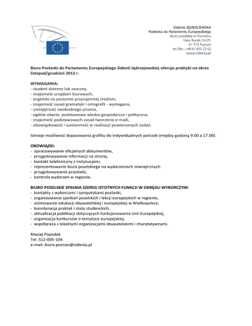 Biuro Posłanki do Parlamentu Europejskiego Sidonii Jędrzejewskiej oferuje praktyki na okres listopad/grudzień 2012 r. WYMAGANIA: - student dzienny lub zaoczny, - znajomość urządzeń biurowych, - angielski na poziomie przynajmniej średnim, - znajomość zasad gramatyki i ortografii - wymagana, - umiejętność swobodnego pisania, - ogólne obycie, podstawowa wiedza gospodarcza i polityczna, - znajomość podstawowych zasad tworzenia e-maili, - obowiązkowość i sumienność w realizacji powierzonych zadań. Istnieje możliwość dopasowania grafiku do indywidualnych potrzeb (między godziną 9.00 a 17.00). OBOWIĄZKI: - opracowywanie oficjalnych dokumentów, - przygotowywanie informacji na stronę, - kontakt telefoniczny z instytucjami, - reprezentowanie biura poselskiego na wydarzeniach zewnętrznych - przygotowywanie prasówki, - kontrola wydarzeń w regionie. BIURO POSELSKIE SPEŁNIA SZEREG ISTOTNYCH FUNKCJI W OKRĘGU WYBORCZYM: - kontakty z wyborcami i sympatykami posłanki, - organizowanie spotkań poselskich i lekcji europejskich w regionie, - animowanie edukacji obywatelskiej i europejskiej w Wielkopolsce, - koordynacja praktyk i staży studenckich, - aktualizacja publikacji dotyczących funkcjonowania Unii Europejskiej, - organizacja konkursów o tematyce europejskiej, - współpraca z lokalnymi organizacjami obywatelskimi i charytatywnymi. Maciej Popiołek Tel: 512-005-104 e-mail: [email protected]