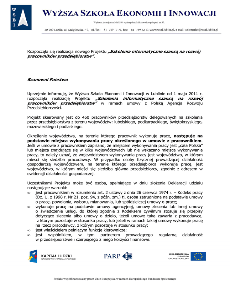 Rozpoczęła się realizacja nowego Projektu „Szkolenia informatyczne szansą na rozwój pracowników przedsiębiorstw”. Szanowni Państwo Uprzejmie informuję, że Wyższa Szkoła Ekonomii i Innowacji w Lublinie od 1 maja 2011 r. rozpoczęła realizację Projektu „Szkolenia informatyczne szansą na rozwój pracowników przedsiębiorstw” w ramach umowy z Polską Agencja Rozwoju Przedsiębiorczości. Projekt skierowany jest do 450 pracowników przedsiębiorstw delegowanych na szkolenia przez przedsiębiorstwa z terenu województw: lubelskiego, podkarpackiego, świętokrzyskiego, mazowieckiego i podlaskiego. Określenie województwa, na terenie którego pracownik wykonuje pracę, następuje na podstawie miejsca wykonywania pracy określonego w umowie z pracownikiem. Jeśli w umowie z pracownikiem zapisano, że miejscem wykonywania pracy jest „cała Polska” lub miejsca znajdujące się w kilku województwach lub nie wskazano miejsca wykonywania pracy, to należy uznać, że województwem wykonywania pracy jest województwo, w którym mieści się siedziba pracodawcy. W przypadku osoby fizycznej prowadzącej działalność gospodarczą województwem, na terenie którego przedsiębiorca wykonuje pracę, jest województwo, w którym mieści się siedziba główna przedsiębiorcy, zgodnie z adresem w ewidencji działalności gospodarczej. Uczestnikami Projektu może być osoba, spełniające w dniu złożenia Deklaracji udziału następujące warunki: • jest pracownikiem w rozumieniu art. 2 ustawy z dnia 26 czerwca 1974 r. – Kodeks pracy (Dz. U. z 1998 r. Nr 21, poz. 94, z późn. zm.) tj. osoba zatrudniona na podstawie umowy o pracę, powołania, wyboru, mianowania, lub spółdzielczej umowy o pracę; • wykonuje pracę na podstawie umowy agencyjnej, umowy zlecenia lub innej umowy o świadczenie usług, do której zgodnie z Kodeksem cywilnym stosuje się przepisy dotyczące zlecenia albo umowy o dzieło, jeżeli umowę taką zawarła z pracodawcą, z którym pozostaje w stosunku pracy, lub jeżeli w ramach takiej umowy wykonuje pracę na rzecz pracodawcy, z którym pozostaje w stosunku pracy; • jest właścicielem pełniącym funkcje kierownicze; • jest wspólnikiem, w tym partnerem prowadzącego regularną działalność w przedsiębiorstwie i czerpiącego z niego korzyści finansowe. Projekt współfinansowany przez Unię Europejską w ramach Europejskiego Funduszu Społecznego Osoby zatrudnione tylko na podstawie umowy cywilnoprawnej nie mogą korzystać ze szkoleń w ramach projektu. Kierunki szkoleń: 1. ZASTOSOWANIE INFORMATYKI W PROCESOWYM ZARZĄDZANIU PRZEDSIĘBIORSTWEM–120 h, 5 gr po śr. 15 osób, łącznie 75 os. Moduły: Procesowe zarządzanie przedsiębiorstwem, Modelowanie systemów informacyjnych, Modelowanie procesów biznesowych-10h, Komputerowo wspomagana analiza danych, Zarządzanie projektami, Sieci komputerowe w przedsiębiorstwie, Modelowanie obiektowe systemów, Modelowanie symulacyjne procesów, Komputerowo wspomagane procesy produkcyjne, Zintegrowane informatyczne systemy zarządzania m.in. MS Project. 2. SYSTEMY MULTIMEDIALNE I GRAFIKA KOMPUTEROWA - 120 h, gr po śr.15 osób, łącznie 75 os. Moduły: Technologie Internetowe, Systemy operacyjne w środowisku PC, Projektowanie prezentacji multimedialnych, Grafika wektorowa elementami przygotowania do druku, Zaawansowana grafika wektorowa (Adobe Ilustrator), Podstawy grafiki rastowej w PhotoPaint(PC), Grafika rastowa (Photoshop), Tworzenie i optymalizacja grafiki sieciowej, Obróbka fotografii cyfrowej, Grafika animacyjna w Macromedia Flash, Obróbka plików filmowych, Projektowanie stron WWW. 3. SYSTEMY INFORMATYCZNE I SIECI KOMPUTEROWE –120 h, 5 gr po śr. 15 osób, łącznie 75 os. Moduły: Technologie internetowe, Systemy operacyjne w środowisku PC, Architektura sieci komputerowych, Internet-architektura, metody dostępu, usługi, Podstawy i urządzenia transmisji danych, Sieci komputerowe-przewodowe i bezprzewodowe, Zarządzanie i administrowanie sieciami, Bezpieczeństwo pracy sieci komputerowych, Sieciowe systemy operacyjne, Projektowanie Sieci komputerowych, Administrowanie systemami, serwerami poczty elektronicznej i serwerami WWW. 4. ADMINISTRATOR BAZ DANYCH –120 h, 5 gr po śr. 15 osób, łącznie 75 os. Moduły: Ogólna charakterystyka baz danych, Rozproszone bazy danych, Architektura klient/serwer, Projektowanie struktury logicznej relacyjnych baz danych, Język SQL, Bezpieczeństwo systemów bazodanowych, Ochrona integralności baz danych, Administrowanie bazami danych, Zaawansowane bazy danych. 5. INŻYNIERIA INTERNETOWA - 120 h 5 gr po śr.15 osób, łącznie 75 os. Moduły: Sposób działania sieci lokalnych i rozległych jako medium, Udostępniania informacji przy prowadzeniu działalności gospodarczej, Instalowanie i zarządzanie serwisami internetowymi, Tworzenie stron i witryn internetowych(stron dynamicznych z dostępem do baz danych, stron z elementami programowymi i multimedialnymi), Techniki wizualizacji informacji w serwisach WWW, Zasady prowadzenia działalności gospodarczej z wykorzystaniem Internetu, Zasady bezpieczeństwa pracy w Internecie (autoryzacji i uwierzytelniania, zapewniania poufności informacji, ochrony serwerów i serwisów). Projekt współfinansowany przez Unię Europejską w ramach Europejskiego Funduszu Społecznego 6. Projektant stron WWW 120 h, gr. po śr.15 osób, łącznie 75 os. Moduły: Swobodne poruszanie się po aplikacji Photoshop, Przygotowywanie grafiki pod www, pod druk i do punktów fotograficznych, Praca z tekstem i stosowanie różnych efektów dla tekstu typu: cienie, efekty 3D, uwypuklenia, Przygotowanie wyglądu strony WWW, Rozróżnianie elementów HTML(XHTML), Obiekty, Swobodnie formatować dokumenty www stylami CSS, Jak założyć dowolną stronę nowoczesną metodą wykorzystującą identyfikatory (ID), Metody wstawiania kodu PHP, Program Adobe Flash. Realizacja zajęć: Zajęcia będą realizowane będą: w Lublinie (od p