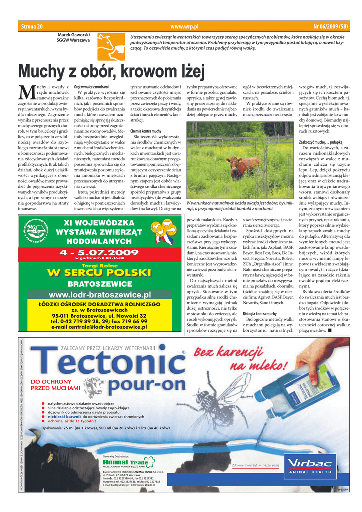 Strona 20 www.wrp.pl Marek Gaworski SGGW Warszawa Nr 06/2009 (58) Utrzymaniu zwierząt inwentarskich towarzyszy szereg specyficznych problemów, które nasilają się w okresie podwyższonych temperatur otoczenia. Problemy przybierają w tym przypadku postać latającą, a nawet bzyczącą. To oczywiście muchy, z którymi czas podjąć równą walkę. Muchy z obór, krowom lżej M uchy i owady z rzędu muchówek stanowią poważne zagrożenie w produkcji zwierząt inwentarskich, w tym bydła mlecznego. Zagrożenie wynika z przenoszenia przez muchy szeregu groźnych chorób, w tym brucelozy i gruźlicy, co w połączeniu ze zdolnością owadów do szybkiego rozmnażania stanowi o konieczności podejmowania zdecydowanych działań profilaktycznych. Brak takich działań, obok dużej uciążliwości wynikającej z obecności owadów, może prowadzić do pogorszenia uzyskiwanych wyników produkcyjnych, a tym samym narażenia gospodarstwa na straty finansowe. Oręż w walce z muchami W praktyce wyróżnia się kilka zarówno bezpośrednich, jak i pośrednich sposobów podejścia do zwalczania much, które nawzajem uzupełniając się sprzyjają skuteczności ochrony przed zagrożeniami ze strony owadów. Metody bezpośrednie uwzględniają wykorzystanie w walce z muchami środków chemicznych, biologicznych i mechanicznych, natomiast metoda pośrednia sprowadza się do zmniejszenia poziomu stężenia amoniaku w miejscach przeznaczonych do utrzymania zwierząt. Istotą pośredniej metody walki z muchami jest dbałość o higienę w pomieszczeniach inwentarskich, a więc systema- tyczne usuwanie odchodów i zachowanie czystości miejsc przeznaczonych do pobierania przez zwierzęta paszy i wody, a także okresowa dezynfekcja ścian i innych elementów konstrukcji. Chemia kontra muchy Skuteczność wykorzystania środków chemicznych w walce z muchami w budynkach inwentarskich jest uwarunkowana doraźnym przygotowaniem pomieszczeń, obejmującym oczyszczenie ścian z brudu i pajęczyn. Następnym etapem jest dobór właściwego środka chemicznego spośród preparatów z grupy insektycydów (do zwalczania dorosłych much) i larwicydów (na larwy). Dostępne na rynku preparaty są oferowane w formie proszku, granulatu, oprysku, a także gęstej zawiesiny przeznaczonej do nakładania na powierzchnie najbardziej oblegane przez muchy ogół w bezwietrznych miejscach, na posadzce, ściółce i rusztach. W praktyce znane są również środki do zwalczania much, przeznaczone do zasto- W warunkach naturalnych każda okazja jest dobra, by uniknąć, a przynajmniej osłabić kontakt z muchami. powłok malarskich. Każdy z preparatów wyróżnia się określoną specyfiką działania i zasadami zachowania bezpieczeństwa przy jego wykorzystaniu. Kierując się tymi zasadami, na czas stosowania niektórych środków chemicznych konieczne jest wyprowadzenie zwierząt poza budynek inwentarski. Do najszybszych metod zwalczania much zalicza się oprysk. Stosowane w tym przypadku silne środki chemiczne wymagają jednak dużej ostrożności, nie tylko w stosunku do zwierząt, ale i osób wykonujących oprysk. Środki w formie granulatów i proszków rozsypuje się na sowań zewnętrznych, tj. nacierania sierści zwierząt. Spośród dostępnych na rynku insektycydów można wybrać środki chemiczne takich firm, jak: Asplant, BASF, Bayer, Best Pest, Bros, De Insect, Fregata, Novartis, Rolvet, ZCh „Organika-Azot” i inne. Natomiast chemiczne preparaty na larwy, najczęściej w formie proszków do rozsypywania na posadzkach, oborniku i ściółce znajdują się w ofercie firm: Agrivet, BASF, Bayer, Novartis, Sano i innych. Biologia kontra muchy Biologiczne metody walki z muchami polegają na wykorzystaniu naturalnych wrogów much, tj. rozwijających się ich kosztem pasożytów. Cechą biomuch, tj. specjalnie wyselekcjonowanych gatunków much – kanibali jest zabijanie larw muchy domowej. Biomuchy najlepiej sprawdzają się w oborach rusztowych. Zaskoczyć muchę… pułapką Do wartościowych, a zarazem niskonakładowych rozwiązań w walce z muchami zalicza się użycie lepu. Lep, dzięki pokryciu odpowiednią substancją klejącą oraz w efekcie nadrukowania trójwymiarowego wzoru, stanowi doskonały środek wabiący i równocześnie wyłapujący muchy. Innym, znanym rozwiązaniem jest wykorzystanie organicznych przynęt, np. atraktantu, który poprzez silnie wydzielany zapach zwabia muchy do pułapki. Alternatywą dla wymienionych metod jest zastosowanie lamp owadobójczych, wśród których można wymienić lampy lepowe (z wkładem zwabiającym owady) i rażące (działające na zasadzie rażenia owadów prądem elektrycznym). Rynkowa oferta środków do zwalczania much jest bardzo bogata. Odpowiedni dobór tych środków w połączeniu z wiedzą na temat ich zastosowania stanowi o skuteczności corocznej walki z plagą owadów. n wr-076/09