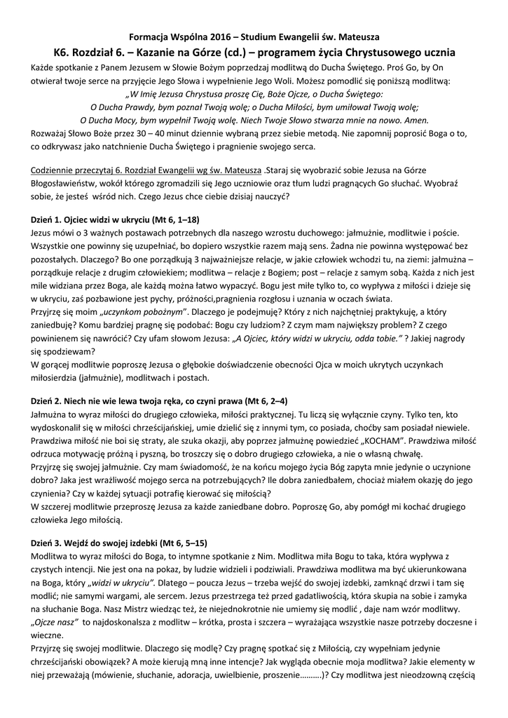 Formacja Wspólna 2016 – Studium Ewangelii św. Mateusza K6. Rozdział 6. – Kazanie na Górze (cd.) – programem życia Chrystusowego ucznia Każde spotkanie z Panem Jezusem w Słowie Bożym poprzedzaj modlitwą do Ducha Świętego. Proś Go, by On otwierał twoje serce na przyjęcie Jego Słowa i wypełnienie Jego Woli. Możesz pomodlić się poniższą modlitwą: „W Imię Jezusa Chrystusa proszę Cię, Boże Ojcze, o Ducha Świętego: O Ducha Prawdy, bym poznał Twoją wolę; o Ducha Miłości, bym umiłował Twoją wolę; O Ducha Mocy, bym wypełnił Twoją wolę. Niech Twoje Słowo stwarza mnie na nowo. Amen. Rozważaj Słowo Boże przez 30 – 40 minut dziennie wybraną przez siebie metodą. Nie zapomnij poprosić Boga o to, co odkrywasz jako natchnienie Ducha Świętego i pragnienie swojego serca. Codziennie przeczytaj 6. Rozdział Ewangelii wg św. Mateusza .Staraj się wyobrazić sobie Jezusa na Górze Błogosławieństw, wokół którego zgromadzili się Jego uczniowie oraz tłum ludzi pragnących Go słuchać. Wyobraź sobie, że jesteś wśród nich. Czego Jezus chce ciebie dzisiaj nauczyć? Dzień 1. Ojciec widzi w ukryciu (Mt 6, 1–18) Jezus mówi o 3 ważnych postawach potrzebnych dla naszego wzrostu duchowego: jałmużnie, modlitwie i poście. Wszystkie one powinny się uzupełniać, bo dopiero wszystkie razem mają sens. Żadna nie powinna występować bez pozostałych. Dlaczego? Bo one porządkują 3 najważniejsze relacje, w jakie człowiek wchodzi tu, na ziemi: jałmużna – porządkuje relacje z drugim człowiekiem; modlitwa – relacje z Bogiem; post – relacje z samym sobą. Każda z nich jest mile widziana przez Boga, ale każdą można łatwo wypaczyć. Bogu jest miłe tylko to, co wypływa z miłości i dzieje się w ukryciu, zaś pozbawione jest pychy, próżności,pragnienia rozgłosu i uznania w oczach świata. Przyjrzę się moim „uczynkom pobożnym”. Dlaczego je podejmuję? Który z nich najchętniej praktykuję, a który zaniedbuję? Komu bardziej pragnę się podobać: Bogu czy ludziom? Z czym mam największy problem? Z czego powinienem się nawrócić? Czy ufam słowom Jezusa: „A Ojciec, który widzi w ukryciu, odda tobie.” ? Jakiej nagrody się spodziewam? W gorącej modlitwie poproszę Jezusa o głębokie doświadczenie obecności Ojca w moich ukrytych uczynkach miłosierdzia (jałmużnie), modlitwach i postach. Dzień 2. Niech nie wie lewa twoja ręka, co czyni prawa (Mt 6, 2–4) Jałmużna to wyraz miłości do drugiego człowieka, miłości praktycznej. Tu liczą się wyłącznie czyny. Tylko ten, kto wydoskonalił się w miłości chrześcijańskiej, umie dzielić się z innymi tym, co posiada, choćby sam posiadał niewiele. Prawdziwa miłość nie boi się straty, ale szuka okazji, aby poprzez jałmużnę powiedzieć „KOCHAM”. Prawdziwa miłość odrzuca motywację próżną i pyszną, bo troszczy się o dobro drugiego człowieka, a nie o własną chwałę. Przyjrzę się swojej jałmużnie. Czy mam świadomość, że na końcu mojego życia Bóg zapyta mnie jedynie o uczynione dobro? Jaka jest wrażliwość mojego serca na potrzebujących? Ile dobra zaniedbałem, chociaż miałem okazję do jego czynienia? Czy w każdej sytuacji potrafię kierować się miłością? W szczerej modlitwie przeproszę Jezusa za każde zaniedbane dobro. Poproszę Go, aby pomógł mi kochać drugiego człowieka Jego miłością. Dzień 3. Wejdź do swojej izdebki (Mt 6, 5–15) Modlitwa to wyraz miłości do Boga, to intymne spotkanie z Nim. Modlitwa miła Bogu to taka, która wypływa z czystych intencji. Nie jest ona na pokaz, by ludzie widzieli i podziwiali. Prawdziwa modlitwa ma być ukierunkowana na Boga, który „widzi w ukryciu”. Dlatego – poucza Jezus – trzeba wejść do swojej izdebki, zamknąć drzwi i tam się modlić; nie samymi wargami, ale sercem. Jezus przestrzega też przed gadatliwością, która skupia na sobie i zamyka na słuchanie Boga. Nasz Mistrz wiedząc też, że niejednokrotnie nie umiemy się modlić , daje nam wzór modlitwy. „Ojcze nasz” to najdoskonalsza z modlitw – krótka, prosta i szczera – wyrażająca wszystkie nasze potrzeby doczesne i wieczne. Przyjrzę się swojej modlitwie. Dlaczego się modlę? Czy pragnę spotkać się z Miłością, czy wypełniam jedynie chrześcijański obowiązek? A może kierują mną inne intencje? Jak wygląda obecnie moja modlitwa? Jakie elementy w niej przeważają (mówienie, słuchanie, adoracja, uwielbienie, proszenie……….)? Czy modlitwa jest nieodzowną częścią mojego życia? A może wcale się nie modlę? Czy odmawiając „Modlitwę Pańską” nie wpadłem w rutynę i przestałem zwracać uwagę na sens wypowiadanych słów? Podziękuję dziś Jezusowi za „Modlitwę Pańską”. Pomodlę się nią, głęboko rozważając każdą z próśb. Zachwycę się ich głębią. Zobaczę, w jak doskonały sposób uwzględniają one wszystkie NASZE potrzeby. Dzień 4. Namaść sobie głowę i umyj twarz (Mt 6, 16-18) Post to wyraz uporządkowanej miłości do samego siebie. Dlaczego? Ponieważ jest panowaniem nad sobą, czego owocem ma być zaprowadzenie ładu i harmonii we własnym życiu, uwolnienie od zbędnych, a nawet grzesznych przywiązań. I tu także Jezus przestrzega przed naśladowaniem faryzeuszy, by nie ludziom pokazywać, że pościmy, ale pościć ze względu na Boga. Mam sobie namaścić głowę i umyć twarz, aby nikt nie zauważył mojego postu, a wtedy prawdziwą nagrodę otrzymam od Ojca, „który widzi w ukryciu” . Przyjrzę się swoim postom. Dlaczego je podejmuję? Na czym najczęściej polega mój post? Czy powstrzymuję się wyłącznie od jedzenia, czy odmawiam sobie też innych przyjemności? Jaką prawdę o sobie odkrywam, poszcząc (a może przekonuję się, że jestem od czegoś uzależniony)? Czy potrafię wytrwać w postanowieniu poszczenia? Czy łączę post z modlitwą i jałmużną? Czy post pomaga mi pogłębiać moją w