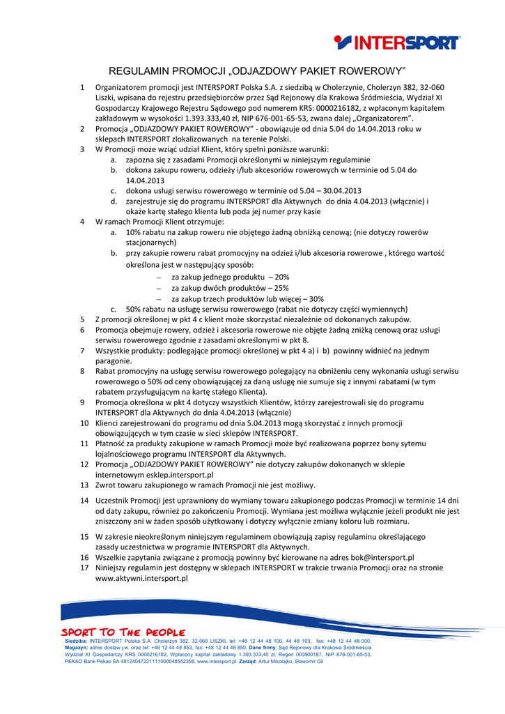 REGULAMIN PROMOCJI „ODJAZDOWY PAKIET ROWEROWY” 1 2 3 4 5 6 7 8 9 10 11 12 13 Organizatorem promocji jest INTERSPORT Polska S.A. z siedzibą w Cholerzynie, Cholerzyn 382, 32-060 Liszki, wpisana do rejestru przedsiębiorców przez Sąd Rejonowy dla Krakowa Śródmieścia, Wydział XI Gospodarczy Krajowego Rejestru Sądowego pod numerem KRS: 0000216182, z wpłaconym kapitałem zakładowym w wysokości 1.393.333,40 zł, NIP 676-001-65-53, zwana dalej „Organizatorem”. Promocja „ODJAZDOWY PAKIET ROWEROWY” - obowiązuje od dnia 5.04 do 14.04.2013 roku w sklepach INTERSPORT zlokalizowanych na terenie Polski. W Promocji może wziąd udział Klient, który spełni poniższe warunki: a. zapozna się z zasadami Promocji określonymi w niniejszym regulaminie b. dokona zakupu roweru, odzieży i/lub akcesoriów rowerowych w terminie od 5.04 do 14.04.2013 c. dokona usługi serwisu rowerowego w terminie od 5.04 – 30.04.2013 d. zarejestruje się do programu INTERSPORT dla Aktywnych do dnia 4.04.2013 (włącznie) i okaże kartę stałego klienta lub poda jej numer przy kasie W ramach Promocji Klient otrzymuje: a. 10% rabatu na zakup roweru nie objętego żadną obniżką cenową; (nie dotyczy rowerów stacjonarnych) b. przy zakupie roweru rabat promocyjny na odzież i/lub akcesoria rowerowe , którego wartośd określona jest w następujący sposób: za zakup jednego produktu – 20% za zakup dwóch produktów – 25% za zakup trzech produktów lub więcej – 30% c. 50% rabatu na usługę serwisu rowerowego (rabat nie dotyczy części wymiennych) Z promocji określonej w pkt 4 c klient może skorzystad niezależnie od dokonanych zakupów. Promocja obejmuje rowery, odzież i akcesoria rowerowe nie objęte żadną zniżką cenową oraz usługi serwisu rowerowego zgodnie z zasadami określonymi w pkt 8. Wszystkie produkty: podlegające promocji określonej w pkt 4 a) i b) powinny widnied na jednym paragonie. Rabat promocyjny na usługę serwisu rowerowego polegający na obniżeniu ceny wykonania usługi serwisu rowerowego o 50% od ceny obowiązującej za daną usługę nie sumuje się z innymi rabatami (w tym rabatem przysługującym na kartę stałego Klienta). Promocja określona w pkt 4 dotyczy wszystkich Klientów, którzy zarejestrowali się do programu INTERSPORT dla Aktywnych do dnia 4.04.2013 (włącznie) Klienci zarejestrowani do programu od dnia 5.04.2013 mogą skorzystad z innych promocji obowiązujących w tym czasie w sieci sklepów INTERSPORT. Płatnośd za produkty zakupione w ramach Promocji może byd realizowana poprzez bony sytemu lojalnościowego programu INTERSPORT dla Aktywnych. Promocja „ODJAZDOWY PAKIET ROWEROWY” nie dotyczy zakupów dokonanych w sklepie internetowym esklep.intersport.pl Zwrot towaru zakupionego w ramach Promocji nie jest możliwy. 14 Uczestnik Promocji jest uprawniony do wymiany towaru zakupionego podczas Promocji w terminie 14 dni od daty zakupu, również po zakooczeniu Promocji. Wymiana jest możliwa wyłącznie jeżeli produkt nie jest zniszczony ani w żaden sposób użytkowany i dotyczy wyłącznie zmiany koloru lub rozmiaru. 15 W zakresie nieokreślonym niniejszym regulaminem obowiązują zapisy regulaminu określającego zasady uczestnictwa w programie INTERSPORT dla Aktywnych. 16 Wszelkie zapytania związane z promocją powinny byd kierowane na adres [email protected] 17 Niniejszy regulamin jest dostępny w sklepach INTERSPORT w trakcie trwania Promocji oraz na stronie www.aktywni.intersport.pl Siedziba: INTERSPORT Polska S.A. Cholerzyn 382, 32-060 LISZKI, tel: +48 12 44 48 100, 44 48 103, fax: +48 12 44 48 000, Magazyn: adres dostaw j.w. oraz tel: +48 12 44 48 853, fax: +48 12 44 48 850. Dane firmy: Sąd Rejonowy dla Krakowa Śródmieścia Wydział XI Gospodarczy KRS 0000216182, Wpłacony kapitał zakładowy 1.393.333,40 zł; Regon 003900187, NIP 676-001-65-53, PEKAO Bank Pekao SA 48124047221111000048552358, www.intersport.pl. Zarząd: Artur Mikołajko, Sławomir Gil