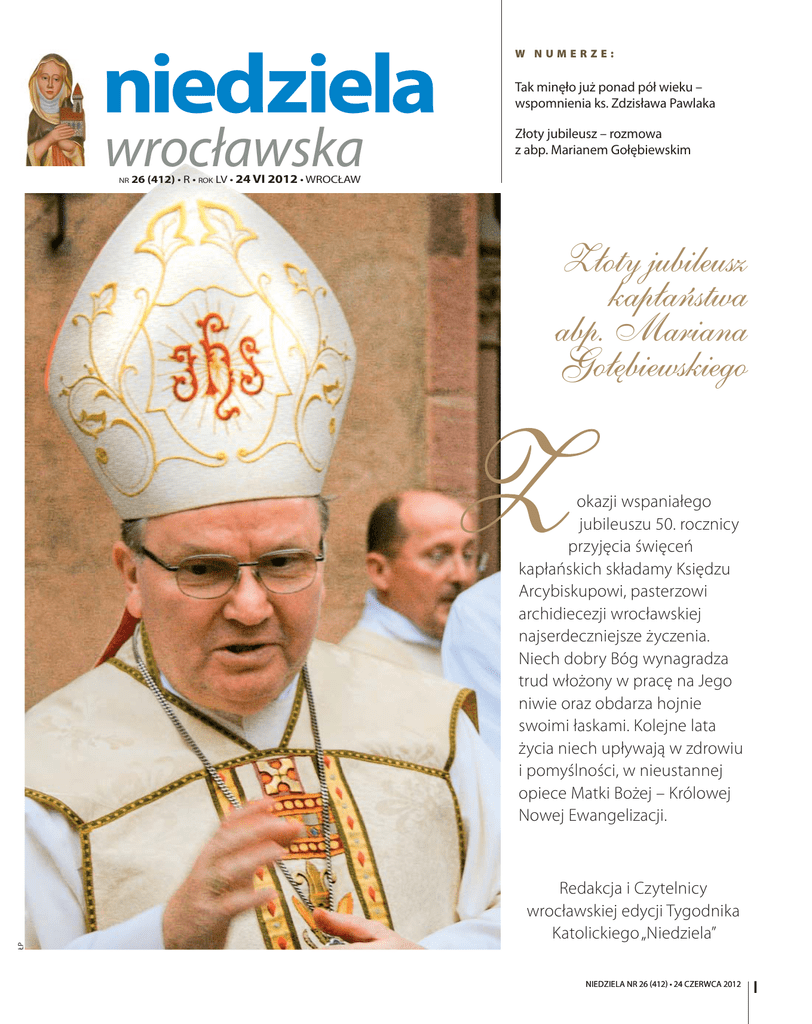 niedziela wrocławska NR W NUMERZE: Tak minęło już ponad pół wieku – wspomnienia ks. Zdzisława Pawlaka Złoty jubileusz – rozmowa z abp. Marianem Gołębiewskim 26 (412) • R • ROK LV • 24 VI 2012 • WROCŁAW Złoty jubileusz kapłaństwa abp. Mariana Gołębiewskiego okazji wspaniałego jubileuszu 50. rocznicy przyjęcia święceń kapłańskich składamy Księdzu Arcybiskupowi, pasterzowi archidiecezji wrocławskiej najserdeczniejsze życzenia. Niech dobry Bóg wynagradza trud włożony w pracę na Jego niwie oraz obdarza hojnie swoimi łaskami. Kolejne lata życia niech upływają w zdrowiu i pomyślności, w nieustannej opiece Matki Bożej – Królowej Nowej Ewangelizacji. ŁP Redakcja i Czytelnicy wrocławskiej edycji Tygodnika Katolickiego „Niedziela” NIEDZIELA NR 26 (412) • 24 CZERWCA 2012 I niedziela wrocławska Śląsk gra fair play JEDNYM Wrocław ZDANIEM DNI BRZEGU DOLNEGO I FESTYN PARAFIALNY MZ Nie tylko mistrzowie Polski, wrocławski „Śląsk” grają fair play, ale to samo można powiedzieć o Zespole Pieśni i Tańca „Śląsk”. Ten ambasador polskiej kultury wystąpił w specjalnym koncercie pt. „Śląsk gra fair play” inaugurującym we Wrocławiu „Duchowe Zaplecze Euro 2012”. W oklaskiwanym gorąco programie „Śląsk” wykonał m.in. takie utwory jak „Bogurodzica”, „Ave Maria” „Głęboka studzienka” i „Gdybym to ja miała”. Koncert poprzedziła Msza św. pod przewodnictwem metropolity wrocławskiego abp. Mariana Gołębiewskiego. W homilii ks. prał. Marian Biskup podkreślił, że w sporcie zawarty jest olbrzymi, pozytywny potencjał, ponieważ – jak mówił bł. Jan Paweł II – ujawnia on nie tylko bogate możliwości fizyczne człowieka, ale także jego zdolności intelektualne i duchowe. Inspirowani nauczaniem bł. Jana Pawła II chcemy dotrzeć do duszy tej popularnej dyscypliny sportowej, dotrzeć do duszy „Euro 2012” – akcentował ks. M. Biskup. Honorowy patronat nad przedsięwzięciem przygotowanym przez Wydział Programów Katolickich i Patriotycznych PSE POLEST, Wrocławską Wszystkim mecenasom i wykonawcom koncertu podziękował za to wspaniałe duchowe przedsięwzięcie ks. prał Marian Biskup Kurię Metropolitalną, Bazylikę Garnizonową pw. św. Elżbiety sprawowali: abp Marian Gołębiewski i konsul honorowy Ukrainy we Wrocławiu Grzegorz Dzik, a medialny Katolickie Radio Rodzina i „Niedziela Wrocławska”. MZ Euro 2012 Wrocław UM WROCŁAW Trzykrotnie: 8, 12 i 16 czerwca na Stadionie Miejskim we Wrocławiu spoczywał wzrok nie tylko polskich, ale Stadion Miejski we Wrocławiu szczelnie wypełniał się fanami piłki nożnej – podobnie jak strefy kibica i europejskich kibiców. Wszystko za sprawą trzech meczów rozgrywanych w stolicy Dolnego Śląska: Rosja – Czechy, Czechy – Grecja i Polska – Czechy. Atmosferę Turnieju we Wrocławiu czuć można jednak nadal w strefie kibica, która działać będzie do samego końca rozgrywek, czyli do meczu finałowego, który odbędzie się 1 lipca. Organizatorzy zdecydowali się także powiększyć strefę i mecz Polska – Czechy obejrzeć można było również m.in. na ul. Świdnickiej, przy kościele św. Marii. Zgodnie z oczekiwaniami, kibiców zza granicy spotkać można nie tylko podczas oglądania meczów, ale także podczas zwiedzania Wrocławia. Jak podaje UM Wrocławia, powołując się na badania prowadzone przez firmę PBS, zagraniczni kibice wysoko oceniają atmosferę, organizację i bezpieczeństwo podczas Mistrzostw we Wrocławiu. Ponad połowa respondentów deklaruje chęć przyjazdu na Dolny Śląsk w ciągu najbliższych 3 lat. Czterech na pięciu badanych poleci przyjazd do Wrocławia swoim znajomym. MP Dni Brzegu Dolnego nieodłącznie są związane z organizowanym od 10 lat festynem parafialnym. W pierwszych dwóch dniach odbywały się koncerty, zawody sportowe oraz gry i zabawy dla dzieci. W trzeci dzień natomiast zorganizowano festyn parafialny z inicjatywy ks. Jacka Włostowskiego, proboszcza parafii pw. NMP Królowej Polski. Mieszkańcy mieli m.in. okazję wysłuchać minirecitalu ks. proboszcza. Dzieci uczestniczyły w licznych konkursach, a także same chętnie prezentowały swoje talenty na scenie. Cały dochód z festynu został przeznaczony na potrzeby parafii. „WOLONTARIAT W TEORII I PRAKTYCE” Coraz więcej osób w różnym wieku, zarówno dzieci, młodzież jak i osoby starsze, decydują się na bycie wolontariuszem. Takiej bezinteresownej pomocy potrzebuje wiele instytucji, które nie potrafią z niej korzystać. Aby propagować ideę wolontariatu, zorganizowano szkolenie dla jednostek samorządowych i instytucji, które ukazało możliwości wykorzystania nieodpłatnej pomocy. Spotkanie pokazało przede wszystkim aspekty prawne wolontariatu a także sposoby organizowania go w różnych instytucjach. Dwudniowe szkolenie zorganizowano we Wrocławskim Centrum Wolontariatu. DNI WOŁOWA II ŚWIĘTO MIASTA I NOWE LOGO POWIATU STARE PO NOWEMU Środa Śląska Strzelin W strefie kibica, przy atrakcjach dla dzieci i dorosłych, występie kabaretowym Formacji Chatelet oraz muzyce w wykonaniu Ivana Komarenko, zespołu Golden Life i Marka Sierockiego mieszkańcy Środy Śląskiej oraz goście świętowali Dni Miasta. W dniach od 8 do 10 czerwca średzki rynek wypełnił się przygotowanymi atrakcjami. Nie zabrakło także okazji do sprawdzenia swoich możliwości w grze w piłkę nożną o puchar Burmistrza Środy Śląskiej. W mieście rozstrzygnięto również konkurs na logo powiatu średzkiego. 6 czerwca Zarząd Powiatu zatwierdził wybrany przez jury projekt logo, którym odtąd powiat średzki będzie się posługiwał. MP Z całej Polski przyjechali do Strzelina uczestnicy 12. edycji Ogólnopolskich Spotkań z Piosenką„Stare po nowemu”. Wśród 65 młodych wykonawców prezentujących się 10 czerwca na scenie w Parku Miejskim najlepsza okazała się Aleksandra Krzyżańska z Gniechowic, której jury