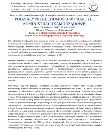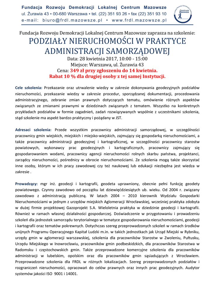 Fundacja Rozwoju Demokracji Lokalnej Centrum Mazowsze zaprasza na szkolenie: PODZIAŁY NIERUCHOMOŚCI W PRAKTYCE ADMINISTRACJI SAMORZĄDOWEJ Data: 28 kwietnia 2017, 10:00 - 15:00 Miejsce: Warszawa, ul. Żurawia 43 Cena: 349 zł przy zgłoszeniu do 14 kwietnia. Rabat 10 % dla drugiej osoby z tej samej Instytucji. Cele szkolenia: Przekazanie oraz utrwalenie wiedzy w zakresie dokonywania geodezyjnych podziałów nieruchomości, przekazanie wiedzy w zakresie procedur, sporządzanej dokumentacji, procedowania administracyjnego, zebranie zmian prawnych dotyczących tematu, omówienie różnych aspektów związanych ze zmianami prawnymi w dziedzinach związanych z tematem. Wszystko na konkretnych przykładach podziałów w formie zagadnień, zadań rozwiązywanych wspólnie z uczestnikami szkolenia, stąd szkolenie ma aspekt bardzo praktyczny i pożądany w JST. Adresaci szkolenia: Przede wszystkim pracownicy administracji samorządowej, w szczególności pracownicy gmin wiejskich, miejskich i miejsko-wiejskich, zajmujący się gospodarką nieruchomościami, a także pracownicy administracji geodezyjnej i kartograficznej, w szczególności pracownicy starostw powiatowych, wykonawcy prac geodezyjnych i kartograficznych, pracownicy zajmujący się gospodarowaniem wodami, pracownicy agencji nieruchomości rolnych skarbu państwa, projektanci, zarządcy nieruchomości, pośrednicy w obrocie nieruchomościami. Ze szkolenia mogą także skorzystać inne osoby, którym w ich pracy zawodowej czy też naukowej lub edukacji niezbędna jest wiedza w zakresie . Prowadzący: mgr inż. geodezji i kartografii, geodeta uprawniony, obecnie pełni funkcję geodety powiatowego. Czynny zawodowo od początku lat dziewięćdziesiątych ub. wieku. Od 2004 r. związany zawodowo z administracją publiczną. W latach 2004 – 2010 kierownik Wydziału Gospodarki Nieruchomościami w jednym z urzędów miejskich Aglomeracji Wrocławskiej, wcześniej praktyka zdobyta w dużej firmie projektowej Gazoprojekt S.A. Wieloletnia praktyka w dziedzinie geodezji i kartografii. Również w ramach własnej działalności gospodarczej. Doświadczenie w przygotowaniu i prowadzeniu szkoleń dla jednostek samorządu terytorialnego w tematyce gospodarowania nieruchomościami, geodezji i kartografii oraz tematów pokrewnych. Dotychczas szereg przeprowadzonych szkoleń w ramach środków unijnych Programu Operacyjnego Kapitał Ludzki m.in. w takich jednostkach jak Urząd Miejski w Rybniku, urzędy gmin w aglomeracji warszawskiej, szkolenia dla pracowników Starostw w Zwoleniu, Pułtusku, Urzędu Miejskiego w Inowrocławiu, pracowników gmin podbeskidzkich, dla pracowników Starostwa w Radomsku i częstochowskich gmin. Także przeprowadzone komercyjne szkolenia dla pracowników administracji w lubelskim, opolskim oraz dla pracowników gmin sąsiadujących z Wrocławiem. Przeprowadzone szkolenia dla FRDL w różnych lokalizacjach. Szereg przeprowadzonych podziałów i rozgraniczeń nieruchomości, opracowań do celów prawnych oraz innych prac geodezyjnych. Audytor systemów jakości ISO 9001 i 14001. Program szkolenia: 1. Pojęcie podziału nieruchomości , podziały nieruchomości w trybie rolnym a podziały zatwierdzane decyzjami administracyjnymi, kompetencje organów administracji, podział administracyjny a podział sądowy. 2. Kto może wystąpić o podział nieruchomości, jak prawidłowo powinien być sporządzony wniosek o podział, opiniowanie (postanowienie administracyjne) podziału, treść decyzji administracyjnej zatwierdzającej projekt podziału, jakie elementy powinna zawierać mapa z projektem podziału? 3. W jaki sposób i jakim trybem podzielić nieruchomość położoną na terenach objętych różnymi funkcjami w planie? 4. Limit powierzchniowy 0,3000 ha ograniczający podziały nieruchomości ujęty w Ustawie z dnia 21 sierpnia 1997 roku o gospodarce nieruchomościami; warunek przeniesienia własności nieruchomości w ciągu 6 miesięcy. 5. Tryb postępowania przy wydzielaniu działek pod drogi publiczne w oparciu o art. 98 Ustawy. 6. Jak przygotować decyzję warunkową i co oznacza termin „dostęp do drogi publicznej”? 7. Podziały nieruchomości niezależnie od planu miejscowego w trybie art. 95 Ustawy. 8. Podziały nieruchomości zabudowanych. 9. Podziały w przypadku braku planu miejscowego i decyzji o warunkach zabudowy. 10. Wydzielenia nieruchomości pod tzw. cel publiczny, co jest celem publicznym? 11. Podział a opłata adiacencka. 12. Przyjęcie granic w trakcie podziału nieruchomości na podstawie ustawy z 1997 r. 13. Podział nieruchomości a warunki usytuowania obiektów budowlanych. 14. Podziały nieruchomości a Prawo Wodne. Ustalenia granic wód a podziały działek ewidencyjnych. 15. Ograniczenia obrotu gruntami rolnymi, nowe regulacje ustawowe a tzw. podziały rolne nieruchomości. 16. Różne przykłady praktyczne podziałów nieruchomości, omówienie przykładów własnych, praktyczne rozwiązania. ZGŁOSZENIE PODZIAŁY NIERUCHOMOŚCI W PRAKTYCE ADMINISTRACJI SAMORZĄDOWEJ Data: 28 kwietnia 2017, 10:00 - 15:00 Miejsce: Warszawa, ul. Żurawia 43 Cena: 349 zł przy zgłoszeniu do 14 kwietnia. Rabat 10 % dla drugiej osoby z tej samej Instytucji. Nabywca: ....................................................................................................................................... Adres:............................................................................................................................................. NIP: ................................................................................................................................................ Odbiorca (opcjonalnie): .................................................................................................................. Adres:............................................................................................................................................. L.p. Imię i nazwisko Wydział tel