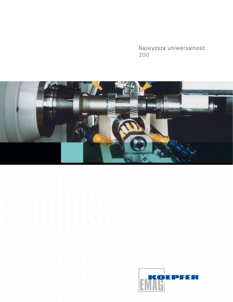 Najwyższa uniwersalność 200 Najwyższa uniwersalność +V Podstawowa konstrukcja obrabiarki 200 +W Wersja 200 frezarki obwiedniowej łączy +C´ najnowszy rozwój technologii z +Y +B maksymalną uniwersalnością i elastycznością. +A Osiem osi CNC modelu 200 pozwala +Z +X wykonywać wszystkie możliwe operacje nacinania kół zębatych. Nie ważne, czy przedmioty są ładowanie ręcznie czy przez elastyczne systemy automatyzacji, model 200 jest odpowiedzią na zwiększenie zmienności przedmiotów. Różnorodność przedmiotów, zmniejszanie serii i wymaganie produkcji „just in time” czyni model 200 doskonałym wyborem do CNC-osie: A – ruch uchylny głowicy frezującej B –obroty freza C –obroty przedmiotu W–przesuw konika X –przesuw promieniowy głowicy frezującej Y –przesuw styczny freza Z –przesuw osiowy głowicy frezującej V –ruch podajnika portalowego Państwa produkcji kół zębatych. Łoże obrabiarki wykonano z granitu Unikalny KOEPFER koncept symetr ycznego mineralnego, co zapewnia najwyższą rozkładu sił skrawania zapewnia długą tr wałość stabilność statyczną, dynamiczną i obrabiarki z zachowaniem jakości przedmiotu. temperaturową. Zamknięta konstrukcja Ukośna konstrukcja głowicy frezerskiej ramowa eliminuje odkształcenia konika umożliwia idealny spływ wiórów w obróbce spowodowane dużymi siłami mocowania na sucho lub na mokro. i skrawania. Strefa obróbki Samosmarujące, bezpośrednie napędy przedmiotu i narzędzia zapewniają odpowiednią jakość przez cały okres pracy obrabiarki. Wrzeciono robocze z naprężonymi, precyzyjnymi łożyskami i z hydraulicznym systemem szybkiego mocowania, zapewniają pewne i dokładne uchwycenie przedmiotów typu koło lub wałek. Zacisk przez wrzeciono robocze za pomocą tulejki rozprężnej zapobiega naprężeniom w prowadnicach i łożyskach obrabiarki,co stanowi dużą zaletę dla przedmiotów o większych średnicach i z dużymi kątami nachylenia zębów. 2 E l ast yc z n a auto m at y z ac ja Kompaktowa ładowarka z elastycznym magazynem przedmiotów i systemem transportu do załadowania i wyładowania. Podstawą automatyzacji jest szybki KOEPFER portalowy system ładujący z chwytakami w kształcie V do przedmiotów. Zależnie od spektrum przedmiotów, dostępne są różne rodzaje magazynów na półfabrykaty i gotowe przedmioty, np. łańcuchowy, oscylacyjny, taśmowy. Rozwiązaniem standardowym jest szyna ładowana grawitacyjnie z rozładowującym przenośnikiem taśmowym. Zwielokrotniony podajnik i szyna zasilająca Pojemność magazynu może być znacznie zwiększona przez zastosowanie wielu szyn zasilających w symetr yczne komponenty, które staczają się grawitacyjnie. Przy wielu szynach stosujemy podwójne lub potrójne systemy podające. Liczba i ustawienia chwytaków są do wyboru i mogą być łatwo regulowane, przez co prawie nieskończone są możliwości ustawień do różnych długości i średnic ładowanych przedmiotów. Magazyn obiegowy o dużej pojemności Magazyny obiegowe o dużych pojemnościach umożliwiają pracę przez wiele godzin. Są one odpowiednie do przedmiotów typu koło lub wałek i są łatwo przestawiane. 3 Opcje Narzędzie pomocnicze może być w wersji pojedynczej lub podwójnej. Wersja podwójna umożliwia pozycjonowanie i gratowanie przedmiotów. Narzędzie pomocnicze, oprócz uchwytu do różnego typu narzędzi gratujących może być użyte do mocowania tłumika drgań (podpórki), czujników do automatycznego pozycjonowania lub do specjalnych aplikacji, np. napędzanego narzędzia gratującego. Ślimacznice mogą być wykonywane z posuwem freza promieniowym lub stycznym, szczególnie ślimacznice o dużym kącie spirali. Frez trzpieniowy jest mocowany w hydraulicznej, precyzyjnej tulejce zaciskowej. Opcje: Uchwyt do przedmiotów typu koło, zębatka, wałek Wał freza obwiedniowego Wyciąg mgły olejowej Hydrauliczna tulejka zaciskowa do trzpienia freza Wyciąg do obróbki na sucho Hydrauliczne, szybko mocujące urządzenie do przedmiotów i frezów Urządzenie gratujące (element tłumiący, uchwyt czujnika) w konfiguracji z pojedynczą lub podwójną głowicą Automatyczne usuwanie wiórów 4 Automatyczne ustawienie położenia przedmiotu do frezowania na twardo Oprogramowanie do specjalnych instrukcji, np. omijanie uszkodzonego fragmentu freza, pozycjonowanie, itp. Różne systemy ładowania magazynu dla półfabrykatów lub częściowo obrobionych przedmiotów P r z y k ł a dy z asto s owa ń Głowice i prędkości modelu 200 Maksymalna długość narzędzia 130mm z przesuwem 100mm, opcjonalnie 2.000 obr/min, 3.000 obr/min lub 5.000 obr/min. Uniwersalna głowica przesuwna do freza o maksymalnej długości 110 mm i przesuwie 70 mm do frezowania obwiedniowego kół i frezowania ślimaków jedno- i wielozwojnych Prawoskrętna głowica frezerska do frezowania jedno- i wielozwojnych ślimaków. Głowica szybkoobrotowa 11.000 obr/min, np. do szlifowania kół zębatych. 5 Panel st e rowa n i a Sterowanie frezarki obwiedniowej 200 wykorzystuje rozwiązania najnowszej generacji i charakter yzuje się: Panel dotykowy zamiast myszki lub klawiatury. Integralna pamięć programu o pojemności 1MB jest wystarczająca dla więcej niż 750 przedmiotów. Pulpit Windows typu „Look and Feel“ jest podobny do oprogramowania używanego w komputerach biurowych. Ciągły rozwój obszernego programu dialogowego KOEPFER, umożliwia tworzenie kompletnego programu w prosty i mądr y sposób. 6 Sterowanie umożliwia diagnozowanie z zewnątrz włącznie z dostępem online do sterowników przez pomoc techniczną KOEPFER. Dane techniczne Specyfikacja techniczna obrabiarki: Maks. moduł Maks. średnica przedmiotu 3 mm 120 mm 180 (automaty czne ładowanie) – przy ręcznym załadunku, średnica freza 32mm Maks. długość frezowania obwiedniowego mm 200 Maks. długość przedmiotu mm 300 Maks. prędkość wrzeciona roboczego obr/min 270 / 450 / 1.000 Maks. pręd