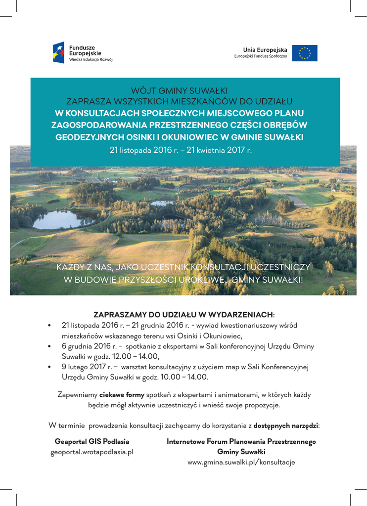 WÓJT GMINY SUWAŁKI ZAPRASZA WSZYSTKICH MIESZKAŃCÓW DO UDZIAŁU W KONSULTACJACH SPOŁECZNYCH MIEJSCOWEGO PLANU ZAGOSPODAROWANIA PRZESTRZENNEGO CZĘŚCI OBRĘBÓW GEODEZYJNYCH OSINKI I OKUNIOWIEC W GMINIE SUWAŁKI 21 listopada 2016 r. – 21 kwietnia 2017 r. KAŻDY Z NAS, JAKO UCZESTNIK KONSULTACJI UCZESTNICZY W BUDOWIE PRZYSZŁOŚCI UROKLIWEJ GMINY SUWAŁKI! • • • ZAPRASZAMY DO UDZIAŁU W WYDARZENIACH: 21 listopada 2016 r. – 21 grudnia 2016 r. - wywiad kwestionariuszowy wśród mieszkańców wskazanego terenu wsi Osinki i Okuniowiec, 6 grudnia 2016 r. – spotkanie z ekspertami w Sali konferencyjnej Urzędu Gminy Suwałki w godz. 12.00 – 14.00, 9 lutego 2017 r. – warsztat konsultacyjny z użyciem map w Sali Konferencyjnej Urzędu Gminy Suwałki w godz. 10.00 – 14.00. Zapewniamy ciekawe formy spotkań z ekspertami i animatorami, w których każdy będzie mógł aktywnie uczestniczyć i wnieść swoje propozycje. W terminie prowadzenia konsultacji zachęcamy do korzystania z dostępnych narzędzi: Geaportal GIS Podlasia geoportal.wrotapodlasia.pl Internetowe Forum Planowania Przestrzennego Gminy Suwałki www.gmina.suwalki.pl/konsultacje Internetowe Forum Planowania Przestrzeni Gminy Suwałki wraz z ankietą interaktywną to narzędzie konsultacyjne gminy Suwałki, służące m.in. do zbierania opinii i wniosków oraz zapoznania się z przygotowanymi materiałami. Samorządowy Panel SMS: po zapisaniu się do SYSTEMU POWIADAMIANIA SMS można otrzymywać informacje o poszczególnych etapach prowadzonych konsultacji – narzędzia dostępne na stronie www.gmina.suwalki.pl Zachęcamy do korzystania z Mapy Interaktywnej na portalu GIS Podlasia – w zakładce Planowanie przestrzenne należy wybrać powiat suwalski i gminę Suwałki – można tu zapoznać się z materiałami, złożyć wnioski, uwagi oraz wyrazić opinię geoportal.wrotapodlasia.pl CZEGO DOTYCZĄ KONSULTACJE? Konsultacje dotyczą terenów wsi Osinki i Okuniowiec o unikalnych krajobrazach, położonych na terenach chronionych i w bliskim sąsiedztwie terenów najwyższej ochrony. Zachodzi potrzeba ustalenia zasad zagospodarowania obszaru, z którego walorów korzystać będą wszyscy mieszkańcy nie tylko gminy. Zapraszamy do: • analizy zgromadzonych materiałów, • wysłuchania opinii ekspertów, • aktywnego uczestniczenia w konsultacjach, • przesyłania uwag, opinii, wniosków CEL KONSULTACJI? Chcemy poznać wszystkie pomysły dotyczące przyszłego zagospodarowania terenu w obrębie wsi Osinki i Okuniowiec i ich zgodności z prawem oraz z zaleceniami ekspertów. Chcemy zebrać pomysły, opinie i uwagi mające na celu wprowadzenie ładu do analizowanej przestrzeni. Chcemy wspólnie wypracować najlepsze rozwiązania i zaprojektować przestrzeń z uwzględnieniem walorów przyrodniczych terenów. Zapraszamy do współpracy! Bieżące informacje o konsultacjach są dostępne na stronie internetowej: www.geoportal.wrotapodlasia.pl oraz na stronie urzędu www.gmina.suwalki.pl lub u koordynatora procesu P. Alicji Jaworowskiej – Jurewicz tel. (87)5659346, e-mail:[email protected] Propozycje, opinie, wnioski i uwagi można wnosić również na adres Urząd Gminy Suwałki, ul. Świerkowa 45, 16-400 Suwałki lub na adres [email protected]