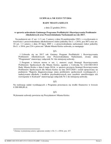 UCHWAŁA NR XXXV/737/2016 RADY MIASTA KIELCE z dnia 22 grudnia 2016 r. w sprawie uchwalenia Gminnego Programu Profilaktyki i Rozwiązywania Problemów Alkoholowych oraz Przeciwdziałania Narkomanii na rok 2017. Na podstawie art. 4¹ ust. 1-2 i ust. 5 ustawy z dnia 26 października 1982 r. o wychowaniu w trzeźwości i przeciwdziałaniu alkoholizmowi (tekst jednolity Dz.U. z 2016, poz.487) oraz art. 10 ust. 1-3 ustawy z dnia 29 lipca 2005 r. o przeciwdziałaniu narkomanii (tekst jednolity Dz.U. z 2016, poz.224 z pózn.zm.1))Rada Miasta Kielce uchwala, co następuje: § 1. 1. Uchwala się na 2017 rok Gminny Program Profilaktyki i Rozwiązywania Problemów Alkoholowych oraz Przeciwdziałania Narkomanii, zwany dalej "Programem" stanowiący załącznik Nr 1do niniejszej uchwały. 2. Program o którym mowa w ust. 1, stanowi część Strategii Rozwiązywania Problemów Społecznych dla Miasta Kielce, zgodnie z Uchwałą Nr LXI/1065/2014 Rady Miasta Kielce z dnia 8 maja 2014r. w sprawie przyjęcia Strategii Rozwiązywania Problemów Społecznych dla Miasta Kielce na lata 2014-2020 i został opracowany na podstawie "Raportu diagnostycznego stanu problemów społecznych wynikających z nadużywania alkoholu i środków psychoaktywnych oraz zasobów umożliwiające ich rozwiązanie w Kielcach" stanowiącego załącznik Nr 2 do niniejszej uchwały. § 2. Na realizację zadań wynikających z Programu przeznacza się środki finansowe w kwocie 4 500 000,00 zł. § 3. Wykonanie uchwały powierza się Prezydentowi Miasta Kielce. 1) Zmiany wymienionej ustawy ogłoszone zostały w Dz. U. z 2016r. poz. 437. Id: B0B8C16D-55C0-46F3-87A7-CDA5A7EA6BE7. Uchwalony Strona 1 § 4. Uchwała wchodzi w życie z dniem podjęcia. Przewodniczący Rady Miasta Kielce Dariusz Kozak Id: B0B8C16D-55C0-46F3-87A7-CDA5A7EA6BE7. Uchwalony Strona 2 Załącznik Nr 1 do Uchwały Nr XXXV/737/2016 Rady Miasta Kielce z dnia 22 grudnia 2016r. Gminny Program Profilaktyki i Rozwiązywania Problemów Alkoholowych oraz Przeciwdziałania Narkomanii Miasta Kielce na rok 2017 KIELCE 2016 Id: B0B8C16D-55C0-46F3-87A7-CDA5A7EA6BE7. Uchwalony Strona 3 ROZDZIAŁ I Ogólne cele programu §1 1. Ograniczenie procesu degradacji osób uzależnionych i ich rodzin oraz osób zagrożonych uzależnieniem od alkoholu i narkotyków, zwiększenie dostępności do terapii dla osób uzależnionych i współuzależnionych. 2. Zmniejszenie rozmiarów szkód zdrowotnych, psychologicznych i społecznych spowodowanych nadużywaniem alkoholu i przemocą w rodzinie oraz używaniem narkotyków. 3. Zwiększenie zasobów materialnych, metodycznych i organizacyjnych niezbędnych do rozwiązywania istniejących problemów związanych z uzależnieniami. 4. Rozwijanie i propagowanie modelu „Zdrowego, trzeźwego i dobrego życia” poprzez tworzenie systemu oddziaływań profilaktycznych w procesie wychowawczym dzieci i młodzieży, zwłaszcza młodzieży zagrożonej oraz młodych-dorosłych. 5. Zapewnienie mieszkańcom miasta Kielce możliwości uzyskania wsparcia oraz profesjonalnej pomocy w rozwiązywaniu problemów wynikających z nadużywania alkoholu, środków psychoaktywnych, przemocy w rodzinie oraz wychowywania się i egzystencji w rodzinie dysfunkcyjnej. Szczegółowe cele programu na rok 2017 §2 1. Rozwijanie działań mających na celu zwiększenie dostępności i poprawę skuteczności różnorodnych form terapii i pomocy dla osób uzależnionych współuzależnionych, dzieci z rodzin z problemem uzależnienia oraz dorosłych dzieci alkoholików. 2. Tworzenie i rozwijanie programów terapeutycznych dla małżeństw i rodzin z problemem uzależnienia oraz innymi dysfunkcjami. 3. Rozwijanie i ewaluacja oddziaływań interwencyjnych, edukacyjnych i profilaktycznych wśród dzieci, młodzieży i studentów oraz różnorodnych grup ryzyka. 4. Stworzenie bazy informacyjnej dla mieszkańców Kielc dotyczącej pomocy w zakresie interwencji, profilaktyki, terapii uzależnień i problemów przystosowawczych. 5. Monitorowanie przestrzegania prawa w zakresie sprzedaży i podawania napojów alkoholowych i wyrobów nikotynowych oraz edukacja sprzedawców. Cele programu opracowane zostały zgodnie z kierunkami określonymi w : - Narodowym Programie Profilaktyki Zdrowia na lata 2016 – 2020, - Strategii Rozwiązywania Problemów Społecznych Miasta Kielce na lata 2014-2020, - Gminnego Programu Przeciwdziałania Przemocy w Rodzinie na terenie miasta Kielce na lata 2014- 2020 oraz na podstawie „Raportu diagnostycznego stanu problemów społecznych wynikających z nadużywania alkoholu i środków psychoaktywnych oraz zasoby umożliwiające ich rozwiązywanie w Kielcach”. Id: B0B8C16D-55C0-46F3-87A7-CDA5A7EA6BE7. Uchwalony Strona 4 ROZDZIAŁ II Zadania i sposoby realizacji §3 Pomoc terapeutyczna i rehabilitacyjna dla osób z problemami uzależnień 1. Zadanie będzie realizowane w szczególności poprzez: a/ zajęcia umożliwiające odzyskiwanie funkcji społecznych, prowadzone w placówkach typu kluby abstynenckie, centra, czy kluby integracji i reintegracji społecznej oraz domy pomocy społecznej, gdzie przebywają osoby uzależnione, b/ zajęcia terapeutyczne, konsultacje psychologiczne i działania rehabilitacyjne dla osób z problemami uzależnienia oraz terapia dla sprawców przemocy prowadzone w szczególności w specjalistycznych ośrodkach terapeutycznych, c/ rozbudowę i wdrożenie programów pomocowych i terapeutycznych dla osób uzależnionych. d/ zajęcia oraz materiały edukacyjne uświadamiające młodym ludziom – potencjalnym rodzicom konsekwencje spożywania alkoholu przez kobiety w ciąży. Pomoc, diagnostyka i terapia dzieci z FASD. §4 Pomoc terapeutyczna, psychospołeczna i prawna dla członków rodzin z problemem uzależnień oraz ofiar przemocy w rodzinie 1. Zadanie będzie realizowane w szczególności poprzez: a/ zajęcia umożliwiające odzyskiwanie funkcji w placówkach specjalistycznych, klubach abstynenckich, społecznych, prowadzone b/ ko