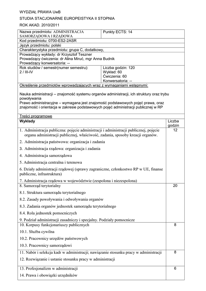 WYDZIAŁ PRAWA UwB STUDIA STACJONARNE EUROPEISTYKA II STOPNIA ROK AKAD. 2010/2011 Nazwa przedmiotu: ADMINISTRACJA Punkty ECTS: 14 SAMORZĄDOWA I RZĄDOWA Kod przedmiotu: 0700-ES2-2ASR Język przedmiotu: polski Charakterystyka przedmiotu: grupa C, dodatkowy, Prowadzący wykłady: dr Krzysztof Teszner Prowadzący ćwiczenia: dr Alina Miruć, mgr Anna Budnik Prowadzący konwersatoria: -Rok studiów / semestr(numer semestru): Liczba godzin: 120 2 / III-IV Wykład: 60 Ćwiczenia: 60 Konwersatoria: -Określenie przedmiotów wprowadzających wraz z wymaganiami wstępnymi: Nauka administracji – znajomość systemu organów administracji, ich struktury oraz trybu powoływania Prawo administracyjne – wymagana jest znajomość podstawowych pojęć prawa, oraz znajomość i orientacja w zakresie podstawowych pojęć administracji publicznej w RP Treści programowe Wykłady 1. Administracja publiczna: pojęcie administracji i administracji publicznej, pojęcie organu administracji publicznej, właściwość, zadania, sposoby kreacji organów. Liczba godzin 12 2. Administracja państwowa: organizacja i zadania 3. Administracja rządowa: organizacja i zadania 4. Administracja samorządowa 5. Administracja centralna i terenowa 6. Działy administracji rządowej (sprawy zagraniczne, członkostwo RP w UE, finanse publiczne, infrastruktura) 7. Administracja rządowa w województwie (zespolona i niezespolona) 8. Samorząd terytorialny 20 8.1. Struktura samorządu terytorialnego 8.2. Zasady powoływania i odwoływania organów 8.3. Zadania organów jednostek samorządu terytorialnego 8.4. Rola jednostek pomocniczych 9. Podział administracji zasadniczy i specjalny. Podziały pomocnicze 10. Korpusy funkcjonariuszy publicznych 8 10.1. Służba cywilna 10.2. Pracownicy urzędów państwowych 10.3. Pracownicy samorządowi 11. Nabór i selekcja kadr w administracji; nawiązanie stosunku pracy w administracji 8 12. Rozwiązanie i ustanie stosunku pracy w administracji 13. Profesjonalizm w administracji 14. Prawa i obowiązki urzędników 6 15. Europejskie standardy administrowania 16. Rola oceny pracowników administracji 6 17. Nadzór i kontrola administracji samorządowej i rządowej 18. Odpowiedzialność pracowników administracji Ćwiczenia / Konwersatoria 1. Administracja publiczna: pojęcie administracji i administracji publicznej, cechy, funkcje, cele i zadania administracji publicznej;analiza pojęć teoretycznych związanych z funkcjonowaniem administracji publicznej; struktura organizacyjna administracji publicznej w Polsce Liczba godzin 12 2. Rodowód i rys historyczny administracji publicznej ze szczególnym uwzględnieniem administracji publicznej w państwie prawa 3. Podstawy prawne działania administracji publicznej 4. Podmioty administracji publicznej: 4.1. Organ administracji publicznej (sposób kreacji, właściwość, kompetencja) 4.2. Zakład publiczny, samorząd oraz inne podmioty administrujące 5. Struktura administracji publicznej 5.1. Struktura pionowa (resort i działy administracji rządowej) 5.2. Struktura pozioma (podział terytorialny państwa, podział zasadniczy, pomocniczy i specjalny) 6. Związki między podmiotami administracji publicznej (centralizacja, decentralizacja, koncentracja, dekoncentracja, kontrola, nadzór, kierownictwo, współdziałanie, koordynacja) 7. Administracja rządowa 16 7.1. Centralne organy administrujące poza administracją rządową (Prezydent RP, organy podległe Prezydentowi RP, organy podległe Sejmowi) 7.2. Administracją rządowa na szczeblu centralnym: 7.2.1. Rada Ministrów (skład, sposób powołania, zadania, kompetencje) 7.2.2. Prezes Rady Ministrów 7.2.3. Ministrowie 7.3. Centralne organy administracji tzw. urzędy centralne; nietypowe jednostki organizacyjne administracji centralnej- np. agencje, fundusze celowe 7.4. Administracja rządowa w terenie 7.4.1. Administracja zespolona w województwie 7.4.2. Pozycja prawna wojewody 7.4.3. Organy administracji niezespolonej 8. Kolokwium 9. Samorząd terytorialny 9.1. Pojęcie i istota.Miejsce i rola samorządu terytorialnego w systemie administracji publicznej 9.2. Modele samorzadu terytorialnego. Polski model samorządu terytorialnego. 9.3.Podstawy prawne funkcjonowania samorządu terytorialnego 9.4. Samodzielność jednostek samorządu terytorialnego (podmiotowość prawna jst, godpodarowanie mieniem, samodzielność finansowa, stanowienie aktów prawa 2 16 miejscowego, samodzielność organizacyjna) 9.5.Ustrój samorządu terytorialnego w Polsce: zadania jednostek samorządu terytorialnego, organy stanowiące i wykonawcze jst (powoływanie, zadania, kompetencje) , odrębności uregulowań struktury samorządu powiatowego i wojewódzkiego, rola jednostek pomocniczych, charakter i funkcje samorządowych kolegiów odwoławczych w systemie organów samorządu terytorialnego 9.6. Status prawny radnego 9.7. Nadzór nad samorządem terytorialnym-istota nadzoru, organy sprawujace nadzór i środki nadzoru, sądowa kontrola aktów nadzoru 10. Korpusy funkcjonariuszy publicznych 8 10.1. Służba cywilna 10.2. Pracownicy urzędów państwowych 10.3. Pracownicy samorządowi 10.4. Nabór i selekcja kadr w administracji; nawiązanie,rozwiązanie i ustanie stosunku pracy w administracji 10.5.. Prawa i obowiązki urzędników 10.6. Profesjonalizm w administracji 10.7. Rola oceny pracowników administracji 10.8.Odpowiedzialność pracowników administracji 11. Instrumenty służące etycznemy zarządzaniu w administracji publicznej (rozwiązania antykorupcujne, oświadczenia majątkowe, zasada incompatibilitas, zasada jawności działania administracji publicznej) 4 12. Europejskie standardy administrowania 13.Prawna kontrola administracji samorządowej i rządowej 13.1.Pojęcie, zasięg, kryteria, zasady i rodzaje kontroli 13.2. System kontroli i jego elementy-kontrola parlamentarna, kontrola państwowa, kontrola sądowa, kontrola prokuratorska, kontrola społeczna 14. Kolokwium 2 Założenia i cele prze
