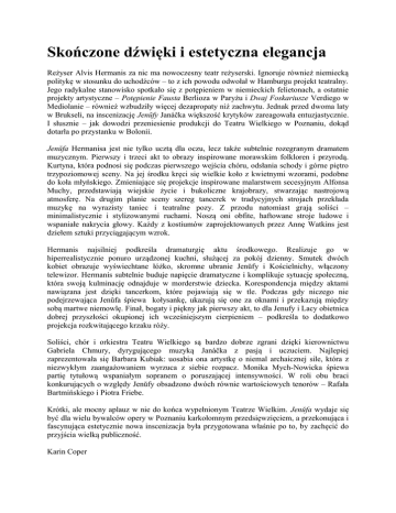 Skończone dźwięki i estetyczna elegancja Reżyser Alvis Hermanis za nic ma nowoczesny teatr reżyserski. Ignoruje również niemiecką politykę w stosunku do uchodźców – to z ich powodu odwołał w Hamburgu projekt teatralny. Jego radykalne stanowisko spotkało się z potępieniem w niemieckich felietonach, a ostatnie projekty artystyczne – Potępienie Fausta Berlioza w Paryżu i Dwaj Foskariusze Verdiego w Mediolanie – również wzbudziły więcej dezapropaty niż zachwytu. Jednak przed dwoma laty w Brukseli, na inscenizację Jenŭfy Janáčka większość krytyków zareagowała entuzjastycznie. I słusznie – jak dowodzi przeniesienie produkcji do Teatru Wielkiego w Poznaniu, dokąd dotarła po przystanku w Bolonii. Jenŭfa Hermanisa jest nie tylko ucztą dla oczu, lecz także subtelnie rozegranym dramatem muzycznym. Pierwszy i trzeci akt to obrazy inspirowane morawskim folkloren i przyrodą. Kurtyna, która podnosi się podczas pierwszego wejścia chóru, odsłania schody i górne piętro trzypoziomowej sceny. Na jej środku kręci się wielkie koło z kwietnymi wzorami, podobne do koła młyńskiego. Zmieniające się projekcje inspirowane malarstwem secesyjnym Alfonsa Muchy, przedstawiają wiejskie życie i bukoliczne krajobrazy, stwarzając nastrojową atmosferę. Na drugim planie sceny szereg tancerek w tradycyjnych strojach przekłada muzykę na wyrazisty taniec i teatralne pozy. Z przodu natomiast grają soliści – minimalistycznie i stylizowanymi ruchami. Noszą oni obfite, haftowane stroje ludowe i wspaniałe nakrycia głowy. Każdy z kostiumów zaprojektowanych przez Annę Watkins jest dziełem sztuki przyciągającym wzrok. Hermanis najsilniej podkreśla dramaturgię aktu środkowego. Realizuje go w hiperrealistycznie ponuro urządzonej kuchni, służącej za pokój dzienny. Smutek dwóch kobiet obrazuje wyświechtane łóżko, skromne ubranie Jenŭfy i Kościelnichy, włączony telewizor. Hermanis subtelnie buduje napięcie dramatyczne i komplikuje sytuację społeczną, która swoją kulminację odnajduje w morderstwie dziecka. Korespondencja między aktami nawiązana jest dzięki tancerkom, które pojawiają się w tle. Podczas gdy niczego nie podejrzewająca Jenŭfa śpiewa kołysankę, ukazują się one za oknami i przekazują między sobą martwe niemowlę. Finał, bogaty i piękny jak pierwszy akt, to dla Jenufy i Lacy obietnica dobrej przyszłości okupionej ich wcześniejszym cierpieniem – podkreśla to dodatkowo projekcja rozkwitającego krzaku róży. Soliści, chór i orkiestra Teatru Wielkiego są bardzo dobrze zgrani dzięki kierownictwu Gabriela Chmury, dyrygującego muzyką Janáčka z pasją i uczuciem. Najlepiej zaprezentowała się Barbara Kubiak: uosabia ona artystkę o niemal archaicznej sile, która z niezwykłym zaangażowaniem wyrzuca z siebie rozpacz. Monika Mych-Nowicka śpiewa partię tytułową wspaniałym sopranem o poruszającej intensywności. W roli obu braci konkurujących o względy Jenŭfy obsadzono dwóch równie wartościowych tenorów – Rafała Bartmińskiego i Piotra Friebe. Krótki, ale mocny aplauz w nie do końca wypełnionym Teatrze Wielkim. Jenŭfa wydaje się być dla wielu bywalców opery w Poznaniu karkołomnym przedsięwzięciem, a przekonująca i fascynująca estetycznie nowa inscenizacja była przygotowana właśnie po to, by zachęcić do przyjścia wielką publiczność. Karin Coper oryginalny tekst: http://www.opernnetz.de/Seiten/Aktuelle_Auffuehrungen/Poznan_Jenufa_Coper_160226.htm l