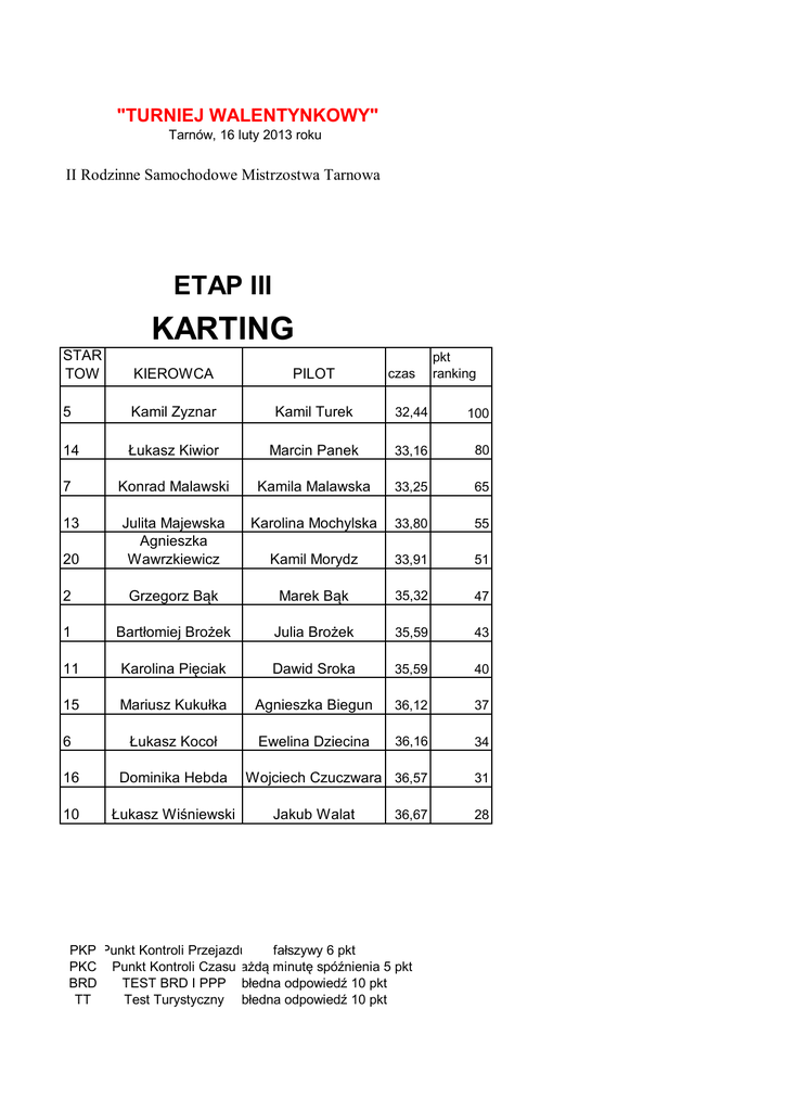 "TURNIEJ WALENTYNKOWY" Tarnów, 16 luty 2013 roku II Rodzinne Samochodowe Mistrzostwa Tarnowa ETAP III KARTING STAR TOW KIEROWCA PILOT 5 Kamil Zyznar Kamil Turek 32,44 100 14 Łukasz Kiwior Marcin Panek 33,16 80 7 Konrad Malawski Kamila Malawska 33,25 65 13 Karolina Mochylska 33,80 55 20 Julita Majewska Agnieszka Wawrzkiewicz Kamil Morydz 33,91 51 2 Grzegorz Bąk Marek Bąk 35,32 47 1 Bartłomiej Brożek Julia Brożek 35,59 43 11 Karolina Pięciak Dawid Sroka 35,59 40 15 Mariusz Kukułka Agnieszka Biegun 36,12 37 6 Łukasz Kocoł Ewelina Dziecina 36,16 34 16 Dominika Hebda Wojciech Czuczwara 36,57 31 10 Łukasz Wiśniewski Jakub Walat czas 36,67 PKP Punkt Kontroli Przejazdu fałszywy 6 pkt za każdą minutę spóźnienia 5 pkt PKC Punkt Kontroli Czasu BRD TEST BRD I PPP błedna odpowiedź 10 pkt TT Test Turystyczny błedna odpowiedź 10 pkt pkt ranking 28