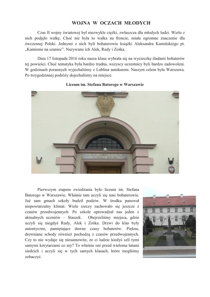 WOJNA W OCZACH MŁODYCH Czas II wojny światowej był niezwykle ciężki, zwłaszcza dla młodych ludzi. Wielu z nich podjęło walkę. Choć nie była to walka na froncie, miała ogromne znaczenie dla ówczesnej Polski. Jednymi z nich byli bohaterowie książki Aleksandra Kamińskiego pt. „Kamienie na szaniec”. Nazywano ich Alek, Rudy i Zośka. Dnia 17 listopada 2016 roku nasza klasa wybrała się na wycieczkę śladami bohaterów tej powieści. Choć tematyka była bardzo trudna, wszyscy uczestnicy byli bardzo zadowoleni. W godzinach porannych wyjechaliśmy z Lublina autokarem. Naszym celem była Warszawa. Po trzygodzinnej podróży dojechaliśmy na miejsce. Liceum im. Stefana Batorego w Warszawie Pierwszym etapem zwiedzania było liceum im. Stefana Batorego w Warszawie. Właśnie tam uczyli się nasi bohaterowie. Już sam gmach szkoły budził podziw. W środku panował niepowtarzalny klimat. Wiele rzeczy zachowało się jeszcze z czasów przedwojennych. Po szkole oprowadzał nas jeden z aktualnych uczniów – Staszek. Obejrzeliśmy miejsca, gdzie uczyli się niegdyś Rudy, Alek i Zośka. Drzwi do klas były autentyczne, pamiętające dawne czasy bohaterów. Piękne, drewniane schody również pochodzą z czasów przedwojennych. Czy to nie wydaje się niesamowite, że ci ludzie kiedyś szli tymi samymi korytarzami co my? To właśnie oni przed wieloma latami siedzieli i uczyli się w tych samych klasach, które mogliśmy zobaczyć. Aleja Szucha Po zwiedzeniu szkoły udaliśmy się na Aleję Szucha, gdzie w tamtym czasie znajdywała się siedziba gestapo. Wysłuchaliśmy tam bardzo ciekawego materiału dotyczącego tego, co działo się w tamtym budynku w czasach II wojny światowej. To właśnie tam przesłuchiwano i torturowano ludzi podejrzanych o działanie przeciwko Niemcom. Jedną z takich osób był Jan Bytnar – bohater naszej lektury. Parę informacji dopowiedział nam nasz pan przewodnik, po czym obejrzeliśmy cele i pomieszczenia, w których przetrzymywano osoby przesłuchiwane. Bardzo intrygujące są różne napisy lub znaki wydrapane w ścianach przez osoby, które były tam zatrzymane. Widzieliśmy także narzędzia, które służyły wtedy do torturowania bezbronnych osób. A więc zastanówmy się, jak bardzo brutalne musiały być tamte czasy? Pawiak Trzecim odwiedziliśmy, był miejsce, które w czasie funkcję więzienia. Do zachowała się tylko całości, ponieważ zniszczona przez powstania warszawskiego. Szacuje się, że przez więzienie na Pawiaku tysięcy ludzi. miejscem, które Pawiak. Jest to wojny pełniło naszych czasów nieliczna część większość została Niemców w czasie przeszło około 100 Obecnie znajduje się tam muzeum. Niestety nasza wycieczka miała możliwość obejrzenia tylko części z zachowanymi pamiątkami po więźniach oraz przedstawioną historią miejsca. Znajdywało się tam m.in. świadectwo bohatera lektury – Rudego. Bardzo ciekawą rzeczą znajdującą się na terenie muzeum jest rzeźba drzewa. Jest to pomnik ludzkiego cierpienia, który upamiętnia więźniów zamordowanych w Pawiaku. Mimo że zobaczyliśmy tylko tak niewielką część muzeum, oraz wysłuchaliśmy dosyć krótkiej opowieści przewodnika, zobaczenie tego było bardzo intrygującym doświadczeniem. Postawmy się na miejscu ludzi, którzy trafili na Pawiak. Czy na ich miejscy też bylibyśmy tak cierpliwi i odważni? Powązki Kolejnym punktem naszej wycieczki były Powązki – cmentarz, na którym są pochowani bohaterowie książki „Kamienie na szaniec” oraz inni zasłużeni w czasach II wojny światowej. Znaleźliśmy się tam, aby upamiętnić oraz zapalić znicze na grobach Rudego, Alka, Zośki, a także innych poległych i torturowanych przez okupantów. Z należytym szacunkiem oddaliśmy im cześć, za przyczynienie się do tego, że żyjemy dzisiaj w wolnej Polsce. Byli oni częścią czegoś wielkiego, byli przykładem odwagi i poświęcenia. Ilu z nas potrafiłoby się tak zachować? Muzeum Powstania Warszawskiego Naszym ostatnim punktem było Muzeum Powstania Warszawskiego. Na początku podzieliliśmy się na grupy. Wchodziły one po kolei w pewnym odstępie czasu. My weszliśmy jaki ostatni. Pan przewodnik zabrał nas w podróż po czasach II wojny światowej, szczególnie skupiając się na jednym z najważniejszych wydarzeń – powstaniu warszawskim. Dowiedzieliśmy się bardzo dużo o sposobach walki Polaków, o tym, jakiej broni używali, jak to wszystko było zorganizowane i ogółem – jak to wyglądało. Nasza grupa zwiedzających bardzo chętnie zbierała karty oraz karteczki z kalendarza powstania. Jest to bardzo przydatne, ponieważ są tam zapisane ważne informacje dotyczące danego dnia czy sytuacji. Jedną z lepszych atrakcji muzeum jest imitacja kanałów. Dzięki niej zwiedzający mogą doświadczyć tego, jak poruszali się Polacy w czasach okupacji. Można zajrzeć również do sali kinowej gdzie puszczany jest film 3D pokazujący jak wyglądała Warszawa po całkowitym zniszczeniu w latach 1944-1945. Muzeum Powstania Warszawskiego było zdecydowanie najciekawszym punktem. Pokazało nam bowiem świat wojny, jakiej jeszcze nie poznaliśmy. Ta wycieczka była wstrząsającym, ale niesamowitym doświadczeniem. Wynieśliśmy z niej dużo wartości i informacji. Zobaczyliśmy historię w znacznie ciekawszym wydaniu niż zdjęcia w podręczniku. Chociaż przez chwilę mogliśmy poczuć się częścią historii Polski – naszej historii. Sądzimy, że każdy, kto uczestniczył w tej wycieczce, pojął jak ważna jest znajomość przeszłości swojej ojczyzny. Każdy Polak, który jest przywiązany do swojego kraju, powinien udać się na taką wycieczkę, aby chociaż jednorazowo odczuć to, co przytrafiło się naszym rodakom. Uczniowie klasy 2 C: Kinga Figarska , Julia Warzocha, Dominika Zezula, Paulina Jabłońska, Magdalena Mazur, Michał Drewniak