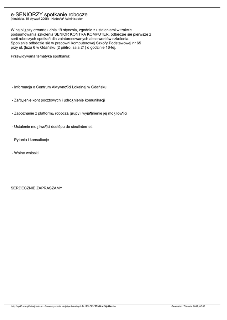 e-SENIORZY spotkanie robocze (niedziela, 15 styczeñ 2006) - Nades³a³ Administrator W najbli¿szy czwartek dnia 19 stycznia, zgodnie z ustaleniami w trakcie podsumowania szkolenia SENIOR KONTRA KOMPUTER, odbêdzie siê pierwsze z serii roboczych spotkañ dla zainteresowanych absolwentów szkolenia. Spotkanie odbêdzie siê w pracowni komputerowej Szko³y Podstawowej nr 65 przy ul. ¦luza 6 w Gdañsku (2 piêtro, sala 21) o godzinie 16-tej. Przewidywana tematyka spotkania: - Informacja o Centrum Aktywno¶ci Lokalnej w Gdañsku - Za³o¿enie kont pocztowych i udro¿nienie komunikacji - Zapoznanie z platform± robocz± grupy i wyja¶nienie jej mo¿liow¶ci - Ustalenie mo¿liwo¶ci dostêpu do sieciInternet. - Pytania i konsultacje - Wolne wnioski SERDECZNIE ZAPRASZAMY http://sp65.edu.pl/blizejcentrum - Stowarzyszenie Inicjatyw Lokalnych BLI¯EJ CENTRUM Powered w Gdañsku by Mambo Generated: 7 March, 2017, 00:48