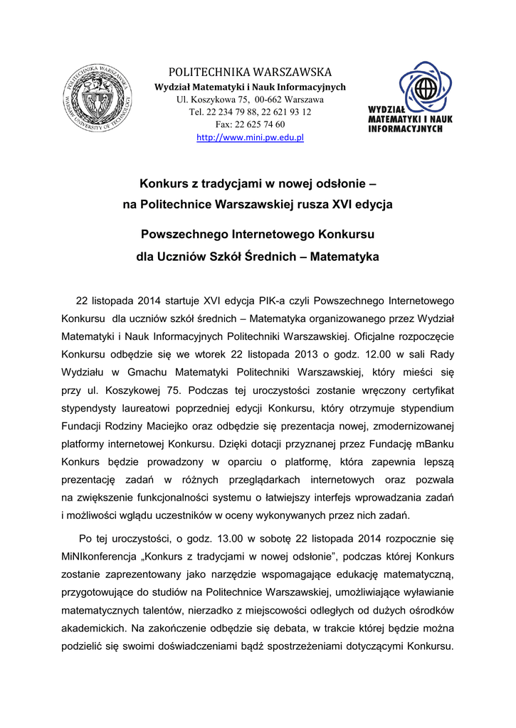 POLITECHNIKA WARSZAWSKA Wydział Matematyki i Nauk Informacyjnych Ul. Koszykowa 75, 00-662 Warszawa Tel. 22 234 79 88, 22 621 93 12 Fax: 22 625 74 60 http://www.mini.pw.edu.pl Konkurs z tradycjami w nowej odsłonie – na Politechnice Warszawskiej rusza XVI edycja Powszechnego Internetowego Konkursu dla Uczniów Szkół Średnich – Matematyka 22 listopada 2014 startuje XVI edycja PIK-a czyli Powszechnego Internetowego Konkursu dla uczniów szkół średnich – Matematyka organizowanego przez Wydział Matematyki i Nauk Informacyjnych Politechniki Warszawskiej. Oficjalne rozpoczęcie Konkursu odbędzie się we wtorek 22 listopada 2013 o godz. 12.00 w sali Rady Wydziału w Gmachu Matematyki Politechniki Warszawskiej, który mieści się przy ul. Koszykowej 75. Podczas tej uroczystości zostanie wręczony certyfikat stypendysty laureatowi poprzedniej edycji Konkursu, który otrzymuje stypendium Fundacji Rodziny Maciejko oraz odbędzie się prezentacja nowej, zmodernizowanej platformy internetowej Konkursu. Dzięki dotacji przyznanej przez Fundację mBanku Konkurs będzie prowadzony w oparciu o platformę, która zapewnia lepszą prezentację zadań w różnych przeglądarkach internetowych oraz pozwala na zwiększenie funkcjonalności systemu o łatwiejszy interfejs wprowadzania zadań i możliwości wglądu uczestników w oceny wykonywanych przez nich zadań. Po tej uroczystości, o godz. 13.00 w sobotę 22 listopada 2014 rozpocznie się MiNIkonferencja „Konkurs z tradycjami w nowej odsłonie”, podczas której Konkurs zostanie zaprezentowany jako narzędzie wspomagające edukację matematyczną, przygotowujące do studiów na Politechnice Warszawskiej, umożliwiające wyławianie matematycznych talentów, nierzadko z miejscowości odległych od dużych ośrodków akademickich. Na zakończenie odbędzie się debata, w trakcie której będzie można podzielić się swoimi doświadczeniami bądź spostrzeżeniami dotyczącymi Konkursu. Do udziału zapraszamy przede wszystkim nauczycieli. Z jednej strony tych, którzy są związani z Konkursem od lat i mogą podzielić się swoimi doświadczeniami. Z drugiej strony wszystkich, którzy myślą o poszerzeniu swoich działań edukacyjnych i chcieliby dowiedzieć się więcej o Konkursie. MiNIkonferencję organizujemy z myślą o pasjonatach matematyki i wszystkich zainteresowanych zastosowaniem nowych technologii w edukacji Zwycięzca i jego nauczyciel otrzymają sprzęt komputerowy ufundowany przez Rektora Politechniki Warszawskiej. Laureaci obecnej edycji Konkursu będą mieli zagwarantowany wolny wstęp w 2015 roku na Wydział Matematyki i Nauk Informacyjnych (5 osób na kierunek Informatyka i 15 na kierunek Matematyka), a wszyscy laureaci i wyróżnieni finaliści otrzymają w postępowaniu kwalifikacyjnym na dowolny inny wydział Politechniki Warszawskiej maksymalną liczbę punktów z matematyki. Już po raz piąty, Fundacja Rodziny Maciejko ufundowała stypendium dla najlepszego laureata Konkursu spoza dużego miasta, który podejmie studia na Wydziale Matematyki i Nauk Informacyjnych Politechniki Warszawskiej. Sponsorem konkursu jest Zibi CASIO a nagrody książkowe funduje Wydawnictwo Naukowe PWN. Konkurs uzyskał poparcie Ministerstwa Edukacji Narodowej oraz został objęty patronatem Programu Interkl@sa. Począwszy od obecnej edycji Konkurs zostanie objęty patronatem Stowarzyszenia Matematyki. Patronat medialny sprawuje portal kierunkistudiów.pl. Od tego roku sponsorem Konkursu został mBank, który ufundował stypendium w wysokości 1000 złotych miesięcznie dla najlepszego laureata Konkursu, który podejmie studia na Politechnice Warszawskiej. Fundacja mBanku przyznała Wydziałowi Matematyki i Nauk Informacyjnych Politechniki Warszawskiej dotację na modernizację i rozbudowę platformy internetowej Konkursu. Organizowany od 1999 roku Konkurs przeznaczony jest dla uczniów szkół ponadgimnazjalnych, głównie, lecz nie wyłącznie, klas maturalnych. Jego celem jest promocja młodych, utalentowanych matematycznie ludzi z całej Polski. Jest to przedsięwzięcie unikatowe w skali kraju, skierowane przede wszystkim do uczniów z miejscowości odległych od dużych ośrodków, mające z jednej strony pomóc w przygotowaniu się do matury, a z drugiej zachęcić do studiowania kierunków ścisłych. Spośród laureatów i osób wyróżnionych w poprzednich edycjach Konkursu około 2/3 studiuje lub studiowało na różnych wydziałach Politechniki Warszawskiej. Uczestnicy spoza dużych miast stanowią zwykle ok. 75% uczestników finału. Konkurs składa się z trzech etapów rozgrywanych poprzez Internet oraz finału odbywającego się na Politechnice Warszawskiej. Dwa pierwsze etapy polegają na zaznaczeniu właściwych wariantów odpowiedzi w zadaniach otrzymanych ze strony internetowej Konkursu. Zadania są losowane ze specjalnej bazy opracowanej i stale uzupełnianej przez zespół matematyków z Politechniki Warszawskiej we współpracy z nauczycielami szkół średnich. Po zdobyciu określonej liczby punktów uczestnik przechodzi do następnego etapu. W przypadku niepowodzenia może zacząć zabawę od początku, ponieważ do Konkursu można przystępować dowolną liczbę razy i w dowolnym momencie jego trwania. W trzecim etapie, który trwa w tej edycji do 9 kwietnia 2015, uczestnik losuje zestaw 10 zadań i przesyła je wraz z pełnymi rozwiązaniami tradycyjną pocztą na adres organizatora. Około 150 osób z najlepszymi wynikami z tego etapu zakwalifikuje się do finału, który będzie miał miejsce 18 kwietnia 2015 roku na Politechnice Warszawskiej. W ciągu 3 godzin jego uczestnicy będą rozwiązywać 5 zadań o dość znacznym stopniu trudności. Uroczyste zakończenie konkursu oraz rozdanie nagród i wyróżnień odbędzie się 28 kwietnia 2015 roku. Większość zadań konkursowych nie wykracza swoją tematyką poza zakres treści programowych szkoły ponadgimnazjalnej. Nie są to jednak typowe zadania szkolne