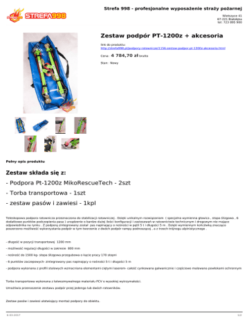 Strefa 998 - profesjonalne wyposażenie straży pożarnej Wietszyce 41 67-221 Białołęka tel: 723 895 900 Zestaw podpór PT-1200z + akcesoria link do produktu: http://strefa998.pl/podpory-ratownicze/1156-zestaw-podpor-pt-1200z-akcesoria.html Cena: 4 784,70 zł brutto Stan: Nowy Pełny opis produktu Zestaw składa się z: - Podpora Pt-1200z MikoRescueTech - 2szt - Torba transportowa - 1szt - zestaw pasów i zawiesi - 1kpl Teleskopowa podpora ratownicza przeznaczona do stabilizacji ratowniczej . Dzięki unikalnym rozwiązaniom ( specjalna wymienna głowica , stopa ślizgowa , 6 dodatkowe punktów podczepienia pasa ) urządzenie o bardzo dużej ilości konfiguracji i zastosowań w ratownictwie technicznym i drogowym nie mające odpowiednika na rynku . Z podporą zintegrowany został pas napinający o nośności w pętli 5 t i długości 5 m . Dzięki wymiennym końcówką znacząco poszerzono możliwość wykorzystania podpór w tym tworzenie z dwóch podpór rampy podnoszącej , a z trzech trójnogu alpinistycznego . - długość w pozycji transportowej 1200 mm - możliwość regulacji długości w zakresie 800 mm - nośność do 1500 kg- stopa ślizgowa przegubowa o kącie pracy 170 stopni - 6 punktów zaczepowych- zintegrowany pas napinający o nośności 5 t i długości 5 m - podpora wykonana z profili stalowych wzmacniana elementami ciętymi laserem- całość cynkowana galwanicznie i częściowo malowana powłokami ochronnym Torba transportowa wykonana z łatwozmywalnego materiału PCV o wysokiej wytrzymałości. Umożliwia przenoszenie zestawu podpór przej jedengo lub dwóch ratowników. Zestaw pasów i zawiesi ułatwiający montaż podpory do obiektu. 6-03-2017 1/2 Istnieje możliwość rozszerzenia zestawu o hak typu J o dużym prześwicie. 6-03-2017 2/2