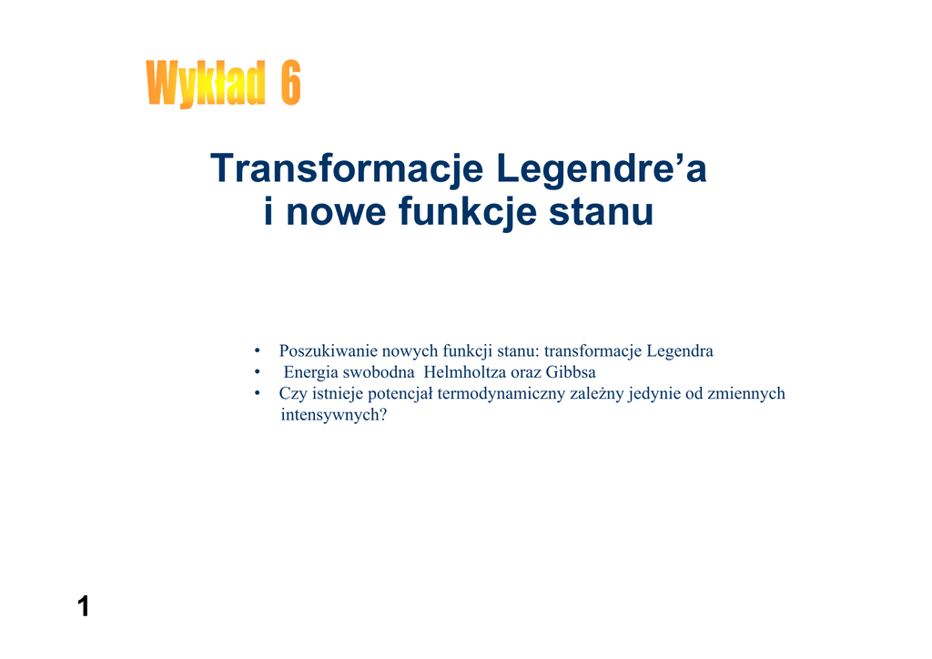 Transformacje Legendre’a i nowe funkcje stanu • • • 1 Poszukiwanie nowych funkcji stanu: transformacje Legendra Energia swobodna Helmholtza oraz Gibbsa Czy istnieje potencjał termodynamiczny zależny jedynie od zmiennych intensywnych? Z dotychczasowych rozważań wyodrębniliśmy 2 funkcje stanu: èèè D W praca nieobjętościowa dU = 2 ∂U ∂S dS + T = ∂U ∂S ∂U ∂V dV + , -p = ∂U ∂V ∂U ∂ xi dxi + ... , .... dU = TdS - pdV + Xi dxi + mj dNi i j S = S U, V, xi , N j dS = dS = 1 T 3 1 T dU + ∂S ∂U = p T dV - ∂U , T i ∂S dU + ∂S Xi ∂V p T = dxi - dV + ∂S ∂V mj , .... j ∂S ∂ xi T dNi dxi + ... U S, V, xi , Nj S U, V, xi , Nj TS - pV + = = SdT - Vdp + 1 T U + p T V - xi dXi + i i Xi xi Xi i T + xi - j m j Ni mj j T Ni Nj dmj = 0 j Problemy z energetyczną bądź entropową reprezentacją: •Ekstensywne parametry wewnętrzne układu odgrywają rolę niezależnych zmiennych stanu •Jest to przeciwieństwo praktyki, np. w laboratorium fizyki o wiele łatwiej mierzyć i kontrolować parametry intensywne, takie jak T czy p 4 Powstaje więc pytanie: Czy można tak przeformułować formalizm dla U bądź S, aby rolę parametrów niezależnych pełniły niektóre parametry intensywne, będące pochodnymi U (bądź S) np. ∂ U T = ∂S bądź -p = ∂U ∂V •Pytanie, które się pojawia można więc sformułować w następujący sposób: 5 Przypuśćmy, że y = y x0 , x1 , ..., xn df Xk = ∂y ∂ xk y= U lub S Czy pochodne można rozważać jako zmienne niezależne? tzn. Czy można znaleźć inne funkcje stanu (zależne od Xk ), bez straty informacji zawartej w fundamentalnej relacji y = y(….) Taki alternatywny opis mógłby potencjalnie uprościć analizę konkretnych problemów fizycznych. 6 Rozwiązaniem powyższego problemu jest technika tzw. Transformacji Legendre’a Dla prostoty rozważymy na początek funkcję jednej zmiennej niezależnej: y y= y x [x,y] X= x 7 dy dx y=y x ∫y x X ? Chwila refleksji pokazuje, że zwyczajne zastąpienie x przez X jest niedobre, bowiem tracimy matematyczną informację zawartą w oryginalnej funkcji. dy Z geometrycznego punktu widzenia znajomość X = dx nie pozwala zrekonstrułować wyjściowej krzywej. Powód: cała rodzina krzywych przesuniętych równolegle ma tą samą pochodną: y 8 x Rozwiązanie problemu otrzymamy zauważając, że krzywa na płaszczyźnie może być równie dobrze reprezentowana na dwa sposoby: (a) Jako zbiór punktów o współrzędnych [ x, y(x) ], bądź jako (b) obwiednia rodziny stycznych do krzywej y x 9 x, y ∫ X= dy dx , y (x,y) X= 0, y 10 dy dx î związek y = y X selekcjonuje podzbiór wszystkich możliwych prostych X, y, takich że ich obwiednia odtwarza oryginalną krzywą X, y ñ x, y y X y x (x,y) (0, y) dy dx 0, y dy dx =X = X= y-y x-0 , lub, rozwiązując na y y : transformacja Legendre' a 11 y = y - Xx Przykład Rozważmy parabolę. W reprezentacji x, y dana jest przez : y = 1 4 x2 Ta sama parabola w reprezentacji y dana jest przez X= dy = dx 1 2 x y = y - Xx = 2 y = -X 12 1 4 î x= 2X 2 x - Xx = 1 4 4 X2 - X ◊ 2 X = - X2 Przypuśćmy, że chcielibyśmy rozwiązać problem odwrotny: znając y = y X chcielibyśmy odzyskać y = y x y = y - Xx î dy = dy - X dx - x dX = - x dX X dx fi -x = dy dX Stosując zatem ponownie transformację Legendre' a : é y = y- X 13 dy dX odtwarzamy y î relacja pomiędzy x, y oraz X, y jest symetryczna ze względu na transformację Legendre' a z relacją = y - X -x = y + X x = y - X x + X x = y odwrotną. (Zadanie: proszę sprawdzić dla poprzednio omawianej paraboli, że istotnie tak jest) y = y x dy X = dx y = y - dy x = y - X x dx eliminacja x, y daje y = y X y = y X dy -x = dX dy y = yX = y - X -x = y + X x dX eliminacja X, y daje y = y x Uogólnienie na funkcje wielu zmiennych- trywialne; Tr. L. stosujemy sukcesywnie. 14 dy yXx X dx Utożsamimy obecnie fundamentalną relację y = y(x) np. z U = U S, V, xi , Nj dU = TdS - pdV + T.L. 15 i Xi dxi + j mj dNi S T : potencjał Helmholtza (energia swobodna Helmholtza) F U = U S, V, xi, Nj T = ∂U ∂S F = U - TS tr. L eliminuję U i S F = F T, V, x , N i j dF = dU - TdS - SdT = -SdT - pdV + ... F = F T, V, xi, Nj ∂F -S = ∂T U = F - T -S = F + TS eliminuję F i T U = U S, V, xi, Nj dU = dF + TdS + SdT + … = TdS - pdV Najbardziej znaną transformacją Legendre’a jest tr. F zastępująca V przez p. Prowadzi ona do potencjału Gibbsa lub energii swobodnej Gibbsa ( oznaczanej przez G) F = F T, V, xi, Nj dF = -SdT - pdV + Xi dxi + mj dNi i -p = j ∂F ∂V G = F - -p V = F + pV dG = dF + pdV + Vdp = -SdT + Vdp + Xi dxi + mj dNi i 16 j UWAGA: G można otrzymać z U jako tr. Legendre’a zamieniającą parę (S,V) na (T,p) [ G = F + pV = U –TS +pV] lub z entalpii zamieniając S na T (G = U – TS + pV = H – TS) Można definiować dalsze transformaty Legendre’a, np. ze względu na zmienne sprzężone: xi, Xi Każda z takich relacji dostarcza nowego potencjału termodynamicznego, w pełni równoważnego U bądź S. Podobne transformaty można oczywiście stosować do entropii – otrzymamy tzw. potencjały termodynamiczne Massieu 17 U S, V, xi , Nj TS - pV + = S U, V, xi , Nj = 1 T U + p T V - i Xi xi Xi i T xi - j m j Ni + mj j T Ni Czy istnieje potencjał termodynamiczny zależny jedynie od zmiennych intensywnych? y = y T, p, Xj , mk ? NIE!!! Sekwencja transformat Legendre’a zastosowana do U lub S prowadzi do: y = 0 18 dy = SdT - Vdp + xi dXi + Nj dmj = 0 rel. Gibbsa - Duhema i j 19 Entalpia H: Transformacja Legendre’a U zamieniająca V na p (jako zmienną niezależną) U = U S, V, xi, Nj TdS - pdV + Xi dxi + mj dNi dU = i -p = j ∂U ∂V H = U - V -p = U + pV eliminując U i V otrzymamy H = H S, p, xi, Nj dH = dU + pdV + Vdp = TdS + Vdp + ... 20 Niektóre funkcje stanu w naturalnych zmiennych i związane z nimi tożsamości krzyżowe (do analizy na ćwiczeniach) U = U S, V, N dU = TdS - pdV + mdN F = F T, V, N dF = -SdT - pdV + mdN 21 ∂ T ∂ p S, V = - ∂ V S,N ∂ S V