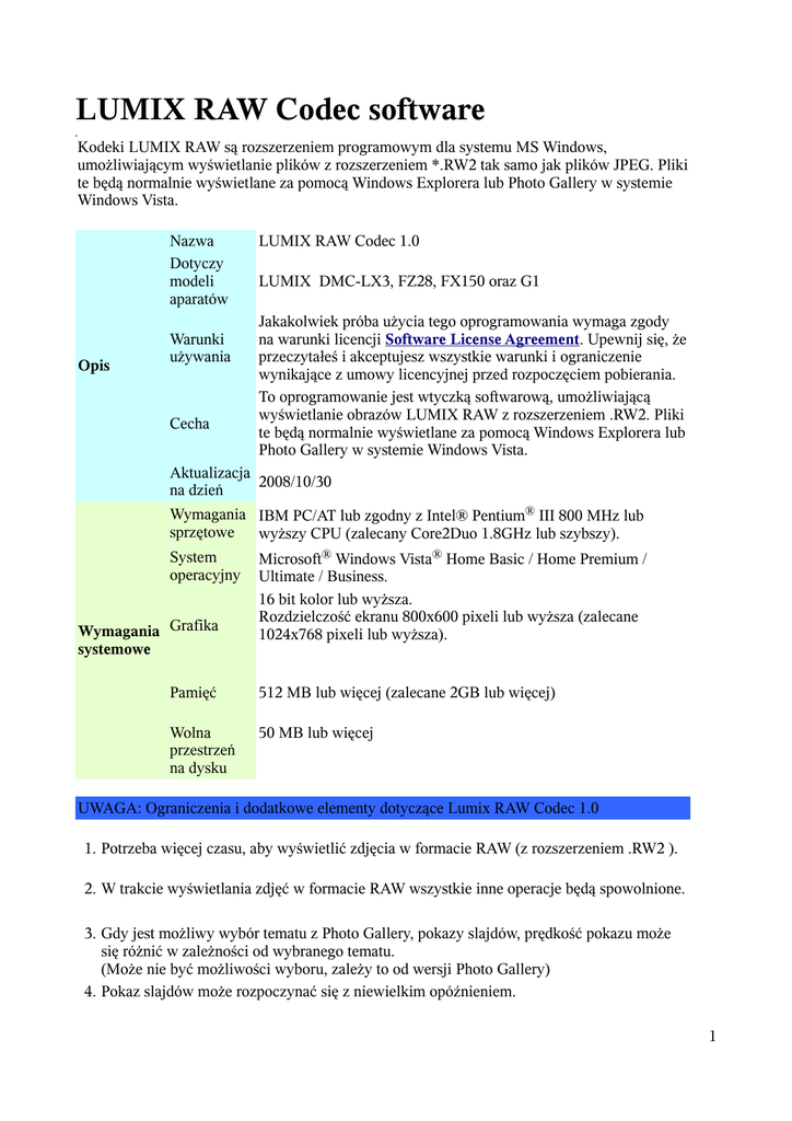 LUMIX RAW Codec software Kodeki LUMIX RAW są rozszerzeniem programowym dla systemu MS Windows, umożliwiającym wyświetlanie plików z rozszerzeniem *.RW2 tak samo jak plików JPEG. Pliki te będą normalnie wyświetlane za pomocą Windows Explorera lub Photo Gallery w systemie Windows Vista. Nazwa Dotyczy modeli aparatów Opis Warunki używania Cecha LUMIX RAW Codec 1.0 LUMIX DMC-LX3, FZ28, FX150 oraz G1 Jakakolwiek próba użycia tego oprogramowania wymaga zgody na warunki licencji Software License Agreement. Upewnij się, że przeczytałeś i akceptujesz wszystkie warunki i ograniczenie wynikające z umowy licencyjnej przed rozpoczęciem pobierania. To oprogramowanie jest wtyczką softwarową, umożliwiającą wyświetlanie obrazów LUMIX RAW z rozszerzeniem .RW2. Pliki te będą normalnie wyświetlane za pomocą Windows Explorera lub Photo Gallery w systemie Windows Vista. Aktualizacja 2008/10/30 na dzień Wymagania IBM PC/AT lub zgodny z Intel® Pentium® III 800 MHz lub sprzętowe wyższy CPU (zalecany Core2Duo 1.8GHz lub szybszy). System Microsoft® Windows Vista® Home Basic / Home Premium / operacyjny Ultimate / Business. 16 bit kolor lub wyższa. Rozdzielczość ekranu 800x600 pixeli lub wyższa (zalecane Wymagania Grafika 1024x768 pixeli lub wyższa). systemowe Pamięć 512 MB lub więcej (zalecane 2GB lub więcej) Wolna przestrzeń na dysku 50 MB lub więcej UWAGA: Ograniczenia i dodatkowe elementy dotyczące Lumix RAW Codec 1.0 1. Potrzeba więcej czasu, aby wyświetlić zdjęcia w formacie RAW (z rozszerzeniem .RW2 ). 2. W trakcie wyświetlania zdjęć w formacie RAW wszystkie inne operacje będą spowolnione. 3. Gdy jest możliwy wybór tematu z Photo Gallery, pokazy slajdów, prędkość pokazu może się różnić w zależności od wybranego tematu. (Może nie być możliwości wyboru, zależy to od wersji Photo Gallery) 4. Pokaz slajdów może rozpoczynać się z niewielkim opóźnieniem. 1 5. W Photo Gallery nie można zapisać w formacie RAW zdjęcia które zostało obrócone. 6. Zdjęcia oglądane w Windows Explorer nie mogą być obracane. 7. W zależności od ustawień systemu operacyjnego na danym komputerze, pewne funkcjonalności programu Photo Gallery takie jak tworzenie filmów moga nie działać. 8. Oprogramowanie nie jest zgodne z 64-bitowymi systemami operacyjnymi. Wszelkie prawa do oprogramowania jego instalatora oraz treści zawartych na tej stronie (włącznie z uwagami o wydaniu) należą do Panasonic Corporation. Niedozwolone jest ich nielegalne kopiowanie i przesyłanie w całości lub częściowo. To oprogramowanie wraz opisem może być użytkowane wyłącznie na warunkach licencji wyświetlanej podczas instalacji. Warunki licencji moga ulec zmianie bez podawania informacji. Software License Agreement Aktualizacje 2008/10/ Możliwość pobrania i instalacji LUMIX RAW Codec 1.0 umożliwiający obsługę 30 plików RAW (z rozszerzeniem .RW2) w aparatach LUMIX DMC-LX3, FZ28, FX150, G1 Procedura instalacji Aby pobrać Lumix RAW Codec software wymagana jest zgoda na warunki licencji oprogramowania Software License Agreement. Pobranie tego oprogramowania będzie traktowane jako zgoda na wszystkie warunki zawarte w umowie licencyjnej Software License agreement. Proszę się upewnić w kwestii akceptacji tych warunków przed dokonaniem pobrania plików. Utwórz katalog tymczasowy do którego zostanie pobrany plik instalatora oprogramowania. 1. (np. C:/Temp) 2. Kliknij poniżej przycisk [Pobierz] i zapisz plik w przygotowanym wcześniej katalogu. W celu wykonania instalacji pobranego pliku musi być on uruchamiony jako administrator lub jako użytkownik z uprawnieniami administratora. Jeśli nie jesteś zalogowany jako administrator (lub jako użytkownik z prawami administratora), wybierz plik, kliknij prawym przyciskiem myszy, aby otworzyć podręczne menu, wybierz "Uruchom jako administrator". (Proszę odnieść się poniżej do zrzut ekranu). 3. 4. Kliknij dwukrotnie pobrany plik, aby uruchomić instalatora. Jak pojawi się kreator instalacji, postępuj zgodnie z instrukcjami wyświetlanymi na ekranie. Upewnij się, aby potwierdzić wszystkie warunki umowy licencyjnej software License Agreement . Umowa licencyjna oprogramowania będzie wyświetlona w trakcie instalacji. Proszę kontynuować instalację tylko jeśli zgadzasz się z warunkami umowy. Jeżeli nie zgadzasz się ze wszystkimi warunkami, nie możesz zainstalować oprogramowania. 2 LUMIX_RAW_Codec_V10L015_Eng.exe / 16,552,944 bytes Microsoft ® Windows Vista ® są znakami towarowymi grupy firm Microsoft. Inne nazwy, nazwy firm i nazwy produktów etc. zamieszczone na tej stronie a także w instalatorze oprogramowania (włącznie z uwagami o wydaniu) są znakami towarowymi lub zastrzeżonymi znakami towarowymi odpowiednich firm. 3