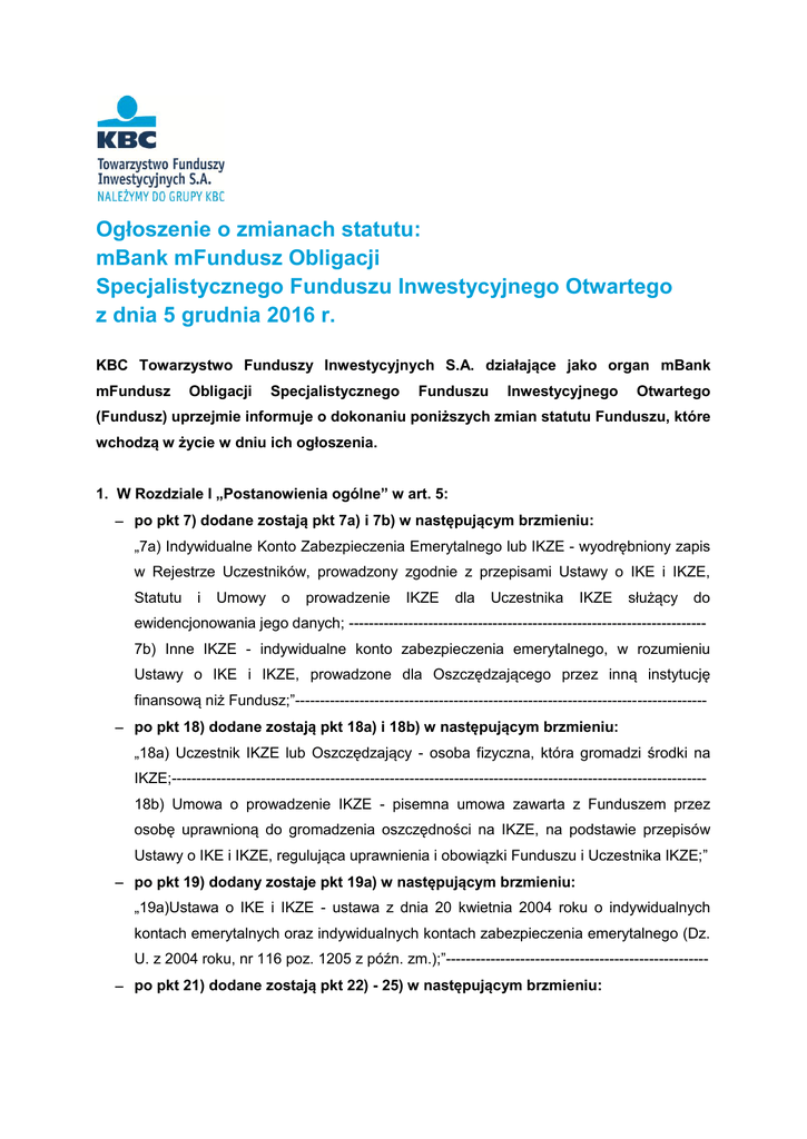 Ogłoszenie o zmianach statutu: mBank mFundusz Obligacji Specjalistycznego Funduszu Inwestycyjnego Otwartego z dnia 5 grudnia 2016 r. KBC Towarzystwo Funduszy Inwestycyjnych S.A. działające jako organ mBank mFundusz Obligacji Specjalistycznego Funduszu Inwestycyjnego Otwartego (Fundusz) uprzejmie informuje o dokonaniu poniższych zmian statutu Funduszu, które wchodzą w życie w dniu ich ogłoszenia. 1. W Rozdziale I „Postanowienia ogólne” w art. 5: po pkt 7) dodane zostają pkt 7a) i 7b) w następującym brzmieniu: „7a) Indywidualne Konto Zabezpieczenia Emerytalnego lub IKZE - wyodrębniony zapis w Rejestrze Uczestników, prowadzony zgodnie z przepisami Ustawy o IKE i IKZE, Statutu i Umowy o prowadzenie IKZE dla Uczestnika IKZE służący do ewidencjonowania jego danych; -----------------------------------------------------------------------7b) Inne IKZE - indywidualne konto zabezpieczenia emerytalnego, w rozumieniu Ustawy o IKE i IKZE, prowadzone dla Oszczędzającego przez inną instytucję finansową niż Fundusz;”---------------------------------------------------------------------------------- po pkt 18) dodane zostają pkt 18a) i 18b) w następującym brzmieniu: „18a) Uczestnik IKZE lub Oszczędzający - osoba fizyczna, która gromadzi środki na IKZE;-----------------------------------------------------------------------------------------------------------18b) Umowa o prowadzenie IKZE - pisemna umowa zawarta z Funduszem przez osobę uprawnioną do gromadzenia oszczędności na IKZE, na podstawie przepisów Ustawy o IKE i IKZE, regulująca uprawnienia i obowiązki Funduszu i Uczestnika IKZE;” po pkt 19) dodany zostaje pkt 19a) w następującym brzmieniu: „19a)Ustawa o IKE i IKZE - ustawa z dnia 20 kwietnia 2004 roku o indywidualnych kontach emerytalnych oraz indywidualnych kontach zabezpieczenia emerytalnego (Dz. U. z 2004 roku, nr 116 poz. 1205 z późn. zm.);”---------------------------------------------------- po pkt 21) dodane zostają pkt 22) - 25) w następującym brzmieniu: „22) Wpłata transferowa - przeniesienie środków zgromadzonych przez Oszczędzającego z Innego IKZE, przeniesienie środków zgromadzonych przez Oszczędzającego na indywidualnym koncie emerytalnym lub indywidualnym koncie zabezpieczenia emerytalnego osoby zmarłej, jeżeli Oszczędzający jest osobą uprawnioną do otrzymania zgromadzonych środków w związku z jej śmiercią oraz inne przypadki, o których mowa w Regulaminie IKZE;--------------------------------------------------23) Wypłata - wypłata jednorazowa albo wypłata w ratach środków zgromadzonych na IKZE następująca na wniosek Oszczędzającego po spełnieniu warunków określonych w Ustawie o IKE i IKZE lub na wniosek osoby uprawnionej - w przypadku śmierci Oszczędzającego;”-----------------------------------------------------------------------------------------24) Wypłata transferowa:---------------------------------------------------------------------------a. przeniesienie środków zgromadzonych przez Oszczędzającego na Inne IKZE Oszczędzającego, ---------------------------------------------------------------------------------b. przeniesienie środków zgromadzonych przez Oszczędzającego na Inne IKZE prowadzone na rzecz osoby uprawnionej; ---------------------------------------------------25) Zwrot - wycofanie całości środków zgromadzonych na IKZE, a w przypadku gdy Oszczędzający gromadzi środki na podstawie umów zawartych z różnymi funduszami inwestycyjnymi, zarządzanymi przez Towarzystwo, całości środków zgromadzonych w tych funduszach, jeżeli nie zachodzą przesłanki do Wypłaty bądź Wypłaty transferowej.”------------------------------------------------------------------------------------------------- 2. W Rozdziale I „Postanowienia ogólne” po art. 6 dodany zostaje art. 6a w następującym brzmieniu: „Artykuł 6a [Zasady prowadzenia Indywidualnych Kont Zabezpieczenia Emerytalnego] ----------------------------------------------------------------------------------------------1. Fundusz może zbywać Jednostki Uczestnictwa w ramach prowadzenia IKZE. -----------2. Warunkiem zbywania przez Fundusz Jednostek Uczestnictwa w ramach prowadzenia IKZE jest zawarcie przez osobę zamierzającą gromadzić środki na IKZE Umowy z Funduszem o prowadzenie IKZE. ---------------------------------------------------------------------3. Osoby uprawnione do zawarcia Umowy o prowadzenie IKZE oraz gromadzenia oszczędności na IKZE określają przepisy Ustawy o IKE i IKZE obowiązujące w dniu zawarcia Umowy. Osobami uprawnionymi do zawarcia Umowy o prowadzenie IKZE są osoby fizyczne, które ukończyły 16 lat. ------------------------------------------------------------- -4. Regulamin IKZE stanowiący integralną część Umowy o prowadzenie IKZE określa zasady funkcjonowania IKZE, w tym obowiązki i uprawnienia Funduszu oraz Uczestnika IKZE, w związku z gromadzeniem oszczędności na IKZE. Określa on w szczególności:1) kwestie warunków gromadzenia oszczędności na IKZE, -- ------------------------------------2) sposób oznaczenia dyspozycji dotyczących oszczędności gromadzonych na IKZE, 3) sposób postępowania Funduszu, w przypadku gdy suma wpłat dokonanych przez Uczestnika IKZE w danym roku kalendarzowym przekroczy maksymalną wysokość wpłat dopuszczalnych przez Ustawę o IKE i IKZE,--------------------------------------------4) zakres, częstotliwość i formę informowania Uczestnika IKZE o środkach zgromadzonych na IKZE, ----------------------------------------------------------------------------5) terminy dokonania Wypłaty, w tym wypłaty w ratach, Wypłaty transferowej oraz Zwrotu, ---------------------------------------------------------------------------------------------------6) zasady dokonywania wpłat na IKZE, w tym wysokość wpłat minimalnych, -----------7) warunki wypłaty w ratach, ---------------------------------------------------------------------