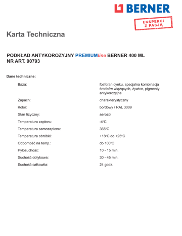 Karta Techniczna PODKŁAD ANTYKOROZYJNY PREMIUMline BERNER 400 ML NR ART. 90793 Dane techniczne: Baza: fosforan cynku, specjalna kombinacja środków wiążących, żywice, pigmenty antykorozyjne Zapach: charakterystyczny Kolor: bordowy / RAL 3009 Stan fizyczny: aerozol Temperatura zapłonu: -4oC Temperatura samozapłonu: 365oC Temperatura obróbki: +18oC do +25oC Odporność na temp.: do 100oC Pyłosuchość: 10 - 15 min. Suchość dotykowa: 30 - 45 min. Suchość całkowita: 24 godz.