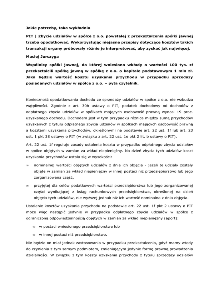Jakie potrzeby, taka wykładnia PIT | Zbycie udziałów w spółce z o.o. powstałej z przekształcenia spółki jawnej trzeba opodatkować. Wykorzystując niejasne przepisy dotyczące kosztów takich transakcji organy próbowały różnie je interpretować, aby zyskać jak najwięcej. Maciej Jurczyga Wspólnicy spółki jawnej, do której wniesiono wkłady o wartości 100 tys. zł przekształcili spółkę jawną w spółkę z o.o. o kapitale podstawowym 1 mln zł. Jaka będzie wartość kosztu uzyskania przychodu w przypadku sprzedaży posiadanych udziałów w spółce z o.o. – pyta czytelnik. Konieczność opodatkowania dochodu ze sprzedaży udziałów w spółce z o.o. nie wzbudza wątpliwości. Zgodnie z art. 30b ustawy o PIT, podatek dochodowy od dochodów z odpłatnego zbycia udziałów w spółkach mających osobowość prawną wynosi 19 proc. uzyskanego dochodu. Dochodem jest w tym przypadku różnica między sumą przychodów uzyskanych z tytułu odpłatnego zbycia udziałów w spółkach mających osobowość prawną a kosztami uzyskania przychodów, określonymi na podstawie art. 22 ust. 1f lub art. 23 ust. 1 pkt 38 ustawy o PIT (w związku z art. 22 ust. 1e pkt 2 lit. b ustawy o PIT). Art. 22 ust. 1f reguluje zasady ustalenia kosztu w przypadku odpłatnego zbycia udziałów w spółce objętych w zamian za wkład niepieniężny. Na dzień zbycia tych udziałów koszt uzyskania przychodów ustala się w wysokości: • nominalnej wartości objętych udziałów z dnia ich objęcia - jeżeli te udziały zostały objęte w zamian za wkład niepieniężny w innej postaci niż przedsiębiorstwo lub jego zorganizowana część, • przyjętej dla celów podatkowych wartości przedsiębiorstwa lub jego zorganizowanej części wynikającej z ksiąg rachunkowych przedsiębiorstwa, określonej na dzień objęcia tych udziałów, nie wyższej jednak niż ich wartość nominalna z dnia objęcia. Ustalenie kosztów uzyskania przychodu na podstawie art. 22 ust. 1f pkt 2 ustawy o PIT może więc nastąpić jedynie w przypadku odpłatnego zbycia udziałów w spółce z ograniczoną odpowiedzialnością objętych w zamian za wkład niepieniężny (aport): • w postaci wniesionego przedsiębiorstwa lub • w innej postaci niż przedsiębiorstwo. Nie będzie on miał jednak zastosowania w przypadku przekształcenia, gdyż mamy wtedy do czynienia z tym samym podmiotem, zmieniającym jedynie formę prawną prowadzenia działalności. W związku z tym koszty uzyskania przychodu z tytułu sprzedaży udziałów nabytych w wyniku przekształcenia spółki jawnej w spółkę z o.o. powinny zostać ustalone zgodnie z art. 23 ust. 1 pkt 38 ustawy o PIT. Właściwa podstawa... Artykuł 23 ust. 1 pkt 38 ustawy o PIT stanowi, że nie uważa się za koszty uzyskania przychodów wydatków na objęcie lub nabycie udziałów w spółce mającej osobowość prawną. Wydatki takie są jednak kosztem uzyskania przychodu z odpłatnego zbycia tych udziałów. Powołany artykuł wskazuje, że kosztem są wydatki poniesione na objęcie lub nabycie udziałów. Tym samym rozwiązaniem problemu czytelnika jest ustalenie, co było wydatkiem na objęcie lub nabycie udziałów w spółce z o.o. powstałej w wyniku przekształcenia spółki jawnej. ... ale jak ją stosować Logicznie rzecz biorąc, z ekonomicznego punktu widzenia sprawa wydaje się prosta. Wartość wkładów wniesionych do spółki jawnej na pewno jest kosztem uzyskania przychodów. W czasie trwania spółki jej wspólnicy ponosili wydatki na nabywanie poszczególnych składników jej majątku i wykorzystywali w tym celu środki finansowe, które podlegały opodatkowaniu podatkiem dochodowym u każdego wspólnika spółki jawnej na bieżąco, do momentu jej przekształcenia w spółkę z o.o. Całość majątku, zarówno wkład początkowy jak i część wygospodarowana w późniejszym okresie, tworzy następnie wartość majątku spółki z o.o., a więc w tym kontekście wartość jej udziałów. Gdyby zatem kosztem uzyskania przychodu przy sprzedaży udziałów w sp. z o.o. miała być jakaś inna wartość, niższa niż całkowita wartość majątku przekształconej spółki jawnej, mielibyśmy do czynienia z podwójnym opodatkowaniem przynajmniej części dochodu. Wydaje się oczywiste, że dochód do opodatkowania z tytułu sprzedaży udziałów w spółce z o.o. należy wyliczyć z uwzględnieniem kosztów uzyskania przychodu o wartości równej sumie wartości księgowej majątku przekształcanej spółki jawnej na dzień wpisania przekształcenia do KRS, pomniejszonej o wartość jej zobowiązań na ten dzień. Innymi słowy, kosztem uzyskania przychodów będzie wartość aktywów netto na dzień przekształcenia. Tak też twierdziły początkowo organy podatkowe, czego przykładem jest interpretacja Izby Skarbowej w Katowicach z 29 sierpnia 2008 r. (IBPBI/415-451/08/KB). Odwrót fiskusa... Jednak w wyniku coraz większego fiskalizmu to korzystne dla podatników stanowisko uległo zmianie, a wskazana interpretacja została uchylona. Niestety, brak przepisów opisujących wprost omawianą sytuację oraz nieustanna chęć wydrenowania kieszeni podatników przez fiskusa spowodowały, że opisane powyżej, logiczne i ekonomicznie uzasadnione podejście zaczęło ewoluować w kierunku bardzo niekorzystnym dla podatników. W pierwszej kolejności organy podatkowe stanęły na stanowisku, że kosztem uzyskania przychodu ze sprzedaży udziałów w spółce z o.o. będzie wartość majątku spółki jawnej do wysokości majątku przekazanego na kapitał zakładowy spółki z o.o. Innymi słowy, w przypadku sprzedaży udziałów spółki z o.o. powstałej w wyniku przekształcenia ze spółki jawnej, kosztami uzyskania przychodu będzie nominalna wartość udziałów w spółce kapitałowej. Taki pogląd znajdujemy m.in. w interpretacji Izby Skarbowej w Warszawie z 4 maja 2009 r. (IPPB1/415-105/08-2/AŻ). Okazało się jednak, że można iść jeszcze d