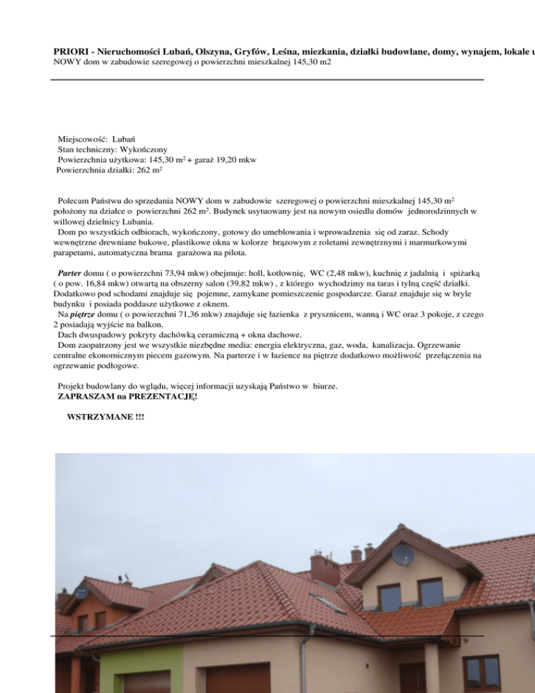 PRIORI - Nieruchomości Lubań, Olszyna, Gryfów, Leśna, miezkania, działki budowlane, domy, wynajem, lokale u NOWY dom w zabudowie szeregowej o powierzchni mieszkalnej 145,30 m2 Miejscowość: Lubań Stan techniczny: Wykończony Powierzchnia użytkowa: 145,30 m2 + garaż 19,20 mkw Powierzchnia działki: 262 m2 Polecam Państwu do sprzedania NOWY dom w zabudowie szeregowej o powierzchni mieszkalnej 145,30 m2 położony na działce o powierzchni 262 m2. Budynek usytuowany jest na nowym osiedlu domów jednorodzinnych w willowej dzielnicy Lubania. Dom po wszystkich odbiorach, wykończony, gotowy do umeblowania i wprowadzenia się od zaraz. Schody wewnętrzne drewniane bukowe, plastikowe okna w kolorze brązowym z roletami zewnętrznymi i marmurkowymi parapetami, automatyczna brama garażowa na pilota. Parter domu ( o powierzchni 73,94 mkw) obejmuje: holl, kotłownię, WC (2,48 mkw), kuchnię z jadalnią i spiżarką ( o pow. 16,84 mkw) otwartą na obszerny salon (39,82 mkw) , z którego wychodzimy na taras i tylną część działki. Dodatkowo pod schodami znajduje się pojemne, zamykane pomieszczenie gospodarcze. Garaż znajduje się w bryle budynku i posiada poddasze użytkowe z oknem. Na piętrze domu ( o powierzchni 71,36 mkw) znajduje się łazienka z prysznicem, wanną i WC oraz 3 pokoje, z czego 2 posiadają wyjście na balkon. Dach dwuspadowy pokryty dachówką ceramiczną + okna dachowe. Dom zaopatrzony jest we wszystkie niezbędne media: energia elektryczna, gaz, woda, kanalizacja. Ogrzewanie centralne ekonomicznym piecem gazowym. Na parterze i w łazience na piętrze dodatkowo możliwość przełączenia na ogrzewanie podłogowe. Projekt budowlany do wglądu, więcej informacji uzyskają Państwo w biurze. ZAPRASZAM na PREZENTACJĘ! WSTRZYMANE !!! strona 1 / 9 PRIORI - Nieruchomości Lubań, Olszyna, Gryfów, Leśna, miezkania, działki budowlane, domy, wynajem, lokale u NOWY dom w zabudowie szeregowej o powierzchni mieszkalnej 145,30 m2 strona 2 / 9 PRIORI - Nieruchomości Lubań, Olszyna, Gryfów, Leśna, miezkania, działki budowlane, domy, wynajem, lokale u NOWY dom w zabudowie szeregowej o powierzchni mieszkalnej 145,30 m2 strona 3 / 9 PRIORI - Nieruchomości Lubań, Olszyna, Gryfów, Leśna, miezkania, działki budowlane, domy, wynajem, lokale u NOWY dom w zabudowie szeregowej o powierzchni mieszkalnej 145,30 m2 strona 4 / 9 PRIORI - Nieruchomości Lubań, Olszyna, Gryfów, Leśna, miezkania, działki budowlane, domy, wynajem, lokale u NOWY dom w zabudowie szeregowej o powierzchni mieszkalnej 145,30 m2 strona 5 / 9 PRIORI - Nieruchomości Lubań, Olszyna, Gryfów, Leśna, miezkania, działki budowlane, domy, wynajem, lokale u NOWY dom w zabudowie szeregowej o powierzchni mieszkalnej 145,30 m2 strona 6 / 9 PRIORI - Nieruchomości Lubań, Olszyna, Gryfów, Leśna, miezkania, działki budowlane, domy, wynajem, lokale u NOWY dom w zabudowie szeregowej o powierzchni mieszkalnej 145,30 m2 strona 7 / 9 PRIORI - Nieruchomości Lubań, Olszyna, Gryfów, Leśna, miezkania, działki budowlane, domy, wynajem, lokale u NOWY dom w zabudowie szeregowej o powierzchni mieszkalnej 145,30 m2 strona 8 / 9 PRIORI - Nieruchomości Lubań, Olszyna, Gryfów, Leśna, miezkania, działki budowlane, domy, wynajem, lokale u NOWY dom w zabudowie szeregowej o powierzchni mieszkalnej 145,30 m2 strona 9 / 9