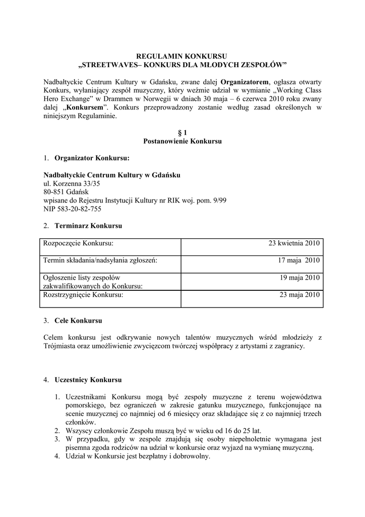 REGULAMIN KONKURSU „STREETWAVES– KONKURS DLA MŁODYCH ZESPOŁÓW” Nadbałtyckie Centrum Kultury w Gdańsku, zwane dalej Organizatorem, ogłasza otwarty Konkurs, wyłaniający zespół muzyczny, który weźmie udział w wymianie „Working Class Hero Exchange” w Drammen w Norwegii w dniach 30 maja – 6 czerwca 2010 roku zwany dalej „Konkursem”. Konkurs przeprowadzony zostanie według zasad określonych w niniejszym Regulaminie. §1 Postanowienie Konkursu 1. Organizator Konkursu: Nadbałtyckie Centrum Kultury w Gdańsku ul. Korzenna 33/35 80-851 Gdańsk wpisane do Rejestru Instytucji Kultury nr RIK woj. pom. 9/99 NIP 583-20-82-755 2. Terminarz Konkursu Rozpoczęcie Konkursu: 23 kwietnia 2010 Termin składania/nadsyłania zgłoszeń: 17 maja 2010 Ogłoszenie listy zespołów zakwalifikowanych do Konkursu: Rozstrzygnięcie Konkursu: 19 maja 2010 23 maja 2010 3. Cele Konkursu Celem konkursu jest odkrywanie nowych talentów muzycznych wśród młodzieży z Trójmiasta oraz umożliwienie zwycięzcom twórczej współpracy z artystami z zagranicy. 4. Uczestnicy Konkursu 1. Uczestnikami Konkursu mogą być zespoły muzyczne z terenu województwa pomorskiego, bez ograniczeń w zakresie gatunku muzycznego, funkcjonujące na scenie muzycznej co najmniej od 6 miesięcy oraz składające się z co najmniej trzech członków. 2. Wszyscy członkowie Zespołu muszą być w wieku od 16 do 25 lat. 3. W przypadku, gdy w zespole znajdują się osoby niepełnoletnie wymagana jest pisemna zgoda rodziców na udział w konkursie oraz wyjazd na wymianę muzyczną. 4. Udział w Konkursie jest bezpłatny i dobrowolny. §2 Zasady Konkursu 1. Przystąpienie do Konkursu 1. Warunkiem przystąpienia do Konkursu jest dostarczenie Organizatorowi płyty CD z 2. nagraniem materiału dźwiękowego z repertuaru Zespołu lub płyty DVD z fragmentem koncertu Zespołu, a także wypełnionego i podpisanego formularza zgłoszeniowego, który należy pobrać ze strony internetowej Organizatora www.nck.org.pl. 2. Wymagania techniczne: 1. Płyta CD / płyta DVD musi zawierać 2 utwory Zespołu nagrane w formacie: - pliki muzyczne w formacie mp3 (stereo, 44100Hz, 192 kbps lub powyżej) lub WAV (PCM 44100Hz, 16bit), - pliki filmowe w formacie avi, mpg lub DVD. 2. Zarówno płyta CD, jak i płyta DVD musi być opisana nazwą Zespołu i tytułami oraz nazwiskami autorów zawartych na niej utworów. 3. Jeśli Zespół posiada profesjonalnie wydaną płytę długogrającą lub EP, proszony jest o wskazanie dwóch utworów konkursowych. 3. Przyjmowanie zgłoszeń 1. Płytę CD lub płytę DVD opisaną, wraz z wypełnionym formularzem zgłoszeniowym, należy dostarczyć do siedziby Organizatora w nieprzekraczalnym terminie do dnia 17 maja 2010 r., do godziny 15.00, na adres: Nadbałtyckie Centrum Kultury w Gdańsku ul. Korzenna 33/35 80 - 851 Gdańsk z dopiskiem „Streetwaves” 2. Zgłoszenia, które doręczone zostaną na adres Organizatora po 17 maja 2010 r., nie wezmą udziału w Konkursie. 3. Płyta nie spełniająca wymagań technicznych i/lub dostarczona bez wypełnionego formularza zgłoszeniowego nie wezmie udziału w Konkursie. 4. Każdy z zespołów nadesłać może tylko jedno zgłoszenie. 5. Koszty nośników oraz przesyłki pokrywa zgłaszający. 4. Kwalifikacja uczestników do Konkursu 1. Na podstawie zgłoszeń spełniających kryteria formalne i techniczne Komisja kwalifikacyjna, o której mowa w § 3, dokona kwalifikacji do Konkursu dziesięciu najlepszych Zespołów, które zaprezentują się 23 maja 2010 roku podczas koncertu konkursowego, który odbędzie się na scenie plenerowej na Targu Węglowym od godziny 19.00 do godziny 21.00. 2. Spośród dwóch utworów zgłoszonych/wskazanych przez zespół Komisja wybierze jeden, który zostanie zaprezentowany przez Zespół zakwalifikowany do udziału w Koncercie konkursowym w dniu 23 maja 2010 roku. 3. Kryterium kwalifikacji do Konkursu będzie wartość artystyczna utworów, tj. ogólny poziom artystyczny prezentowanych utworów, dobór i oryginalność repertuaru, interpretacja, jakość techniczna wykonania oraz pomysł. 4. Organizator zastrzega sobie prawo do zmiany liczby zakwalifikowanych Zespołów. 5. Lista Zespołów zakwalifikowanych do konkursu zostanie ogłoszona na stronie www.nck.org.pl w dniu 19 maja 2010 r. Zakwalifikowane Zespoły zostaną powiadomione o tym fakcie telefonicznie lub e-mailem, zgodnie z danymi wskazanymi w formularzu zgłoszeniowym do Konkursu. 5. Rozstrzygnięcie Konkursu i sposób prezentacji 1. Zakwalifikowane do Konkursu Zespoły zaprezentują się podczas Koncertu konkursowego w dniu 23 maja 2010 roku, na plenerowej scenie muzycznej na Targu Węglowym w Gdańsku, w kolejności ustalonej przez Organizatora. 2. Prezentacja Zespołu obejmie wykonanie utworu wybranego przez Komisję. 3. Wszystkie prezentowane utwory muszą być wykonane przez Zespół „na żywo”. 4. Czas prezentacji nie może przekroczyć 6 min. 5. Organizator zapewni standardowy system nagłośnieniowy na scenie plenerowej. §3 Komisja kwalifikacyjna i Jury 1. Kwalifikacji do konkursu dokona Komisja kwalifikacyjna, w której skład wejdzie dwóch przedstawicieli Organizatora oraz jeden członek jury. 2. Członkowie Komisji kwalifikacyjnej wybiorą 10 najlepszych zespołów – uczestników koncertu konkursowego w drodze głosowania. Każdemu z członków Komisji przysługuje jeden głos. 3. Zwycięzca Konkursu zostanie wyłoniony przez 3-osobowe Jury Konkursu, w którego skład wejdzie dwóch lokalnych dziennikarzy muzycznych oraz jeden lokalny muzyk. 4. Członkowie Jury wybiorą najlepszy zespół w drodze głosowania. Każdemu z członków Jury przysługuje jeden głos. 5. Wszystkie decyzje Komisji kwalifikacyjnej i Jury są nieodwołalne. §4 Nagroda 1. Organizator, na podstawie decyzji Jury, przyzna jedną nagrodę główną. Nagrodzony Zespół wyjedzie na wymianę muzyczną „Working Class Hero Exchange” organizowaną w Drammen, w Norwegii w dniac