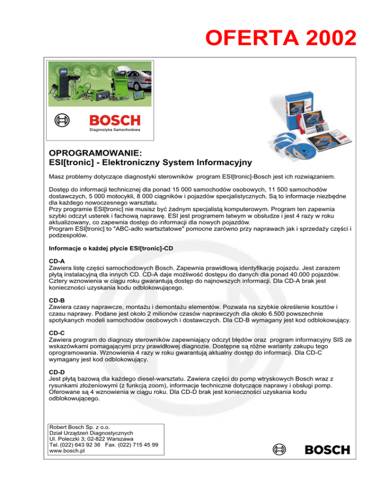 OFERTA 2002 OPROGRAMOWANIE: ESI[tronic] - Elektroniczny System Informacyjny Masz problemy dotycz¹ce diagnostyki sterowników program ESI[tronic]-Bosch jest ich rozwi¹zaniem. Dostêp do informacji technicznej dla ponad 15 000 samochodów osobowych, 11 500 samochodów dostawczych, 5 000 motocykli, 8 000 ci¹gników i pojazdów specjalistycznych. S¹ to informacje niezbêdne dla ka¿dego nowoczesnego warsztatu. Przy programie ESI[tronic] nie musisz byæ ¿adnym specjalist¹ komputerowym. Program ten zapewnia szybki odczyt usterek i fachow¹ naprawê. ESI jest programem ³atwym w obs³udze i jest 4 razy w roku aktualizowany, co zapewnia dostêp do informacji dla nowych pojazdów. Program ESI[tronic] to "ABC-ad³o wartsztatowe" pomocne zarówno przy naprawach jak i sprzeda¿y czêœci i podzespo³ów. Informacje o ka¿dej p³ycie ESI[tronic]-CD CD-A Zawiera listê czêœci samochodowych Bosch. Zapewnia prawid³ow¹ identyfikacjê pojazdu. Jest zarazem p³yt¹ instalacyjn¹ dla innych CD. CD-A daje mo¿liwoœæ dostêpu do danych dla ponad 40.000 pojazdów. Cztery wznowienia w ci¹gu roku gwarantuj¹ dostêp do najnowszych informacji. Dla CD-A brak jest koniecznoœci uzyskania kodu odblokowuj¹cego. CD-B Zawiera czasy naprawcze, monta¿u i demonta¿u elementów. Pozwala na szybkie okreœlenie kosztów i czasu naprawy. Podane jest oko³o 2 milionów czasów naprawczych dla oko³o 6.500 powszechnie spotykanych modeli samochodów osobowych i dostawczych. Dla CD-B wymagany jest kod odblokowuj¹cy. CD-C Zawiera program do diagnozy sterowników zapewniaj¹cy odczyt b³êdów oraz program informacyjny SIS ze wskazówkami pomagaj¹cymi przy prawid³owej diagnozie. Dostêpne s¹ ró¿ne warianty zakupu tego oprogramowania. Wznowienia 4 razy w roku gwarantuj¹ aktualny dostêp do informacji. Dla CD-C wymagany jest kod odblokowuj¹cy. CD-D Jest p³yt¹ bazow¹ dla ka¿dego diesel-warsztatu. Zawiera czêœci do pomp wtryskowych Bosch wraz z rysunkami z³o¿eniowymi (z funkcj¹ zoom), informacje techniczne dotycz¹ce naprawy i obs³ugi pomp. Oferowane s¹ 4 wznowienia w ci¹gu roku. Dla CD-D brak jest koniecznoœci uzyskania kodu odblokowuj¹cego. Robert Bosch Sp. z o.o. Dzia³ Urz¹dzeñ Diagnostycznych Ul. Poleczki 3; 02-822 Warszawa Tel. (022) 643 92 36 Fax. (022) 715 45 99 www.bosch.pl
