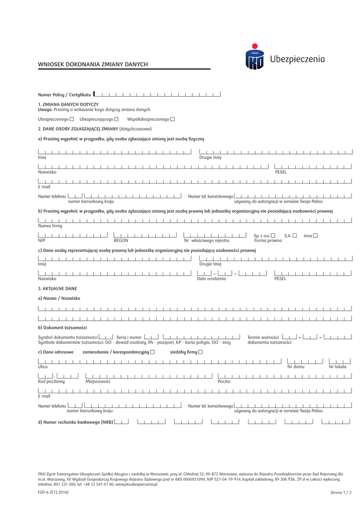 wniosek dokonania zmiany danych Numer Polisy / Certyfikatu 1. ZMIANA DANYCH DOTYCZY Uwaga: Prosimy o wskazanie kogo dotyczy zmiana danych. Ubezpieczonego Ubezpieczającego Współubezpieczonego 2. DANE OSOBY ZGŁASZAJĄCEJ ZMIANY (dotychczasowe) a) Prosimy wypełnić w przypadku, gdy osoba zgłaszająca zmiany jest osobą fizyczną Imię Drugie Imię Nazwisko PESEL E-mail Numer telefonu numer kierunkowy kraju Numer tel. komórkowego używany do autoryzacji w serwisie Twoja Polisa b) Prosimy wypełnić w przypadku, gdy osoba zgłaszająca zmiany jest osobą prawną lub jednostką organizacyjną nie posiadającą osobowości prawnej Nazwa firmy NIP REGON Sp. z o.o. S.A. Forma prawna Nr właściwego rejestru inna c) Dane osoby reprezentującej osobę prawną lub jednostkę organizacyjną nie posiadającą osobowości prawnej Imię Drugie Imię – Data urodzenia Nazwisko – PESEL 3. AKTUALNE DANE a) Nazwa / Nazwisko b) Dokument tożsamości Symbol dokumentu tożsamości Seria i numer Symbole dokumentów tożsamości: DO - dowód osobisty, PA - paszport, KP - karta pobytu, OO - inny c) Dane adresowe zamieszkania / korespondencyjny Termin ważności dokumentu tożsamości – – siedziby firmy Ulica Nr domu Kod pocztowy Miejscowość Nr lokalu Poczta E-mail Numer telefonu numer kierunkowy kraju Numer tel. komórkowego używany do autoryzacji w serwisie Twoja Polisa d) Numer rachunku bankowego (NRB) PKO Życie Towarzystwo Ubezpieczeń Spółka Akcyjna z siedzibą w Warszawie, przy ul. Chłodnej 52, 00-872 Warszawa, wpisana do Rejestru Przedsiębiorców przez Sąd Rejonowy dla m.st. Warszawy, XII Wydział Gospodarczy Krajowego Rejestru Sądowego pod nr KRS 0000031094, NIP 521-04-19-914, kapitał zakładowy: 89 308 936, 29 zł w całości wpłacony. Infolinia: 801 231 500, tel. +48 22 541 01 00, www.pkoubezpieczenia.pl FZD-6-Ż(12.2016) Strona 1 / 2 4. Oświadczenia • Jeżeli chciałbyś zmienić dotychczasową papierową korespondencję na elektroniczną, prosimy o zaznaczenie „TAK” Dobrowolnie wyrażam zgodę na przekazywanie przez PKO Życie Towarzystwo Ubezpieczeń S.A., z siedzibą w Warszawie (00-872), ul. Chłodna 52 drogą elektroniczną na wskazany przeze mnie adres e-mail wszelkiej korespondencji dotyczącej Umowy ubezpieczenia, na warunkach przewidzianych powszechnie obowiązującymi przepisami prawa. Ubezpieczający TAK Ubezpieczony TAK Złożone oświadczenie na podstawie niniejszego formularza będzie mieć zastosowanie do wszystkich Umów zawartych z PKO Życie Towarzystwo Ubezpieczeń S.A. Miejscowość Data Miejscowość Data – – – – Czytelny podpis osoby zgłaszającej zmiany Czytelny podpis osoby po zmianie nazwiska Strona 2 / 2