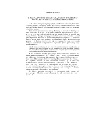 HENRYK TRAMMER Z ROZWAŻAŃ NAD STRUKTURĄ NORMY KOLIZYJNEJ PRAWA PRYWATNEGO MIĘDZYNARODOWEGO I. W szkicu niniejszym pragnąłbym przedstawić strukturę formalnologiczną normy kolizyjnej prawa prywatnego międzynarodowego oraz dorzucić kilka słów na temat pewnych zagadnień dotyczących stosowa nia takiej normy. Aczkolwiek przedstawione dalej elementy są zawarte w każdej normie kolizyjnej pr.pr.mn., to w sformułowaniu poszczególnych p r z e p i s ó w pr.pr.mn. najczęściej nie są one wyodrębnione w sposób wyraźny. Właśnie dlatego istnieje powszechnie uznawana potrzeba — przed przystąpieniem do nauki o stosowaniu przepisów pr.pr.mn. — uświadomienia sobie logicznej struktury podstawowej normy kolizyjnej tego prawa — i dlatego też kwestii tej poświęcane bywają rozważania wstępne wszystkich podręczników i wykładów prawa prywatnego międzynarodowego. Jednak nieraz spotykamy się tu z wypowiedziami różniącymi się od siebie, co często jest nie tyle rezultatem jakichś zasadniczych różnic poglądów ich autorów, ile chyba raczej wynikiem niedostatecznej precyzji, spowodowanej zapewne operowaniem pewnymi skrótami myślowymi. II. Jak wiadomo, według przyjętego przez większość autorów po glądu, podstawowa norma m e r y t o r y c z n a prawa cywilnego składa się z hipotezy (opis stanu faktycznego) i z dyspozycji (skutek prawny tego stanu faktycznego). Otóż również i podstawowa norma k o 1 i z y jn a pr.pr.mn. zawiera te dwa zasadnicze składniki, tj., z j e d n e j stro n y h ip o tezę (certa in o p era tive fa cts, Ta tb esta n d ) — tzn . h i p o t e t y c z n y stan faktyczny, w odróżnieniu od pewnego k o n k r e t n e g o stan u f ak tyczn eg o (rea l fa cts, S a ch verh a lt), mająceg o b yć p rzed miotem subsumpcji pod odpowiednią hipotezę — i z d r u g i e j strony dyspozycję (legal consequences, Rechtsfolge). III. Wbrew utartemu zwyczajowi — rozważania moje zacznę od d r u g i e g o składnika normy kolizyjnej, tj. od omówienia d y s p o z y c j i. A. Jest bezsporne, że w dyspozycji każdej normy kolizyjnej pr.pr.mn. mieści się przede wszystkim nakaz zastosowania prawa j a k i e g o ś o b s z a r u p a ń s t w o w e g o (określonego w d a l s z e j części dyspozycji za pomocą pewnego abstrakcyjnego wskaźnika — o czym za chwilę). Nakaz ten jest właśnie c e c h ą c h a r a k t e r y z u j ą c ą n o r m ę k o l i z y j n ą p r . p r . m n . , jako taką — normę, która przecież ex definitione nie ujmuje skutków prawnych hipotezy w postać bezpośrednich praw i obowiązków podmiotów prawnych (tak jak to czyni norma merytoryczna prawa cywilnego), ale — należąc do jednego z typów tzw. „norm o normach" — ujmuje te skutki w postać powinności zastosowania (do hipotezy) prawa jakiegoś obszaru państwowego. Ten nakaz zastosowania prawa jakiegoś obszaru państwowego — skoro jest, jak powiedziano, cechą charakteryzującą normę kolizyjną pr.pr.mn., jako taką — jest — tym samym — niezmienną pod względem swej l o g i c z n e j t r e ś c i częścią dyspozycji każdej normy kolizyjnej pr.pr.mn. Rzecz jasna, że s f o r m u ł o w a n i e tego nakazu w poszczególnych p r z e p i s a c h może być różne. Np. przepisy naszego pr.pr.mn. operują tu takimi wyrażeniami jak: do czegoś „właściwe jest prawo państwa", do czegoś „stosuje się prawo państwa", coś „podlega prawu państwa", o czymś „rozstrzyga prawo państwa". Dopiero oprócz tej — niezmiennej pod względem swej logicznej treści części dy spozy cji cji— mieści się w d a l s z e j części dyspozycji różne pod względem swej treści kryterium wskazujące w sposób abstrakcyjny 1, o jakiego państwa prawo w danej normie chodzi, a wskaźnik taki bywa nazywany łącznikiem. Nie można tedy uznać za ścisłe — napotykane czasem — wypowiedzi, jakoby c a ł y drugi składnik normy kolizyjnej (tj. jej dyspozycję) stanowił sam tylko łącznik. Wypowiedzi takie zapominają bowiem o zawartym w dyspozycji każdej normy kolizyjnej — wspomnianym — nakazie zastosowania jakiegoś prawa. Ponieważ zazwyczaj najtrudniej dostrzec to, co jest niejako samo przez się zro- . zumiałe, przeto ów — stale się powtarzający w każdej normie kolizyjnej i charakterystyczny dla normy kolizyjnej pr. pr. mn. — nakaz zastosowania prawa jakiegoś obszaru państwowego uchodzi uwagi niektórych autorów przedstawiających elementy normy kolizyjnej. B. Druga część dyspozycji, czyli tzw. ł ą c z n i k (wskaźnik abstrak cyjny) zawiera przede wszystkim o k r e ś l n i k n o m i n a l n y , skła dający się z dwóch elementów: z podstawy i z dopełniacza. Podstawą określnika nominalnego jest np. „obywatelstwo", „miejsce zamieszka nia", „miejsce położenia". Dopełniaczem określnika nominalnego jest np. „dziecka", „spadkodawcy", „matki", „rzeczy". Nadto mieści się w łączniku s u b o k r e ś l n i k temporalny, 1 Mowa tu o normie kolizyjnej tzw. zupełnej (wielostronnej). Łącznik, zawarty w przepisie kolizyjnym tzw. jednostronnym, określa prawo właściwe w sposób k o n k r e t n y , wymieniając wprost prawo państwa prawodawcy. który precyzuje pod Względem czasowym cały określnik nominalny — np. „z chwili urodzenia", „z chwili uznania", „z chwili wystąpienia z żądaniem", „z chwili śmierci", „z chwili dokonania czynności", „każdoczesne". Subokreślnik temporalny występuje w każdym łączniku, choćby w którymś z przepisów nie był expressis verbis sformułowany (np. w art. 9 pr.pr.mn. chodzi o podany tam określnik nominalny z chwili dokonania czynności, tak jak w art. 35 — a w art. 19 § 1 chodzi o podany tam określnik nominalny każdoczesny, tak jak w art. 17 § 1). Ustalenie okoliczności, od których zależy w danym wypadku właściwość konkretnego prawa (np. prawa „francuskiego") — czyli ustalenie konk r e t n e g o o d p o w i e d n i k