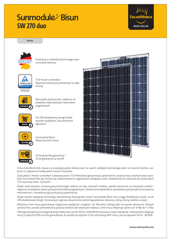 SW 270 duo Karta Produkcja w zakładzie technologicznym na terenie Niemiec TÜV Power controlled: Najniższe tolerancje pomiarowe w całej branży Niezwykle wytrzymałe i odporne na działanie niekorzystnych warunków pogodowych Do 25% dodatkowej energii dzięki wysoko wydajnym, dwustronnym ogniwom -0/+5 Wp Sunmodule Bisun: Właściwy limit mocy 30 lat jednolitej gwarancji i 10 lat gwarancji na wyrób Firma SolarWorld AG stawia na produkcję paneli słonecznych w swoim zakładzie technologicznym na terenie Niemiec, poprzez co zapewnia trwałą jakość swoich wyrobów. Znak jakości "Power controlled" nadawany przez TÜV Rheinland gwarantuje zapewnienie uznanej mocy znamionowej wyrobów Sunmodule Plus jak również jej nadzorowanie w regularnych odstępach czasu. Rozbieżności w stosunku do wytycznych TÜV wynoszą maks. 2 procent. Dzięki zastosowaniu innowacyjnej technologii szklenia po obu stronach modułu, panele słoneczne są niezwykle solidne i odporne na działanie niekorzystnych warunków pogodowych. Panele Sunmodule Bisun są bardziej wytrzymałe na obciążenia mechaniczne i charakteryzują się dłuższą żywotnością. Dzięki bardzo wydajnej technologii dwustronnej (bifacjalnej) moduł Sunmodule Bisun duo osiąga dodatkowe uzyski, aż do 25% dodatkowej energii. Innowacyjne ogniwa dwustronne zamieniają pobrane aktywną, tylną stroną światło w uzysk. Właściwy limit mocy gwarantuje najwyższą wydajność urządzeń. Do klientów trafiają tylko te panele słoneczne, których uznana moc została potwierdzona podczas testów lub nawet jest większa. Limit mocy obejmuje zakres od -0 Wp do + 5 Wp. Oferując perspektywiczną gwarancję stałej mocy przez 30 lat, SolarWorld wyznacza nowe standardy: maksymalna degresja mocy o jedynie 0,35% rocznie gwarantuje, że panele po upływie 21 lat zachowają 90% mocy, zaś po upływie 30 lat - 86,85%. www.solarworld.com SW 270 duo Reakcja w optymalnych warunkach 6% 10 % 20 % 25 % Moc Pmax 285 Wp 295 Wp 319 Wp 331 Wp Napięcie jałowe Uoc 39,0 V 39,0 V 39,0 V 39,0 V Napięcie MPP Umpp 31,0 V 30,9 V 30,6 V 30,5 V Prąd zwarciowy Isc 9,84 A 10,21 A 11,14 A 11,60 A Natężenie MPP Impp Dodatkowa energia ηm Współczynnik skuteczności modułu 9,20 A 9,55 A 10,42 A 10,85 A 16,99 % 17,57 % 19,03 % 19,72 % REAKCJA PRZY TEŚCIE W WARUNKACH STANDARDOWYCH (STC)* REAKCJA PRZY 800 W/m², NOCT, AM 1.5 Moc Pmax 270 Wp Moc Pmax Napięcie jałowe Uoc 39,0 V Napięcie jałowe Uoc 35,7 V Napięcie MPP Umpp 31,3 V Napięcie MPP Umpp 28,6 V Prąd zwarciowy Isc 9,28 A Prąd zwarciowy Isc 7,50 A Natężenie MPP Impp 8,68 A Natężenie MPP Impp 16,10 % Współczynnik skuteczności modułu ηm Współczynnik skuteczności modułu Tolerancja pomiarów (Pmaks.) z możliwością powołania się na TÜV Rheinland: +/- 2% (TÜV Power controlled) *STC: 1000W/m², 25°C, AM 1.5 7,01 A ηm 12,01 % Nieznaczna redukcja współczynnika skuteczności przy reakcji na częściowe obciążenie w 25°C: przy 200 W/m² osiąga się 97 % (+/- 3 %) współczynnika STC. STOSOWANE MATERIAŁY 961 106,65 201 Wp - + 4 x ∅ 6,6 Komórki na moduł 60 Materiał komórek bifacial duo 156 mm x 156 mm Wymiary komórki 180,85 4x∅9 Strona frontowa Szkło wzmacniane termicznie (EN 1863-1) Strona odwrotna Szkło wzmacniane termicznie (EN 1863-1) aluminium anodowane srebrne Obramowanie 1000 IP65 Stopień ochrony (IP) H4 Typ złącza wtykowego WYMIARY / Ciężar 1675 PARAMETRY TERMICZNE 48 °C Długość 1675 mm NOCT Szerokość 1001 mm TK Isc Wysokość 33 mm TK Uoc -0,31 %/K Ciężar 21,5 kg TK Pmpp -0,43 %/K 0,044 %/K PARAMETRY OPTYMALNEGO POŁĄCZENIA SYSTEMOWEGO 287,50 Sortowanie wg mocy 33 Maks. napięcie systemowe -0 Wp / +5 Wp 1000 V 25 A Obciążenie prądem wstecznym Obciążenie dodatkowe/ obciążenie dynamiczne 5,4 / 2,4 kN/m² 3 Diody bypass 3 Maks. temperatura robocza -40°C bis +85°C Parametry instalacji dla maksymalnego uzysku • Informacje o zamawianiu Numer zamówienia Opis 82000116 Sunmodule Bisun SW 270 duo • • • • silnie reflektująca powierzchnia od tylnej strony modułów jak biały beton, jasna membrana dachu, dachy trapezowe lub podłoże z kamyczków wapiennych. Możliwie największy odstęp modułów od podłoża System montażowy ograniczający zacienienie tylniej strony Odpowiedni odstęp między rzędami modułów w celu minimalizacji zacienienia zalecany poziomy montaż modułów SolarWorld AG zastrzega sobie możliwość zmian specyfikacji. Niniejszy arkusz danych jest zgodny z wytycznymi EN 50380. Niniejszy arkusz danych jest dostępny również w wersji angielskiej. 90002401 | 2016-02-25 PL Aby uzyskać najlepszą wydajność systemu, zaleca się przestrzeganie następujących zaleceń: