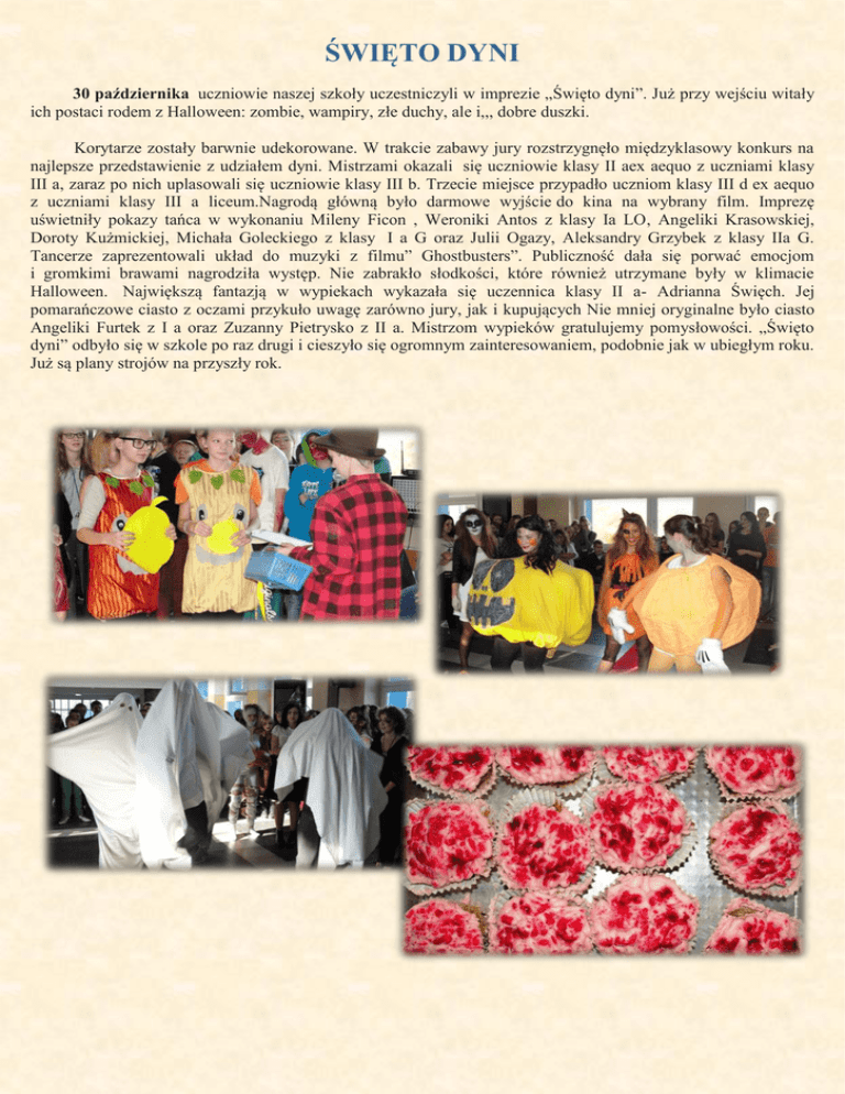 ŚWIĘTO DYNI 30 października uczniowie naszej szkoły uczestniczyli w imprezie „Święto dyni”. Już przy wejściu witały ich postaci rodem z Halloween: zombie, wampiry, złe duchy, ale i,,, dobre duszki. Korytarze zostały barwnie udekorowane. W trakcie zabawy jury rozstrzygnęło międzyklasowy konkurs na najlepsze przedstawienie z udziałem dyni. Mistrzami okazali się uczniowie klasy II aex aequo z uczniami klasy III a, zaraz po nich uplasowali się uczniowie klasy III b. Trzecie miejsce przypadło uczniom klasy III d ex aequo z uczniami klasy III a liceum.Nagrodą główną było darmowe wyjście do kina na wybrany film. Imprezę uświetniły pokazy tańca w wykonaniu Mileny Ficon , Weroniki Antos z klasy Ia LO, Angeliki Krasowskiej, Doroty Kużmickiej, Michała Goleckiego z klasy I a G oraz Julii Ogazy, Aleksandry Grzybek z klasy IIa G. Tancerze zaprezentowali układ do muzyki z filmu” Ghostbusters”. Publiczność dała się porwać emocjom i gromkimi brawami nagrodziła występ. Nie zabrakło słodkości, które również utrzymane były w klimacie Halloween. Największą fantazją w wypiekach wykazała się uczennica klasy II a- Adrianna Święch. Jej pomarańczowe ciasto z oczami przykuło uwagę zarówno jury, jak i kupujących Nie mniej oryginalne było ciasto Angeliki Furtek z I a oraz Zuzanny Pietrysko z II a. Mistrzom wypieków gratulujemy pomysłowości. „Święto dyni” odbyło się w szkole po raz drugi i cieszyło się ogromnym zainteresowaniem, podobnie jak w ubiegłym roku. Już są plany strojów na przyszły rok.