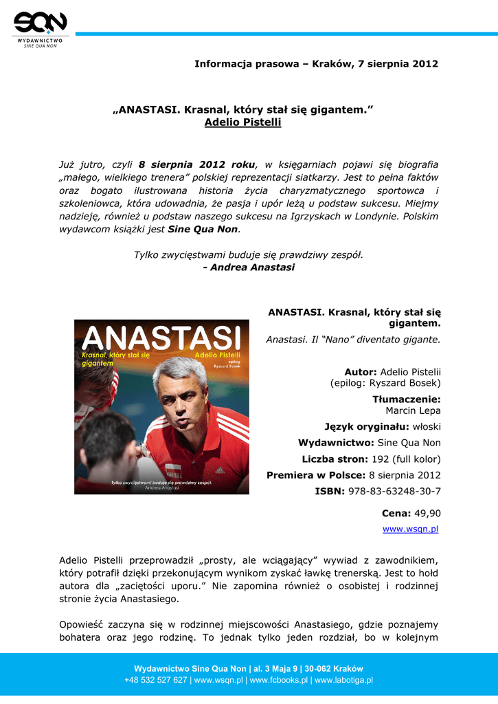 Informacja prasowa – Kraków, 7 sierpnia 2012 „ANASTASI. Krasnal, który stał się gigantem.” Adelio Pistelli Już jutro, czyli 8 sierpnia 2012 roku, w księgarniach pojawi się biografia „małego, wielkiego trenera” polskiej reprezentacji siatkarzy. Jest to pełna faktów oraz bogato ilustrowana historia życia charyzmatycznego sportowca i szkoleniowca, która udowadnia, że pasja i upór leżą u podstaw sukcesu. Miejmy nadzieję, również u podstaw naszego sukcesu na Igrzyskach w Londynie. Polskim wydawcom książki jest Sine Qua Non. Tylko zwycięstwami buduje się prawdziwy zespół. - Andrea Anastasi ANASTASI. Krasnal, który stał się gigantem. Anastasi. Il “Nano” diventato gigante. Autor: Adelio Pistelii (epilog: Ryszard Bosek) Tłumaczenie: Marcin Lepa Język oryginału: włoski Wydawnictwo: Sine Qua Non Liczba stron: 192 (full kolor) Premiera w Polsce: 8 sierpnia 2012 ISBN: 978-83-63248-30-7 Cena: 49,90 www.wsqn.pl Adelio Pistelli przeprowadził „prosty, ale wciągający” wywiad z zawodnikiem, który potrafił dzięki przekonującym wynikom zyskać ławkę trenerską. Jest to hołd autora dla „zaciętości uporu.” Nie zapomina również o osobistej i rodzinnej stronie życia Anastasiego. Opowieść zaczyna się w rodzinnej miejscowości Anastasiego, gdzie poznajemy bohatera oraz jego rodzinę. To jednak tylko jeden rozdział, bo w kolejnym Wydawnictwo Sine Qua Non | al. 3 Maja 9 | 30-062 Kraków +48 532 527 627 | www.wsqn.pl | www.fcbooks.pl | www.labotiga.pl zaczyna się to co dla zawodnika najważniejsze - kariera zawodowa. I tak przeczytamy o pierwszych krokach w Parmie, a potem kolejnych zwycięstwach i porażkach z klubem i reprezentacją Włoch. Jednak w przypadku Anastasieg najważniejszy jest etap trenerski i na tym skupia się biografia. Dowiadujemy się o współpracy z reprezentacją Włoch a później Hiszpanii, o utracie i powrocie do ojczyzny, o meczach w lidze światowej i na Igrzyskach Olimpijskich. Poznajemy „Krasnala” nie tylko od strony autora, ale również poprzez wywiady z innymi dziennikarzami czy zawodnikami. W końcu docieramy do momentu, gdy Anastasi przejmuje reprezentację Polski. Poza szczegółami dotyczącymi gry naszego zespołu w Final Six Ligi Światowej, mistrzostwach Europy w Czechach i Austrii, oraz w Pucharze Świata, autor dostarcza nam informacji o tym jak trener czuł się rozpoczynając współpracę z Polakami i jak z czasem jego uczucia ewoluowały. Ostatni rozdział książki to epilog Ryszarda Boska w całości poświęcony współpracy z Polakami aż do momentu finału w Lidze Światowej. Biografia Anastasiego została uzupełniona przez wydawcę o wiele dodatkowych elementów (nie ma ich w oryginalnym wydaniu), które przybliżają współpracę Anastasiego z reprezentacją polski. Są to m.in. wstęp Prezesa Polskiego Związku Piłki Siatkowej czy Sebastiana Świderskiego. Informacja o autorze: Adelio Pistelli urodził się w Ankonie w 1950 roku. Odkrył siatkówkę w wieku 15 lat, śledząc rozwój ówczesnego Virtuosa Falconara. Jest publicystą od 1980 roku oraz autorem kilku książek, nie tylko o tematyce siatkarskiej. Jest jednym z legendarnych piór miesięcznika specjalistycznego „Pallavolo-Supervolley”. Wydawca w Polsce: Sine qua non – Wydawnictwo Sine Qua Non powstało w połowie 2010 roku. Ideą, która przyświecała założycielom jest publikowanie książek “z pasją”. Dla jednych pasją jest piłka nożna, dla innych film, trzeci interesuje się sztuką współczesną a jeszcze kolejny po prostu literaturą. Jednak każdy z nich ma możliwość dzielić się swoją pasją właśnie poprzez książkę. W oparciu o te założenia działa Sine Qua Non. Wśród pozycji, które ukazały się nakładem wydawnictwa można znaleźć książki o piłce nożnej, sztuce współczesnej, serialowe oraz inne, które są realizacją pasji. Strona www: www.wsqn.pl Kontakt dla prasy: Łukasz Kuśnierz Tel: 509 600 505 [email protected] Wydawnictwo Sine Qua Non | al. 3 Maja 9 | 30-062 Kraków +48 532 527 627 | www.wsqn.pl | www.fcbooks.pl | www.labotiga.pl Patroni medialni: Partner wydania: Wydawnictwo Sine Qua Non | al. 3 Maja 9 | 30-062 Kraków +48 532 527 627 | www.wsqn.pl | www.fcbooks.pl | www.labotiga.pl