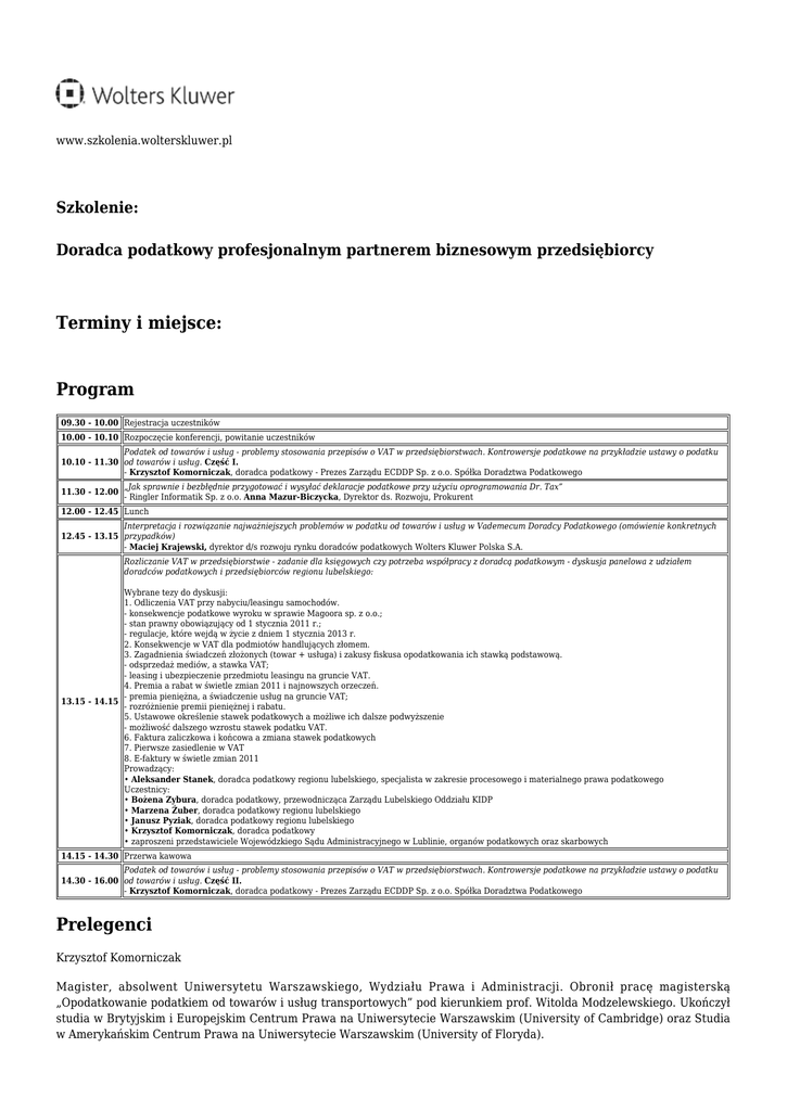 www.szkolenia.wolterskluwer.pl Szkolenie: Doradca podatkowy profesjonalnym partnerem biznesowym przedsiębiorcy Terminy i miejsce: Program 09.30 - 10.00 Rejestracja uczestników 10.00 - 10.10 Rozpoczęcie konferencji, powitanie uczestników Podatek od towarów i usług - problemy stosowania przepisów o VAT w przedsiębiorstwach. Kontrowersje podatkowe na przykładzie ustawy o podatku 10.10 - 11.30 od towarów i usług. Część I. - Krzysztof Komorniczak, doradca podatkowy - Prezes Zarządu ECDDP Sp. z o.o. Spółka Doradztwa Podatkowego 11.30 - 12.00 „Jak sprawnie i bezbłędnie przygotować i wysyłać deklaracje podatkowe przy użyciu oprogramowania Dr. Tax” - Ringler Informatik Sp. z o.o. Anna Mazur-Biczycka, Dyrektor ds. Rozwoju, Prokurent 12.00 - 12.45 Lunch Interpretacja i rozwiązanie najważniejszych problemów w podatku od towarów i usług w Vademecum Doradcy Podatkowego (omówienie konkretnych 12.45 - 13.15 przypadków) - Maciej Krajewski, dyrektor d/s rozwoju rynku doradców podatkowych Wolters Kluwer Polska S.A. Rozliczanie VAT w przedsiębiorstwie - zadanie dla księgowych czy potrzeba współpracy z doradcą podatkowym - dyskusja panelowa z udziałem doradców podatkowych i przedsiębiorców regionu lubelskiego: Wybrane tezy do dyskusji: 1. Odliczenia VAT przy nabyciu/leasingu samochodów. - konsekwencje podatkowe wyroku w sprawie Magoora sp. z o.o.; - stan prawny obowiązujący od 1 stycznia 2011 r.; - regulacje, które wejdą w życie z dniem 1 stycznia 2013 r. 2. Konsekwencje w VAT dla podmiotów handlujących złomem. 3. Zagadnienia świadczeń złożonych (towar + usługa) i zakusy fiskusa opodatkowania ich stawką podstawową. - odsprzedaż mediów, a stawka VAT; - leasing i ubezpieczenie przedmiotu leasingu na gruncie VAT. 4. Premia a rabat w świetle zmian 2011 i najnowszych orzeczeń. - premia pieniężna, a świadczenie usług na gruncie VAT; 13.15 - 14.15 - rozróżnienie premii pieniężnej i rabatu. 5. Ustawowe określenie stawek podatkowych a możliwe ich dalsze podwyższenie - możliwość dalszego wzrostu stawek podatku VAT. 6. Faktura zaliczkowa i końcowa a zmiana stawek podatkowych 7. Pierwsze zasiedlenie w VAT 8. E-faktury w świetle zmian 2011 Prowadzący: • Aleksander Stanek, doradca podatkowy regionu lubelskiego, specjalista w zakresie procesowego i materialnego prawa podatkowego Uczestnicy: • Bożena Zybura, doradca podatkowy, przewodnicząca Zarządu Lubelskiego Oddziału KIDP • Marzena Żuber, doradca podatkowy regionu lubelskiego • Janusz Pyziak, doradca podatkowy regionu lubelskiego • Krzysztof Komorniczak, doradca podatkowy • zaproszeni przedstawiciele Wojewódzkiego Sądu Administracyjnego w Lublinie, organów podatkowych oraz skarbowych 14.15 - 14.30 Przerwa kawowa Podatek od towarów i usług - problemy stosowania przepisów o VAT w przedsiębiorstwach. Kontrowersje podatkowe na przykładzie ustawy o podatku 14.30 - 16.00 od towarów i usług. Część II. - Krzysztof Komorniczak, doradca podatkowy - Prezes Zarządu ECDDP Sp. z o.o. Spółka Doradztwa Podatkowego Prelegenci Krzysztof Komorniczak Magister, absolwent Uniwersytetu Warszawskiego, Wydziału Prawa i Administracji. Obronił pracę magisterską „Opodatkowanie podatkiem od towarów i usług transportowych” pod kierunkiem prof. Witolda Modzelewskiego. Ukończył studia w Brytyjskim i Europejskim Centrum Prawa na Uniwersytecie Warszawskim (University of Cambridge) oraz Studia w Amerykańskim Centrum Prawa na Uniwersytecie Warszawskim (University of Floryda). W 2003 r. uzyskał wpis na listę Doradców Podatkowych (nr wpisu 09 850). Wieloletni praktyk w dziedzinie podatków. Przez szereg lat współpracownik Instytutu Studiów Podatkowych Modzelewski i Wspólnicy. Uznany wykładowca Studiów Podyplomowych Szkoły Głównej Handlowej oraz Instytutu Studiów Podatkowych. Uczestniczył w postępowaniach przed organami skarbowymi oraz przed Naczelnym Sądem Administracyjnym, brał udział w przygotowywaniu opinii prawnych, odwołań, skarg do Naczelnego Sądu Administracyjnego oraz innych pism procesowych w sprawach podatkowych. Autor ekspertyz prawnych w zakresie prawa podatkowego i finansowego na zlecenie Kancelarii Sejmu i Senatu RP. Od sierpnia 2006 r. członek zarządu Europejskiego Centrum Doradztwa i Dokumentacji Podatkowej Spółka Doradztwa Podatkowego Sp. z o.o. Autor i współautor książek z zakresu prawa podatkowego. Od wielu lat współpracuje z Biuletynem Instytucji Studiów Podatkowych „Doradztwo Podatkowe”, dziennikiem „Rzeczpospolita” czy „Dziennikiem Gazeta Prawna”. Specjalizuje się w zagadnieniach związanych z podatkiem od towarów i usług oraz podatkiem od czynności cywilnoprawnych. Beata Witkowska Absolwentka Wydziału Prawa i Administracji Uniwersytetu Łódzkiego, doktorantka Wydziału Prawa i Administracji Uniwersytetu Warszawskiego, doradca podatkowy (egzamin dla doradców podatkowych przed Państwową Komisją ds. Doradztwa Podatkowego, praktyka zawodowa w urzędzie skarbowym, izbie skarbowej, urzędzie kontroli skarbowej oraz kancelarii doradztwa podatkowego), współpracuje z firmami szkoleniowymi, a także z wydawnictwami prawno podatkowymi, autorka licznych publikacji z zakresu prawa podatkowego w czasopismach specjalistycznych, wykładowca Europejskiej Akademii Planowania Finansowego, Gdańskiej Akademii Bankowej, prowadzi własną kancelarię doradztwa podatkowego, a także firmę szkoleniową, redaktor naczelna portalu oraz czasopisma prawno finansowego. Kontakt w sprawie szkolenia: