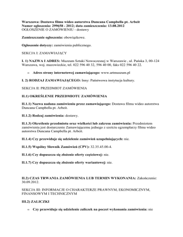 Warszawa: Dostawa filmu wideo autorstwa Duncana Campbella pt. Arbeit Numer ogłoszenia: 299658 - 2012; data zamieszczenia: 13.08.2012 OGŁOSZENIE O ZAMÓWIENIU - dostawy Zamieszczanie ogłoszenia: obowiązkowe. Ogłoszenie dotyczy: zamówienia publicznego. SEKCJA I: ZAMAWIAJĄCY I. 1) NAZWA I ADRES: Muzeum Sztuki Nowoczesnej w Warszawie , ul. Pańska 3, 00-124 Warszawa, woj. mazowieckie, tel. 022 596 40 32, 596 40 00, faks 022 596 40 22. • Adres strony internetowej zamawiającego: www.artmuseum.pl I. 2) RODZAJ ZAMAWIAJĄCEGO: Inny: Państwowa instytucja kultury. SEKCJA II: PRZEDMIOT ZAMÓWIENIA II.1) OKREŚLENIE PRZEDMIOTU ZAMÓWIENIA II.1.1) Nazwa nadana zamówieniu przez zamawiającego: Dostawa filmu wideo autorstwa Duncana Campbella pt. Arbeit. II.1.2) Rodzaj zamówienia: dostawy. II.1.3) Określenie przedmiotu oraz wielkości lub zakresu zamówienia: Przedmiotem zamówienia jest dostarczenie Zamawiającemu jednego z sześciu egzemplarzy filmu wideo autorstwa Duncana Campbella pt. Arbeit. II.1.4) Czy przewiduje się udzielenie zamówień uzupełniających: nie. II.1.5) Wspólny Słownik Zamówień (CPV): 32.35.45.00-4. II.1.6) Czy dopuszcza się złożenie oferty częściowej: nie. II.1.7) Czy dopuszcza się złożenie oferty wariantowej: nie. II.2) CZAS TRWANIA ZAMÓWIENIA LUB TERMIN WYKONANIA: Zakończenie: 30.09.2012. SEKCJA III: INFORMACJE O CHARAKTERZE PRAWNYM, EKONOMICZNYM, FINANSOWYM I TECHNICZNYM III.2) ZALICZKI • Czy przewiduje się udzielenie zaliczek na poczet wykonania zamówienia: nie III.4) INFORMACJA O OŚWIADCZENIACH LUB DOKUMENTACH, JAKIE MAJĄ DOSTARCZYĆ WYKONAWCY W CELU POTWIERDZENIA SPEŁNIANIA WARUNKÓW UDZIAŁU W POSTĘPOWANIU ORAZ NIEPODLEGANIA WYKLUCZENIU NA PODSTAWIE ART. 24 UST. 1 USTAWY • • III.4.1) W zakresie wykazania spełniania przez wykonawcę warunków, o których mowa w art. 22 ust. 1 ustawy, oprócz oświadczenia o spełnieniu warunków udziału w postępowaniu, należy przedłożyć: III.4.2) W zakresie potwierdzenia niepodlegania wykluczeniu na podstawie art. 24 ust. 1 ustawy, należy przedłożyć: • oświadczenie o braku podstaw do wykluczenia • III.5) INFORMACJA O DOKUMENTACH POTWIERDZAJĄCYCH, ŻE OFEROWANE DOSTAWY , USŁUGI LUB ROBOTY BUDOWLANE ODPOWIADAJĄ OKREŚLONYM WYMAGANIOM W zakresie potwierdzenia, że oferowane dostawy, usługi lub roboty budowlane odpowiadają określonym wymaganiom należy przedłożyć: • inne dokumenty Certyfikat Autentyczności filmu podpisany przez twórcę III.7) Czy ogranicza się możliwość ubiegania się o zamówienie publiczne tylko dla wykonawców, u których ponad 50 % pracowników stanowią osoby niepełnosprawne: nie SEKCJA IV: PROCEDURA IV.1) TRYB UDZIELENIA ZAMÓWIENIA IV.1.1) Tryb udzielenia zamówienia: przetarg nieograniczony. IV.2) KRYTERIA OCENY OFERT IV.2.1) Kryteria oceny ofert: najniższa cena. IV.2.2) Czy przeprowadzona będzie aukcja elektroniczna: nie. IV.3) ZMIANA UMOWY Czy przewiduje się istotne zmiany postanowień zawartej umowy w stosunku do treści oferty, na podstawie której dokonano wyboru wykonawcy: nie IV.4) INFORMACJE ADMINISTRACYJNE IV.4.1) Adres strony internetowej, na której jest dostępna specyfikacja istotnych warunków zamówienia: www.artmuseum.pl Specyfikację istotnych warunków zamówienia można uzyskać pod adresem: ul. Pańska 3 00-124 Warszawa. IV.4.4) Termin składania wniosków o dopuszczenie do udziału w postępowaniu lub ofert: 21.08.2012 godzina 12:15, miejsce: Recepcja Muzeum Sztuki Nowoczesnej w Warszawie ul. Pańska 3 00-124 Warszawa. IV.4.5) Termin związania ofertą: okres w dniach: 30 (od ostatecznego terminu składania ofert). IV.4.17) Czy przewiduje się unieważnienie postępowania o udzielenie zamówienia, w przypadku nieprzyznania środków pochodzących z budżetu Unii Europejskiej oraz niepodlegających zwrotowi środków z pomocy udzielonej przez państwa członkowskie Europejskiego Porozumienia o Wolnym Handlu (EFTA), które miały być przeznaczone na sfinansowanie całości lub części zamówienia: nie