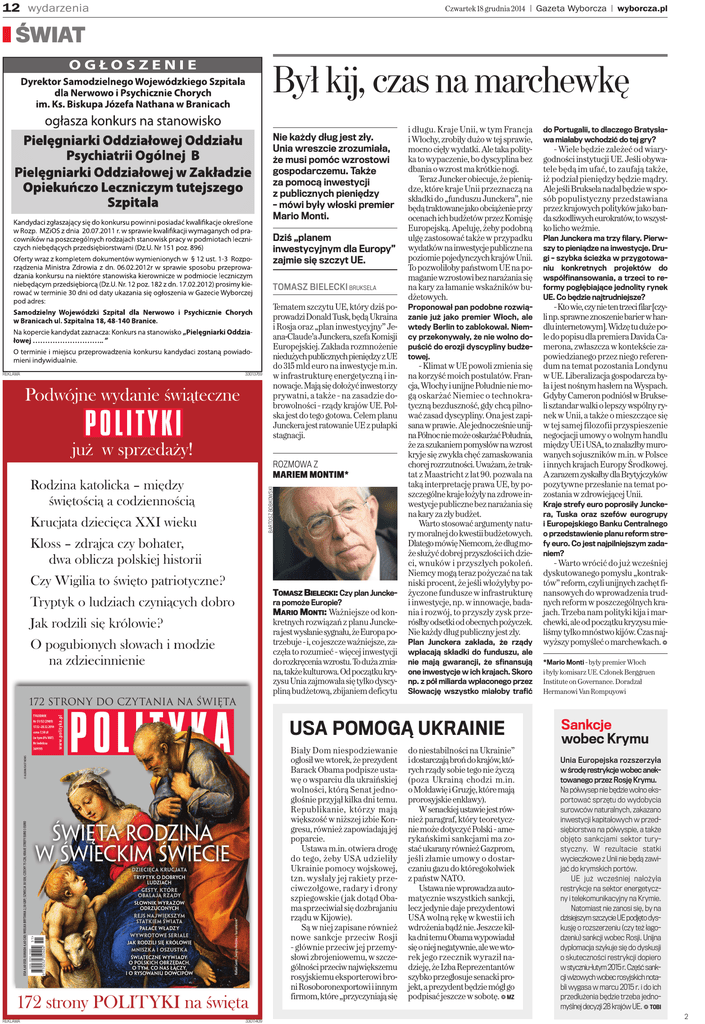 12 wydarzenia Czwartek 18 grudnia 2014 Gazeta Wyborcza wyborcza.pl ŚWIAT Był kij, czas na marchewkę Nie każdy dług jest zły. Unia wreszcie zrozumiała, że musi pomóc wzrostowi gospodarczemu. Także za pomocą inwestycji z publicznych pieniędzy – mówi były włoski premier Mario Monti. Dziś „planem inwestycyjnym dla Europy” zajmie się szczyt UE. TOMASZ BIELECKI BRUKSELA REKLAMA 33013769 Tematem szczytu UE, który dziś poprowadzi Donald Tusk, będą Ukraina i Rosja oraz „plan inwestycyjny” Jeana-Claude’a Junckera, szefa Komisji Europejskiej. Zakłada rozmnożenie niedużych publicznych pieniędzy zUE do 315 mld euro na inwestycje m.in. w infrastrukturę energetyczną i innowacje. Mają się dołożyć inwestorzy prywatni, a także – na zasadzie dobrowolności – rządy krajów UE. Polska jest do tego gotowa. Celem planu Junckera jest ratowanie UE z pułapki stagnacji. BARTOSZ BOBKOWSKI ROZMOWA Z MARIEM MONTIM* TOMASZ BIELECKI: Czy plan Junckera pomoże Europie? MARIO MONTI: Ważniejsze od kon- kretnych rozwiązań z planu Junckera jest wysłanie sygnału, że Europa potrzebuje – i, co jeszcze ważniejsze, zaczęła to rozumieć – więcej inwestycji do rozkręcenia wzrostu. To duża zmiana, także kulturowa. Od początku kryzysu Unia zajmowała się tylko dyscypliną budżetową, zbijaniem deficytu i długu. Kraje Unii, w tym Francja i Włochy, zrobiły dużo w tej sprawie, mocno cięły wydatki. Ale taka polityka to wypaczenie, bo dyscyplina bez dbania o wzrost ma krótkie nogi. Teraz Juncker obiecuje, że pieniądze, które kraje Unii przeznaczą na składki do „funduszu Junckera”, nie będą traktowane jako obciążenie przy ocenach ich budżetów przez Komisję Europejską. Apeluję, żeby podobną ulgę zastosować także w przypadku wydatków na inwestycje publiczne na poziomie pojedynczych krajów Unii. To pozwoliłoby państwom UE na pomaganie wzrostowi bez narażania się na kary za łamanie wskaźników budżetowych. do Portugalii, to dlaczego Bratysława miałaby wchodzić do tej gry? Proponował pan podobne rozwiązanie już jako premier Włoch, ale wtedy Berlin to zablokował. Niemcy przekonywały, że nie wolno dopuścić do erozji dyscypliny budżetowej. – Kto wie, czy nie ten trzeci filar [czyli np. sprawne znoszenie barier whandlu internetowym]. Widzę tu duże pole do popisu dla premiera Davida Camerona, zwłaszcza w kontekście zapowiedzianego przez niego referendum na temat pozostania Londynu w UE. Liberalizacja gospodarcza była i jest nośnym hasłem na Wyspach. Gdyby Cameron podniósł w Brukseli sztandar walki o lepszy wspólny rynek w Unii, a także o mieszczące się w tej samej filozofii przyspieszenie negocjacji umowy o wolnym handlu między UE i USA, to znalazłby murowanych sojuszników m.in. w Polsce i innych krajach Europy Środkowej. Azarazem zyskałby dla Brytyjczyków pozytywne przesłanie na temat pozostania w zdrowiejącej Unii. – Klimat w UE powoli zmienia się na korzyść moich postulatów. Francja, Włochy i unijne Południe nie mogą oskarżać Niemiec o technokratyczną bezduszność, gdy chcą pilnować zasad dyscypliny. Ona jest zapisana w prawie. Ale jednocześnie unijna Północ nie może oskarżać Południa, że za szukaniem pomysłów na wzrost kryje się zwykła chęć zamaskowania chorej rozrzutności. Uważam, że traktat z Maastricht z lat 90. pozwala na taką interpretację prawa UE, by poszczególne kraje łożyły na zdrowe inwestycje publiczne bez narażania się na kary za zły budżet. Warto stosować argumenty natury moralnej do kwestii budżetowych. Dlatego mówię Niemcom, że dług może służyć dobrej przyszłości ich dzieci, wnuków i przyszłych pokoleń. Niemcy mogą teraz pożyczać na tak niski procent, że jeśli włożyłyby pożyczone fundusze w infrastrukturę i inwestycje, np. w innowacje, badania i rozwój, to przyszły zysk przerósłby odsetki od obecnych pożyczek. Nie każdy dług publiczny jest zły. Plan Junckera zakłada, że rządy wpłacają składki do funduszu, ale nie mają gwarancji, że sfinansują one inwestycje w ich krajach. Skoro np. z pół miliarda wpłaconego przez Słowację wszystko miałoby trafić USA POMOGĄ UKRAINIE Biały Dom niespodziewanie ogłosił we wtorek, że prezydent Barack Obama podpisze ustawę o wsparciu dla ukraińskiej wolności, którą Senat jednogłośnie przyjął kilka dni temu. Republikanie, którzy mają większość w niższej izbie Kongresu, również zapowiadają jej poparcie. Ustawa m.in. otwiera drogę do tego, żeby USA udzieliły Ukrainie pomocy wojskowej, tzn. wysłały jej rakiety przeciwczołgowe, radary i drony szpiegowskie (jak dotąd Obama sprzeciwiał się dozbrajaniu rządu w Kijowie). Są w niej zapisane również nowe sankcje przeciw Rosji – głównie przeciw jej przemysłowi zbrojeniowemu, w szczególności przeciw największemu rosyjskiemu eksporterowi broni Rosoboronexportowi i innym firmom, które „przyczyniają się REKLAMA 33011409 do niestabilności na Ukrainie” idostarczają broń do krajów, których rządy sobie tego nie życzą (poza Ukrainą chodzi m.in. o Mołdawię i Gruzję, które mają prorosyjskie enklawy). W senackiej ustawie jest również paragraf, który teoretycznie może dotyczyć Polski – amerykańskimi sankcjami ma zostać ukarany również Gazprom, jeśli złamie umowy o dostarczaniu gazu do któregokolwiek z państw NATO. Ustawa nie wprowadza automatycznie wszystkich sankcji, lecz jedynie daje prezydentowi USA wolną rękę w kwestii ich wdrożenia bądź nie. Jeszcze kilka dni temu Obama wypowiadał się oniej negatywnie, ale we wtorek jego rzecznik wyraził nadzieję, że Izba Reprezentantów szybko przegłosuje senacki projekt, a prezydent będzie mógł go podpisać jeszcze w sobotę. MZ – Wiele będzie zależeć od wiarygodności instytucji UE. Jeśli obywatele będą im ufać, to zaufają także, iż podział pieniędzy będzie mądry. Ale jeśli Bruksela nadal będ