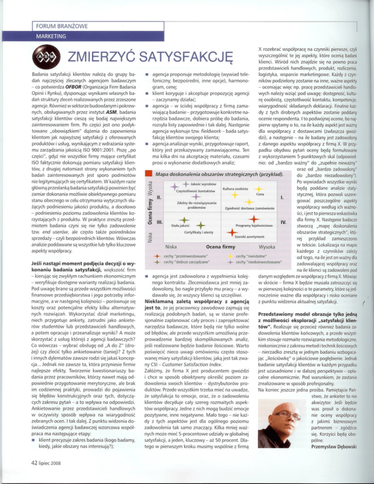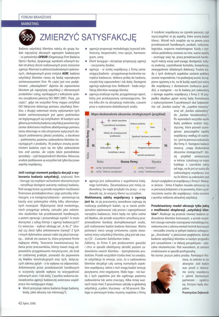 ~ X rozebrac wspólprace na czynniki pierwsze, czyli wyszczególnic te jej aspekty, które ocenia badani • ZMIERZYC SATYSFAKCJE Badania satysfakcji klientów naleza do grupy badan najczesciej zlecanych agencjom • agencja proponuje badawczym foniczny, bezposredni, - co potwierdza OFBOR (Organizacja Firm Badania Opinii i Rynku), dysponujac wynikami wlasnych baagencje. Równiez w sektorze budowlanym i pokrew- zainteresowaniem • produktów i uslug, wynikajacym z wdrazania syste- z firma zama- wiarygodnosc konkretne na- dy z tych drobnych aspektów zostanie poddany ocenie respondenta. Ito podwójnej ocenie, bo naj- dobiera próbe do badania, i tak dalej. Nastepnie fakcje klientów swojego klienta; dzi), a nastepnie - na ile badany jest zadowolony agencja analizuje wyniki, przygotowuje czesci", gdyz nie wszystkie firmy majace certyfikat ma kilka dni na akceptacje ISO faktycznie dokonuja pomiaru satysfakcji klien- prosi o wykonanie dodatkowych strony wykonaniem zainteresowanych jest sporo ++ Czestotliwosc glówna przeslanka badania satysfakcji powinien Certyfikaty byc i atesty Stala jakosc zamiar dokonania mozliwie obiektywnego rn >Zdolny S z wykorzystaniem I. O III IV. aspekty dla firmy X. Nastepnie badacze "mape doskonalenia obszarów strategicznych", któ- klientów. Wówczas rej Niska + + aspekty wspólpracy. Jesli nastapi moment podjecia decyzji o wy- Ocena firmy przyklad Wysoka kazdego cechy "przeinwestowane" + cechy "dobrze zarzadzane" zamieszczono w tekscie. Lokalizacja na mapie cechy"nieistotne" z czynników zalezy od tego, na ilejest on wazny dla cechy"niedoinwestowane" zadowalajacej wspólpracy oraz satysfakcji, wiekszosc firm - kierujac sie zwyklym rachunkiem ekonomicznym poszczególne stworza sa wszystkie lub tylko kluczowe konaniu badania analizie staty- sci, ijest to pierwsza wskazówka tzw. end userów, ale czesto takze posredników analizie poddawane poddane stycznej. która pozwol i uszeregowac czyni sie nie tylko zadowolenie sprzedazy - czyli bezposrednich niezadowolony"). wspólpracy wedlug ich wazno- C vQj do "bardzo beda ttI rzystajacych z produktu. W praktyce zreszta przed- S-punktowych skal (odpowied- Po wywiadach wszystkie wyniki ;;:: klientów ko- pytan oceny beda formulowane oraz od "bardzo zadowolony" (przyklad). E .. zacych podniesieniu jakosci produktu, a docelowo miotem badania padku obydwu do rozwiazywania >- II. (zwlaszcza gwoz- nio: od "bardzo wazny" do "zupelnie niewazny" analiz; + +: + + kontaktów O V1 stanu obecnego w celu otrzymania wytycznych slu- podniesieniu poziomu zadowolenia materialu, czasami z dostawcami z danego aspektu wspólpracy z firma X. W przy- lojalnosciowe Zgodnosc dostawa Programy /zamówienie Cena *eroki asortyment problemów Jakosc wyrobów Kultura osobista """ pomiaru Ten Mapa doskonalenia obszarów strategicznych • nie legitymujacych sie certyfikatem. W kazdym razie raport, zamawiajacemu. tych podmiotów pierw spytamy o to, na ile kazdy aspekt jest wazny dla wspólpracy który jest przekazywany badan skladanych deklaracji. Finalnie kaz- agencja wykonuje tzw. fieldwork - bada satys- mu zarzadzania jakoscia ISO 9001 :2001. Pisze "po tów, z drugiej natomiast wych nalezy wziac pod uwage: dostepnosc, kulture osobista, czestotliwosc kontaktu, kompetencje, rozsyla listy zapowiednie • Kazdy z czyn- ników podzielony zostanie na inne, wazne aspekty agencja - w scislej wspólpracy firm. Po czesci jest ono podyk- klientom jak najwyzszej satysfakcji z oferowanych produkt, rozliczenia, wiajaca badanie - przygotowuje rzedzia badawcze, dazenia do zapewnienia handlowych, logistyka, wsparcie marketingowe. - oceniajac wiec np. prace przedstawicieli handlopropozycje agencji - zaczynamy dzialac; przez instytut ASM, badania "obowiazkiem" inne opcje), harmono- klient koryguje i akceptuje satysfakcji klientów ciesza sie bodaj najwiekszym towane (wywiad tele- gram, cene; • dan struktury zlecen realizowanych przez zrzeszone nych, obslugiwanych metodologie klienci. Wsród nich znajdzie sie na pewno praca przedstawicieli na ile klienci sa zadowoleni pod kolej- danym wzgledem ze wspólpracy z firma X. Mówiac jest mniej za- w skrócie - firma X bedzie musiala zatroszczyc sie Pod uwage brane sa przede wszystkim mozliwosci dowolony, bo nagle przybylo mu pracy - a wy- w pierwszej kolejnosci o te parametry, które sa jed- finansowe dawalo sie, ze wszyscy klienci sa szczesliwi. - weryfikuje dostepne warianty realizacji badania. przedsiebiorstwa macyjne, a w nastepnej i jego potrzeby infor- kolejnosci - porównuje koszty oraz potencjalne sie efekty kilku alternatyw- nych rozwiazan. Wykorzystac niech przygotuje ankiety, zatrudni jako ankiete- lub przedstawicieli handlowych, rów studentów dzial marketingu, • agencja jest zadowolona nego kontraktu. Nieklamana z wypelnienia Zleceniodawca zaleta wspólpracy z agencja jest to, ze jej pracownicy zawodowo zajmuja sie realizacja podobnych badan, sjonalnie zaplanowac caly proces i zaprojektowac narzedzia które beda nie tylko wolne badawcze, noczesnie wazne dla wspólpracy i nisko oceniane z punktu widzenia aktualnej satysfakcji. sa w stanie profe- Przedstawiony model obrazuje tylko jedna z mozliwosci eksploracji "satysfakcji klientów". Realizuje sie przeciez równiez badania za- od bledów, ale przede wszystkim umozliwia prze- dowolenia skorzystac z uslug którejs z agencji badawczych? prowadzenie kim stosuje rozmaite rozwiazania metodologiczne, Co wówczas - wybrac obsluge od "A do Z" (dro- jesli realizowane zej) czy zlecic tylko ankietowanie poswiecic a potem opracuje i przeanalizuje wyniki? A moze (taniej)? Z tych bardziej skomplikowanych analiz, bedzie badanie ilosciowe. Warto nieco uwagi omówieniu - nierzadko zreszta w jednym badaniu wzbogacajac ..ilosciówke" o jakosciowe poglebienie. Jednak i innych dylematów zawsze rodzi sie jakas koncep- wanej miary satysfakcji klientów, jaka jest tak zwany CSI - najlepsze Zalózmy, ze firma X jest producentem kwestionariuszy ba- Customer Satisfaction Index. dani