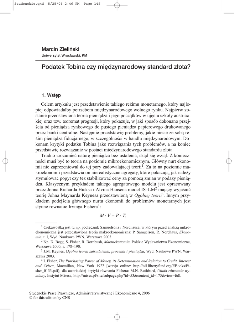 Studenckie.qxd 5/25/06 2:46 PM Page 149 Marcin Zieliñski Uniwersytet Wroc³awski, KM Podatek Tobina czy miêdzynarodowy standard z³ota? 1. Wstêp Celem artyku³u jest przedstawienie takiego re¿imu monetarnego, który najlepiej odpowiada³by potrzebom miêdzynarodowego wolnego rynku. Najpierw zostanie przedstawiona teoria pieni¹dza i jego pocz¹tków w ujêciu szko³y austriackiej oraz tzw. teoremat progresji, który pokazuje, w jaki sposób dokonano przejcia od pieni¹dza rynkowego do pustego pieni¹dza papierowego drukowanego przez banki centralne. Nastêpnie przedstawiê problemy, jakie niesie ze sob¹ re¿im pieni¹dza fiducjarnego, w szczególnoci w handlu miêdzynarodowym. Dokonam krytyki podatku Tobina jako rozwi¹zania tych problemów, a na koniec przedstawiê rozwi¹zanie w postaci miêdzynarodowego standardu z³ota. Trudno zrozumieæ naturê pieni¹dza bez ustalenia, sk¹d siê wzi¹³. Z koniecznoci musi byæ to teoria na poziomie mikroekonomicznym. G³ówny nurt ekonomii nie zaprezentowa³ do tej pory zadowalaj¹cej teorii1. Za to na poziomie makroekonomii przedstawia on nierealistyczne agregaty, które pokazuj¹, jak nale¿y stymulowaæ popyt czy te¿ stabilizowaæ ceny za pomoc¹ zmian w poda¿y pieni¹dza. Klasycznym przyk³adem takiego agregatowego modelu jest opracowany przez Johna Richarda Hicksa i Alvina Hansena model ISLM2 maj¹cy wyjaniæ teoriê Johna Maynarda Keynesa przedstawion¹ w Ogólnej teorii3. Innym przyk³adem podejcia g³ównego nurtu ekonomii do problemów monetarnych jest s³ynne równanie Irvinga Fishera4: M ⋅ V = P ⋅ T, 1 Ciekawostk¹ jest tu np. podrêcznik Samuelsona i Nordhausa, w którym przed analiz¹ mikroekonomiczn¹ jest przedstawiona teoria makroekonomiczna: P. Samuelson, R. Nordhaus, Ekonomia, t. I, Wyd. Naukowe PWN, Warszawa 2003. 2 Np. D. Begg, S. Fisher, R. Dornbush, Makroekonomia, Polskie Wydawnictwo Ekonomiczne, Warszawa 2000, s. 178190. 3 J.M. Keynes, Ogólna teoria zatrudnienia, procentu i pieni¹dza, Wyd. Naukowe PWN, Warszawa 2003. 4 I. Fisher, The Purchasing Power of Money, its Determination and Relation to Credit, Interest and Crises, Macmillan, New York 1922 [wersja online: http://oll.libertyfund.org/EBooks/Fisher_0133.pdf]; dla austriackiej krytyki równania Fishera: M.N. Rothbard, U³uda równania wymiany, Instytut Misesa, http://mises.pl/site/subpage.php?id=53&content_id=175&view=full. Studenckie Prace Prawnicze, Administratywistyczne i Ekonomiczne 4, 2006 © for this edition by CNS Studenckie.qxd 5/25/06 2:46 PM 150 | Page 150 MARCIN ZIELIÑSKI gdzie: M iloæ pieni¹dza, V prêdkoæ, z jak¹ pieni¹dz jest wydawany na wszystkie transakcje pieniê¿ne (transakcyjna szybkoæ pieni¹dza), P cena transakcji, T ogólna liczba transakcji (realnych i finansowych). Z tego równania wynika jedynie, ¿e kwota wydanych pieniêdzy jest równa otrzymanej. Tym, co ró¿ni Fishera i jego ideowych nastêpców, np. Miltona Friedmana i innych monetarystów, od keynesistów jest tylko i wy³¹cznie to, ¿e zamiast stymulowaæ popyt, chc¹ oni stabilizowaæ ceny. Jednak jedni i drudzy dostarczaj¹ jedynie intelektualnej przykrywki do drukowania przez rz¹dy czy te¿ banki centralne pustego pieni¹dza papierowego. Austriacy, dla odmiany, ca³¹ swoj¹ analizê ekonomiczn¹ opieraj¹ na metodologicznym indywidualizmie i aksjomacie dzia³ania, a ca³¹ swoj¹ teoriê buduj¹ od poziomu mikro5. Podobnie jest z austriack¹ teori¹ pieni¹dza, po raz pierwszy przedstawion¹ przez Carla Mengera6, a póniej rozwiniêt¹ przez Ludwiga von Misesa7 i Murraya Newtona Rothbarda8. 2. Pocz¹tki pieni¹dza Bêd¹c sam na wyspie, Robinson Crusoe nie potrzebowa³ pieniêdzy, nie potrzebowa³ te¿ ich, gdy na wyspê przyby³ Piêtaszek. Pieni¹dz pojawia siê, gdy gospodarka sk³ada siê z wiêkszej liczby podmiotów. Jednak ¿eby zrozumieæ naturê pieni¹dza, musimy cofn¹æ siê jeszcze bardziej i zastanowiæ siê nad faktem, dlaczego ludzie w ogóle dokonuj¹ wymiany. Wymiana to umowa miêdzy osobami A i B dotycz¹ca przejêcia towarów lub skorzystania z us³ug oferowanych przez jedn¹ osobê w zamian za towary i us³ugi oferowane przez drug¹9. Do dobrowolnej wymiany dochodzi tylko wtedy, gdy obie jej strony spodziewaj¹ siê na niej skorzystaæ. Ka¿da ze stron wymiany wy5 O metodologii szko³y austriackiej: H.H. Hoppe, Economic Science and the Austrian Method, Ludwig von Mises Institute, Auburn, Alabama 1995; M.N. Rothbard, Prakseologia: metodologia Szko³y Austriackiej, Instytut Misesa, http://mises.pl/site/subpage.php?id=40&content_id=235&view =full; M. Machaj, W obronie austriackiej metody, Instytut Misesa, http://mises.pl/pliki/upload/w%20obronie%20austriackiej%20metody.pdf 6 Zob. C. Menger, Principles of Economics, roz. VIII, New York University Press, New YorkLondon 1981 [wersja online: http://www.mises.org/etexts/menger/Mengerprinciples.pdf]; C. Menger, On the Origins of Money, Economic Journal, czerwiec 1892 [wersja online: http://socserv.mcmaster.ca/econ/ugcm/3ll3/menger/money.txt]. 7 Np. L. von Mises, Theory of Money and Credit, Liberty Fund, Indianapolis, 1981 [wersja online: http://oll.libertyfund.org/EBooks/Mises_0070.pdf]; L. von Mises, Human Action: A Treatise on Economics, Contemporary Books, Chicago 1966. 8 Np. M.N. Rothbard, Man, Economy, and State with Power and Market, Ludwig von Mises Institute, Auburn, Alabama 2004 [wersja online: http://www.mises.org/rothbard/mespm.pdf]; M.N. Rothbard, Z³oto, banki, ludzie krótka historia pieni¹dza, Fijorr Publishing, WarszawaChicago 2004. 9 M.N. Rothbard, Z³oto..., s. 31. Studenckie Prace Prawnicze, Administratywistyczne i Ekonomiczne 4, 2006 © for this edition by CNS Studenckie.qxd 5/25/06 2:46 PM Page 151 PODATEK TOBINA CZY MIÊDZYNARODOWY STANDARD Z£OTA? | 151 ¿ej wartociuje to dobro, które otrzymuje, ni¿ to, które oddaje w zamian (wystêpuje podwójnie przeciwne wartociowanie). Kiedy Crusoe wymienia z Piêtaszkiem pewn¹ liczbê kokosów na pewn¹ liczbê pomarañczy, to oznacza