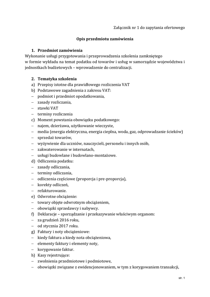 Załączniknr1dozapytaniaofertowego Opisprzedmiotuzamówienia 1. Przedmiotzamówienia Wykonanieusługiprzygotowaniaiprzeprowadzeniaszkoleniazamkniętego wformiewykładunatematpodatkuodtowarówiusługwsamorządziewojewództwai jednostkachbudżetowych–wprowadzeniedocentralizacji. 2. Tematykaszkolenia a) PrzepisyistotnedlaprawidłowegorozliczeniaVAT b) PodstawowezagadnieniazzakresuVAT: podmiotiprzedmiotopodatkowania, zasadyrozliczania, stawkiVAT terminyrozliczenia c) Momentpowstaniaobowiązkupodatkowego: najem,dzierżawa,użytkowaniewieczyste, media(energiaelektryczna,energiacieplna,woda,gaz,odprowadzanieścieków) sprzedażtowarów, wyżywieniedlauczniów,nauczycieli,personeluiinnychosób, zakwaterowaniewinternatach, usługibudowlaneibudowlano‐montażowe. d) Odliczeniapodatku: zasadyodliczania, terminyodliczania, odliczeniaczęściowe(proporcjaipre‐proporcja), korektyodliczeń, refakturowanie. e) Odwrotneobciążenie: towaryobjęteodwrotnymobciążeniem, obowiązkisprzedawcyinabywcy. f) Deklaracje–sporządzanieiprzekazywaniewłaściwymorganom: zagrudzień2016roku, odstycznia2017roku. g) Fakturyinotyobciążeniowe: kiedyfakturaakiedynotaobciążeniowa, elementyfakturyielementynoty, korygowaniefaktur. h) Kasyrejestrujące: zwolnieniaprzedmiotoweipodmiotowe, obowiązkizwiązanezewidencjonowaniem,wtymzkorygowaniemtransakcji, str. 1 i) Jednolity Plik Kontrolny w jednostce samorządu terytorialnego i jednostkach budżetowych j) Ewidencja dochodów i wydatków budżetowych, przychodów i kosztów z należnyminaliczonympodatkiemVAT. k) Paneldyskusyjny 3. Miejsceszkolenia SalaszkoleniowawOlsztynie 4. Terminszkolenia Od23.11.2016rokudo07.12.2016roku(dnirobocze) 5. Czasszkolenia 1 dzień szkolenia w formie wykładu od godziny 9.00 do godziny 15.30 z przerwami 11.00‐11.15i13.00‐13.30 6. Liczbauczestnikówszkolenia Maksymalnie57osób,niemniejniż54osoby. 7. Warunkilokalowe Wykonawcazapewnimiejsceszkolenia,wktórymznajdujesię: a) salaszkoleniowa, b) bezpłatnatoaleta. 8. Usługagastronomiczna Wykonawca zapewni usługę gastronomiczną na miejscu, podczas szkolenia składającą sięz: a) serwisukawowego(kawa,herbata,mlekoświeże,cytryna,wodamineralna,sok, ciastka), z którego można będzie korzystać podczas całego szkolenia bezpośredniowsaliszkoleniowejlubprzedsalą, b) lunchuwformieciepłegoposiłku,podanegopodczasprzerwy13.00‐13.30. 9. Obowiązkiwykonawcyszkolenia a) zapewnienie minimum jednego trenera posiadającego doświadczenie zgodnie z rozdziałemVpkt.4zapytaniaofertowego, b) przygotowaniemateriałówszkoleniowychopracowanychwformiepapierowej, c) przygotowaniemateriałówdosporządzenianotatek(długopis,kartkinanotatki), d) przygotowanielistyobecności. 10. Rozliczenieszkolenia Potwierdzeniem należytego wykonania przedmiotu umowy będzie protokół odbioru podpisany przez Zamawiającego bez zastrzeżeń wraz z listą obecności, który stanowić będziepodstawędoprawidłowegowystawieniafakturyVAT. str. 2 11. Personeldoobsługi a) Wykonawca wskaże osobę do kontaktów roboczych między Wykonawcą i Zamawiającym. Przy realizacji zamówienia Zamawiający dopuszcza możliwość porozumiewaniasięzWykonawcądrogąmailowąitelefoniczną. b) W trakcie realizacji przedmiotu zamówienia Wykonawca będzie na bieżąco współpracował z Zamawiającym. Wykonawca wyznaczy jedną osobę do ogólnej koordynacji realizacji przedmiotu zamówienia, która będzie współpracowała z osobamiwskazanymiprzezZamawiającego. str. 3