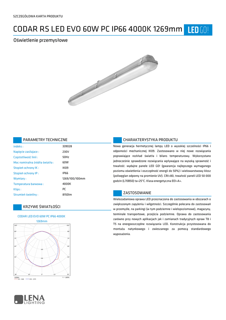 SZCZEGÓŁOWA KARTA PRODUKTU CODAR RS LED EVO 60W PC IP66 4000K 1269mm Oświetlenie przemysłowe PARAMETRY TECHNICZNE CHARAKTERYSTYKA PRODUKTU indeks : 339028 Nowa generacja hermetycznej lampy LED o wysokiej szczelności IP66 i Napięcie zasilajace : 230V odporności mechanicznej IK09. Zastosowano w niej nowe rozwiązania Częstotliwość linii : 50Hz poprawiające rozkład światła i bilans temperaturowy. Wykorzystano Moc nominalna źródła światła : 60W jednocześnie sprawdzone rozwiązania wpływające na wysoką sprawność i Stopień ochrony IK : IK09 Stopień ochrony IP : IP66 Wymiary : 1269/100/100mm Temperatura barwowa : 4000K Klips : PC Strumień świetlny : 8150lm trwałość: wydajne panele LED GO! (gwarancja najlepszego wymaganego poziomu oświetlenia i oszczędność energii do 50%) i wielowarstwowy klosz (poliwęglan odporny na promienie UV). CRI>80, trwałość paneli LED 50 000 godzin (L70B50) ta=25ºC. Klasa energetyczna EEI=A+. ZASTOSOWANIE Wielozadaniowa oprawa LED przeznaczona do zastosowania w obszarach o KRZYWE ŚWIATŁOŚCI CODAR LED EVO 60W PC IP66 4000K 1269mm zwiększonym zapyleniu i wilgotności. Szczególnie polecana do zastosowań w przemyśle, na parkingi (w tym podziemne i wielopoziomowe), magazyny, terminale transportowe, przejścia podziemne. Oprawa do zastosowania zarówno przy nowych aplikacjach jak i zamianach tradycyjnych opraw T8 i T5 na energooszczędne rozwiązania LED. Konstrukcja przystosowana do montażu natynkowego wyposażenia. i zwieszanego za pomocą standardowego SZCZEGÓŁOWA KARTA PRODUKTU CODAR RS LED EVO 60W PC IP66 4000K 1269mm Oświetlenie przemysłowe TABELA PARAMETRÓW TECHNICZNYCH indeks: 339028 Napięcie zasilajace: 230V Częstotliwość linii: 50Hz Nominalny kąt promieniowania: 120° Znamionowy kąt promieniowania: 120° Źródło światła: LED GO! Moc nominalna źródła światła: 60W Liczba sztuk w opakowaniu Stopień ochrony IK: IK09 zbiorczym: Stopień ochrony IP: IP66 Liczba opakowań w kartonie Skuteczność świetlna: 136lm/W Klasa energetyczna: A+ zbiorczym: 1szt 120 Źródło światła wymienne: Nie Klasa ochrony: I Wymiary: 1269/100/100mm Waga: 2,1kg Materiał korpusu: PC Temperatura barwowa: 4000K Natynkowy/sufitowy (N); zwieszany Sposób montażu: (Z) (zestaw montażowy nie zawiera zawiesia) Klips: PC Strumień świetlny: 8150lm Moc znamionowa oprawy: 60,6W Współczynnik mocy lampy: 0,9 Kod EAN: 5905963339028 Materiał klosza: PC Rodzaj klosza: MAT Nominalny okres trwałości lampy: 50 000 h Znamionowa trwałość lampy: 50 000 h Współczynnik zachowania strumienia świetlnego na zakończenie nominalnego okresu 0,8 trwałości: Awaryjność 5000h: ≤1% Liczba cykli włącz / wyłącz poprzedzająca przedwczesny koniec 25000 eksploatacji: Czas nagrzewania się lampy do 60% pełnego strumienia świetlnego: pomijalny Współpraca z ściemniaczami: Brak możliwości ściemniania Do zastosowań zewnętrznych: Tak Rozkład widmowy mocy: (0,38; 0,38) Oddawanie barw: Ra>80 Jednolitość barwy: (0,38; 0,38) Data aktualizacji karty: 2016-09-28 37/2015 www.lenalighting.pl | Strona 2